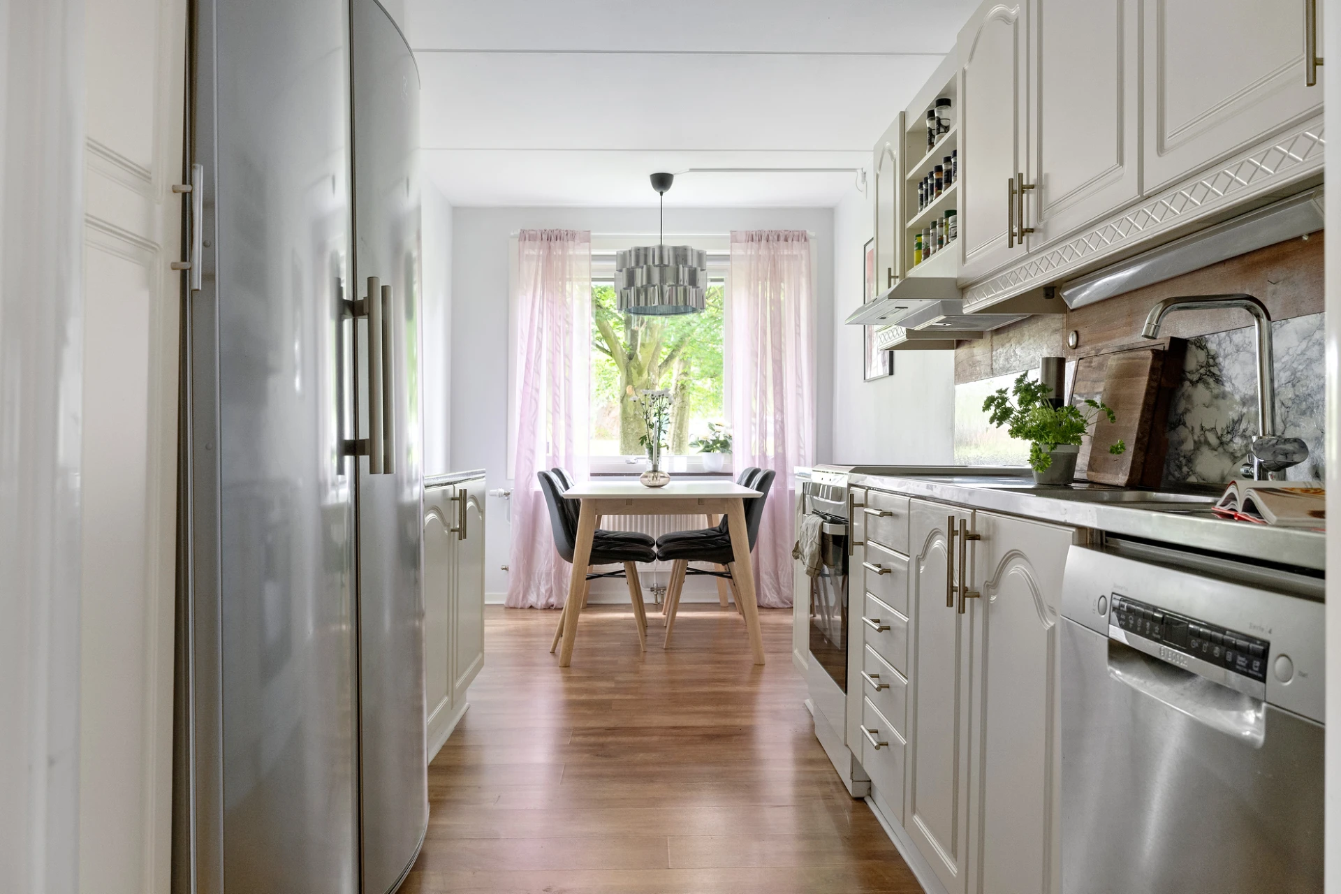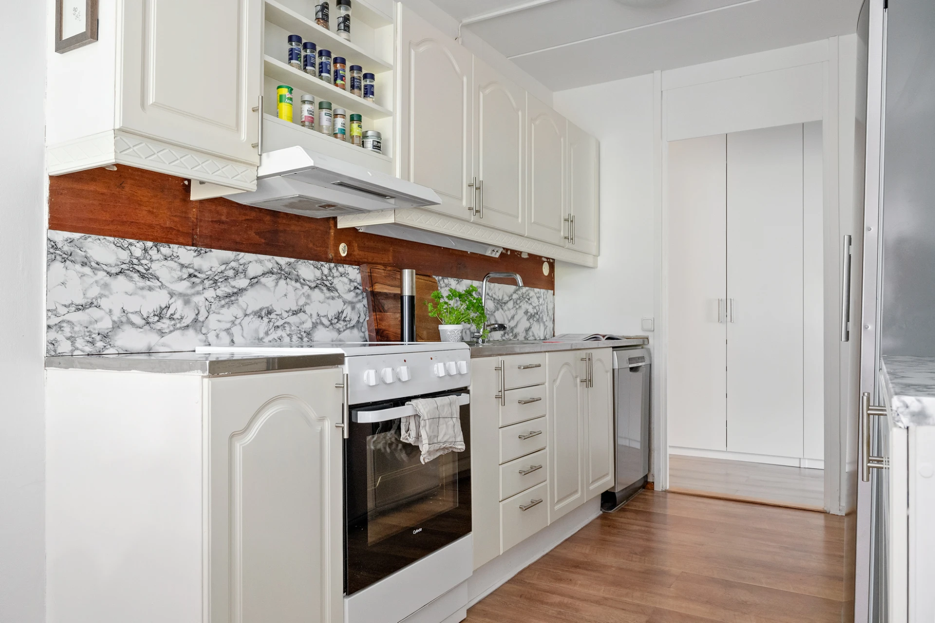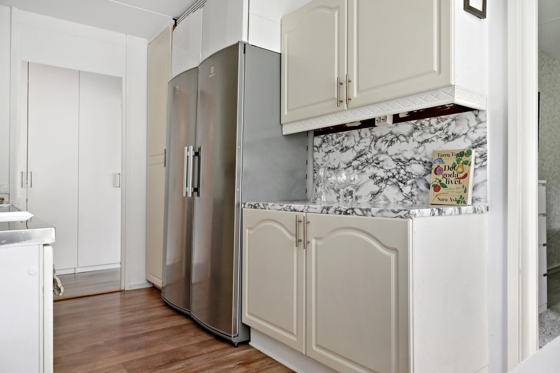 Ljust och fräscht kök i beige design med gott om arbetsyta och förvaring samt kyl och frys i fullhöjd. Generöst med plats för matbord med 4–6 sittplatser vilket gör köket till en naturlig samlingsplats för både vardag och umgänge. Köket är utrustat med kyl och frys (2024), ugn (2020), fläkt (2022) och spis (2020).