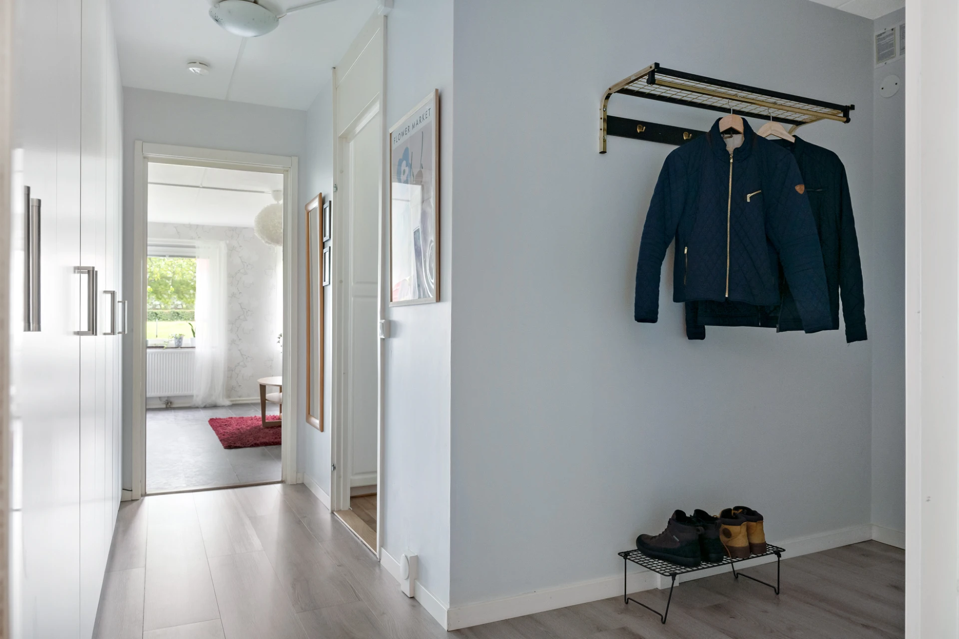 En ljus och inbjudande hall där funktion möter stil! Till vänster finns en praktisk garderobslösning med gott om förvaring för både skor och ytterkläder. På höger sida erbjuds smidig avhängningsmöjlighet, perfekt placerad intill badrummet för enkel åtkomst i vardagen