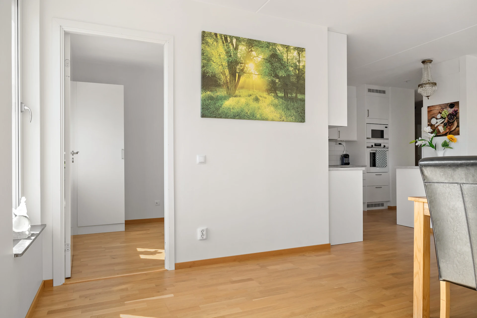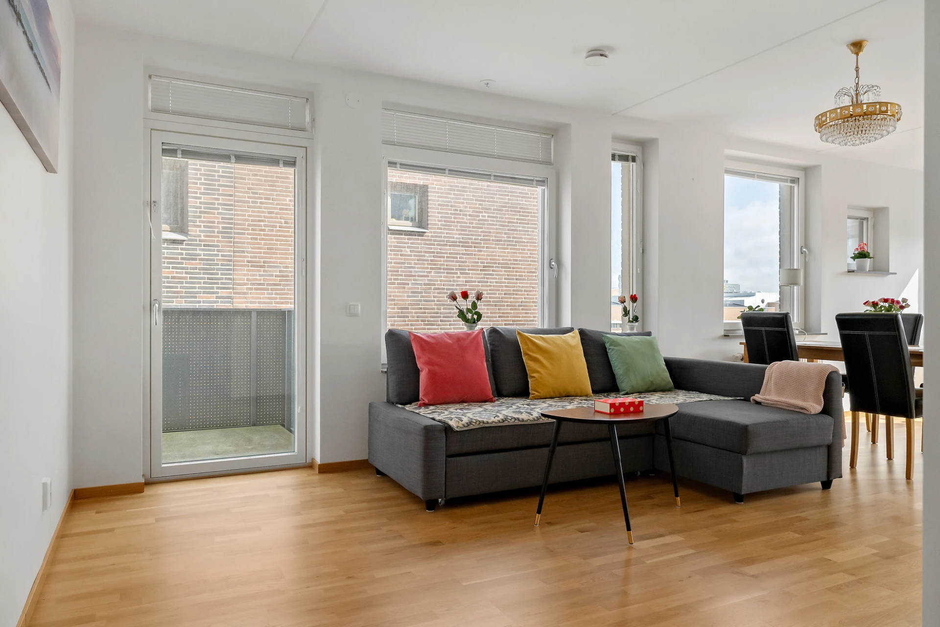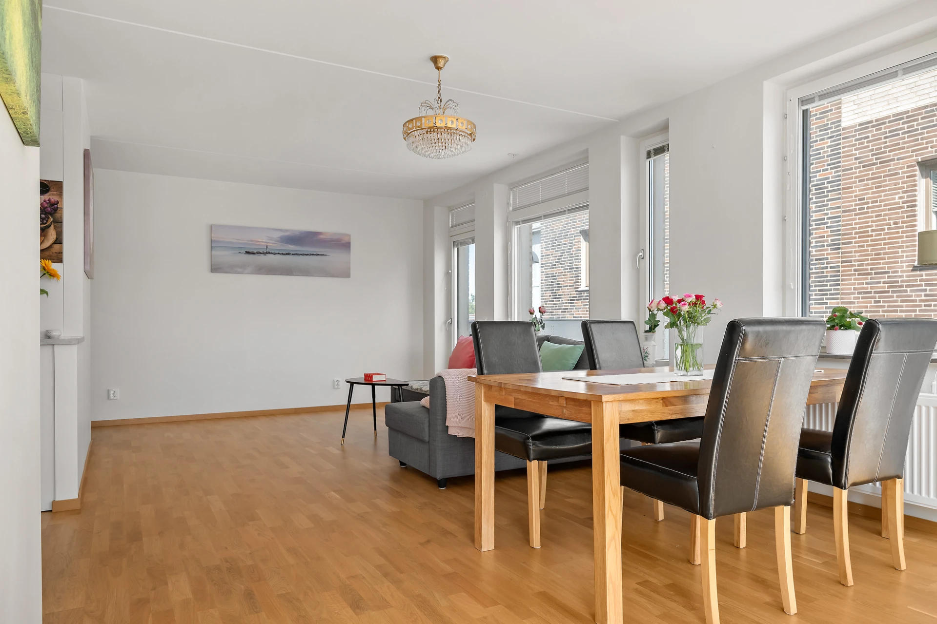 Parkettgolv och vita väggar. Rymmer soffgrupp och större matplats. Utgång till balkong i nordväst.
