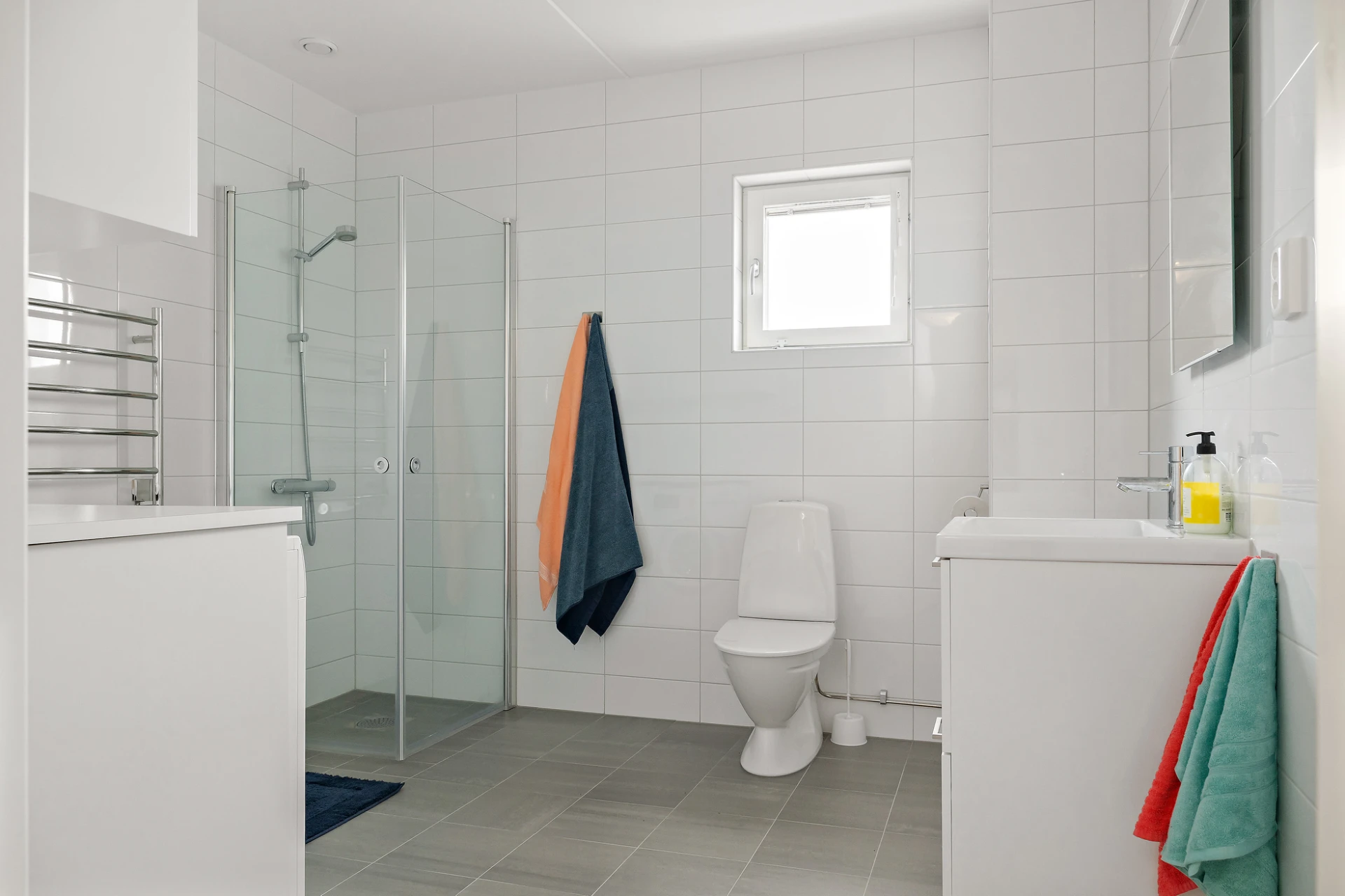 Ljusgrå klinker och vitt kakel. Badrummet är inrett med wc, handfat med vit kommod, spegel, dusch med vikbara glasväggar, handdukstork, förvaringsskåp ovan arbetsbänk samt tvättmaskin och torktumlare. Ljusbringande fönster.