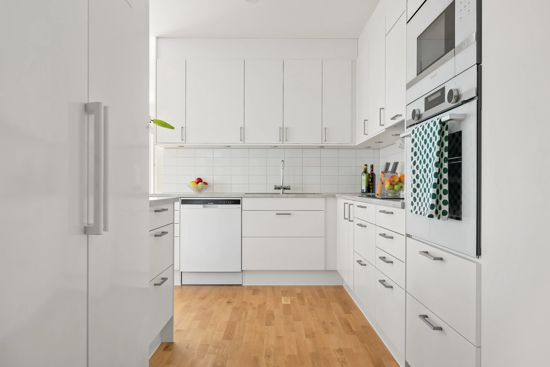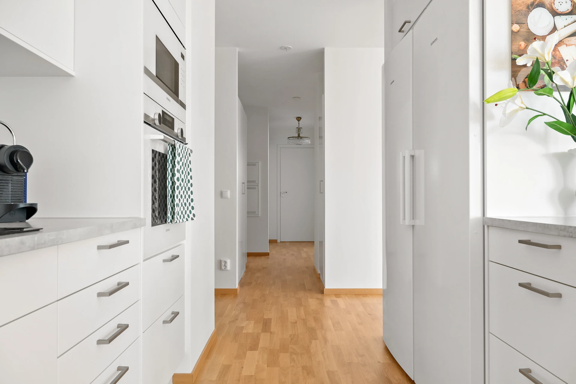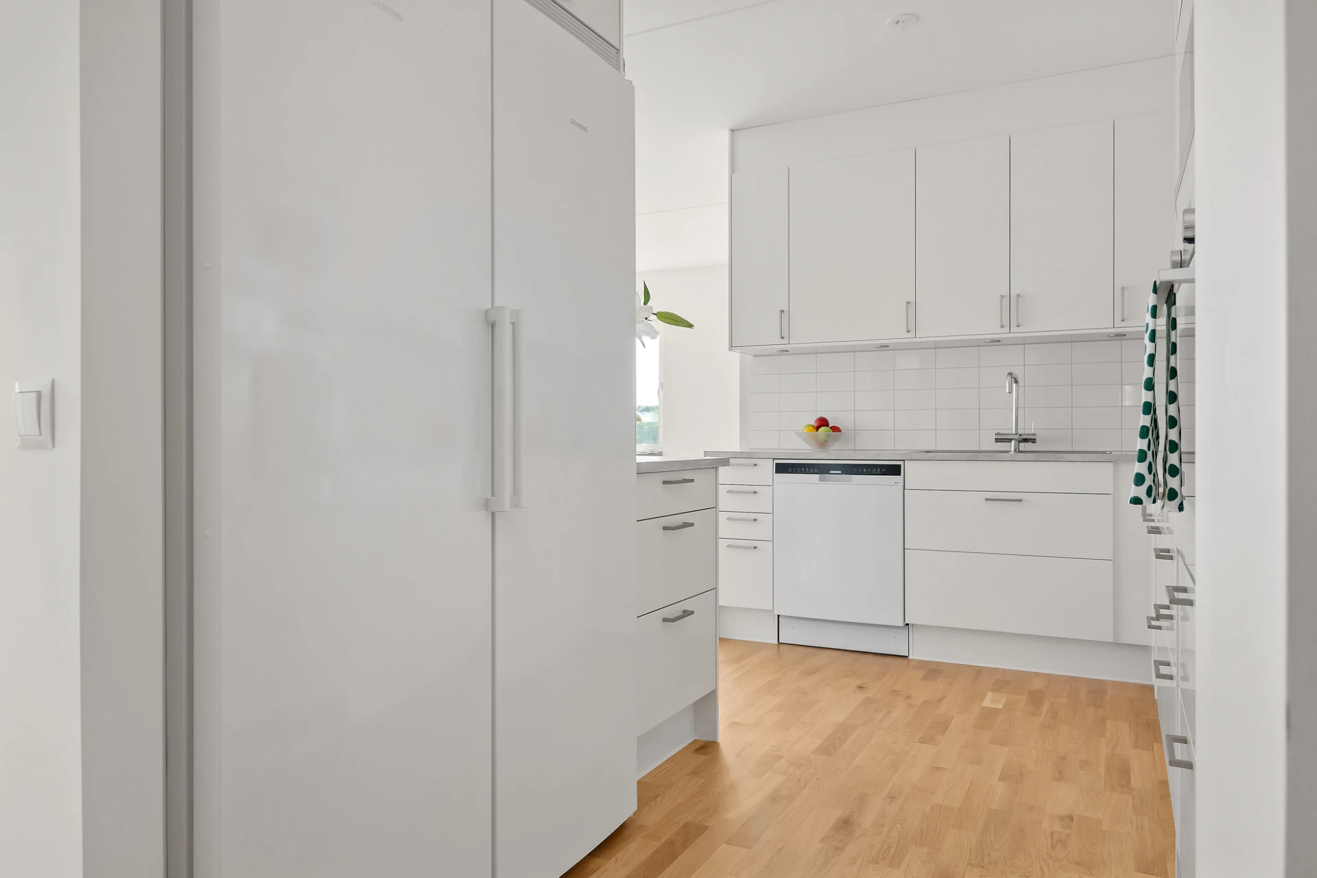 Parkettgolv och vita väggar. Vit köksinredning och vitt kakel ovan ljus marmorerad bänkskiva. Köket är utrustat med keramisk häll, fläkt, inbyggd ugn, inbyggd mikrovågsugn, diskmaskin samt kyl och frys i fullhöjd. Infällda spotlights ovan bänk.