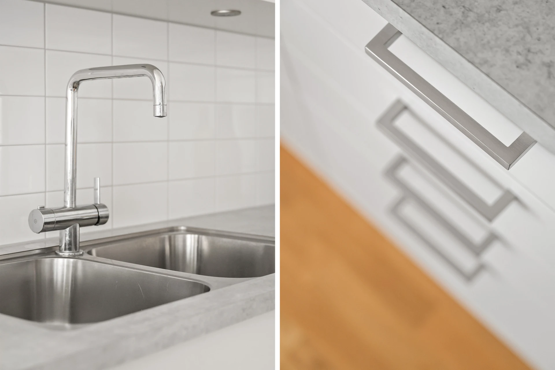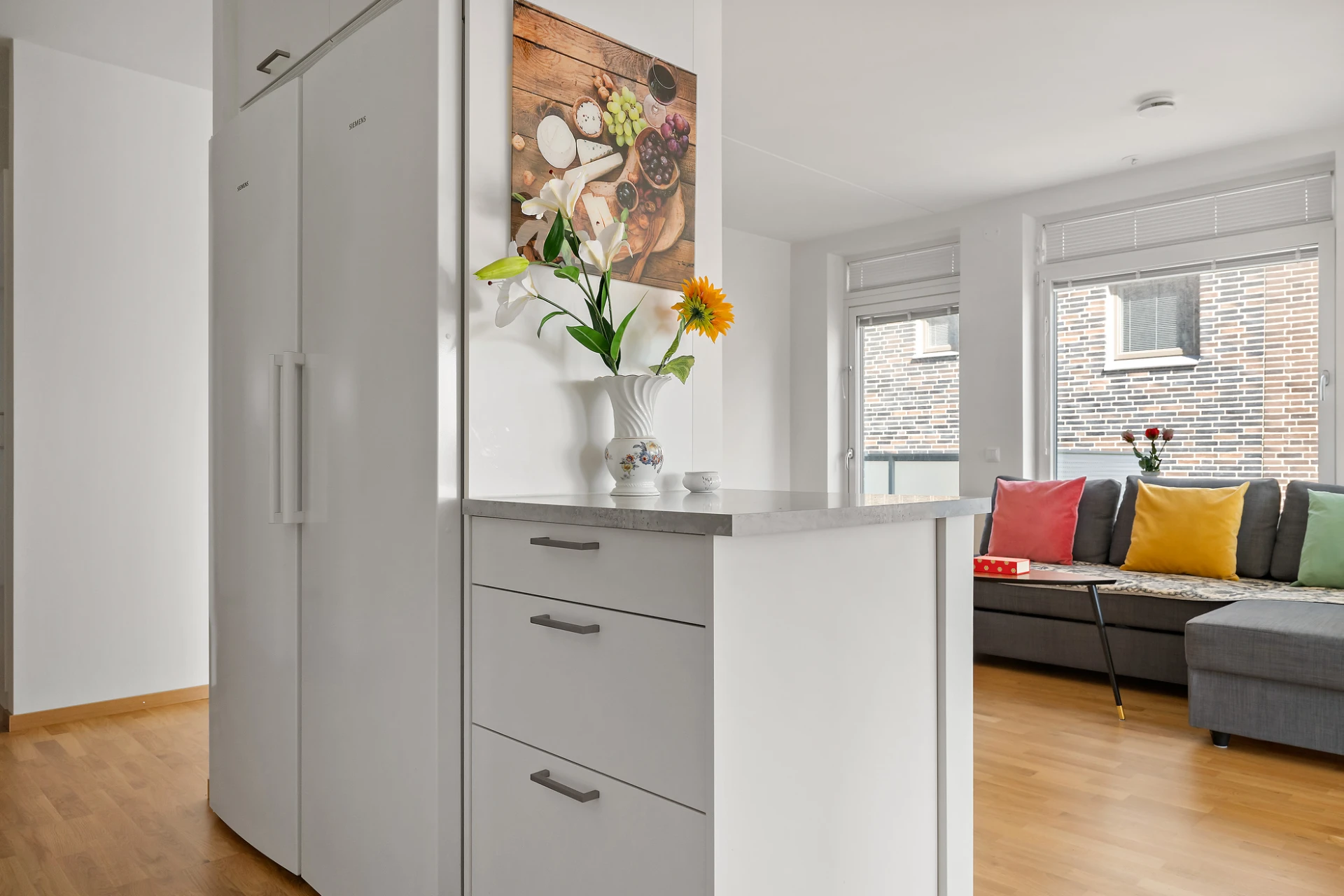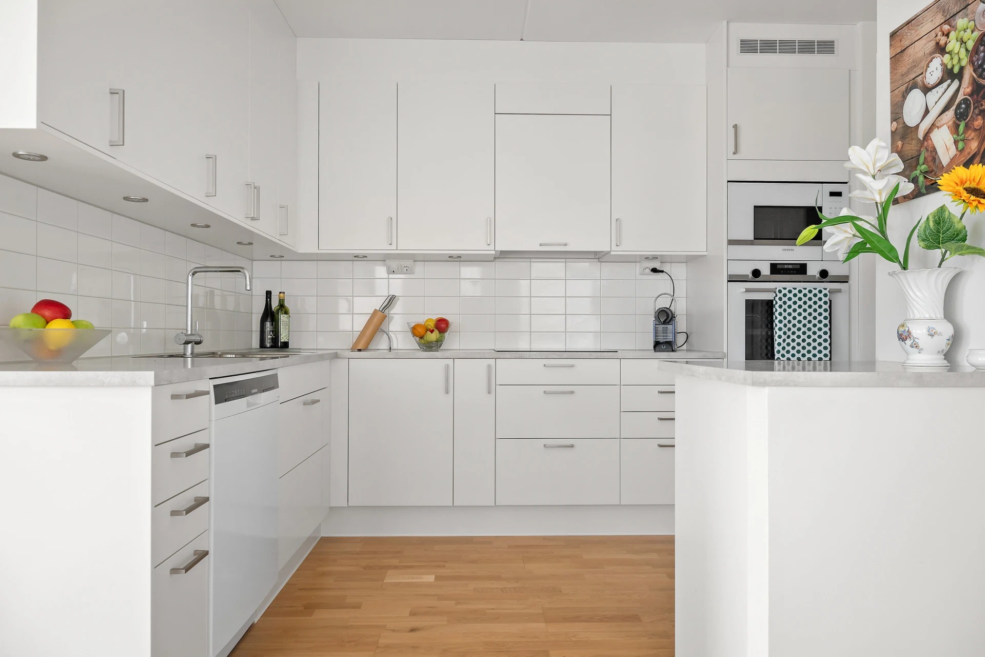 Parkettgolv och vita väggar. Vit köksinredning och vitt kakel ovan ljus marmorerad bänkskiva. Köket är utrustat med keramisk häll, fläkt, inbyggd ugn, inbyggd mikrovågsugn, diskmaskin samt kyl och frys i fullhöjd. Infällda spotlights ovan bänk.