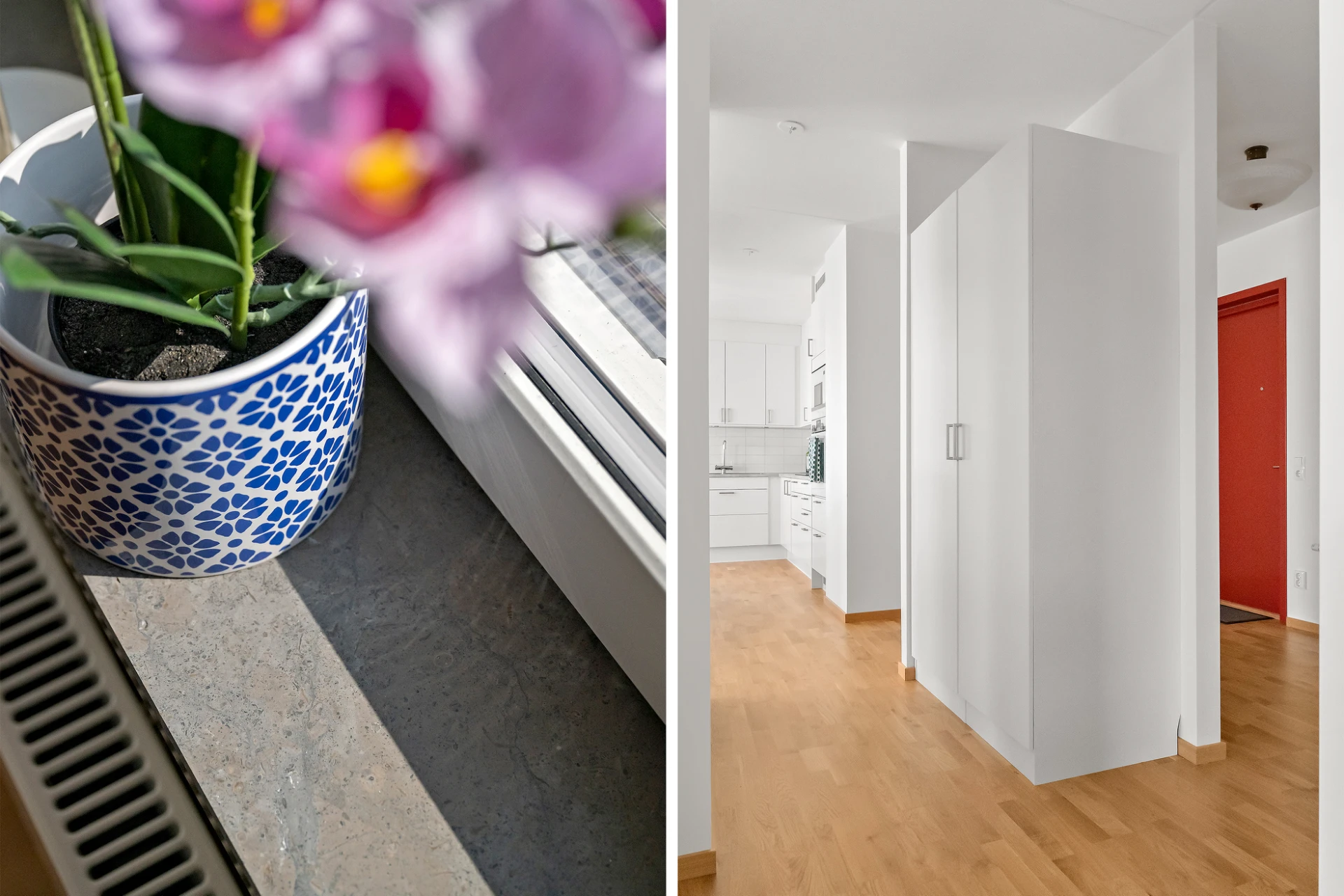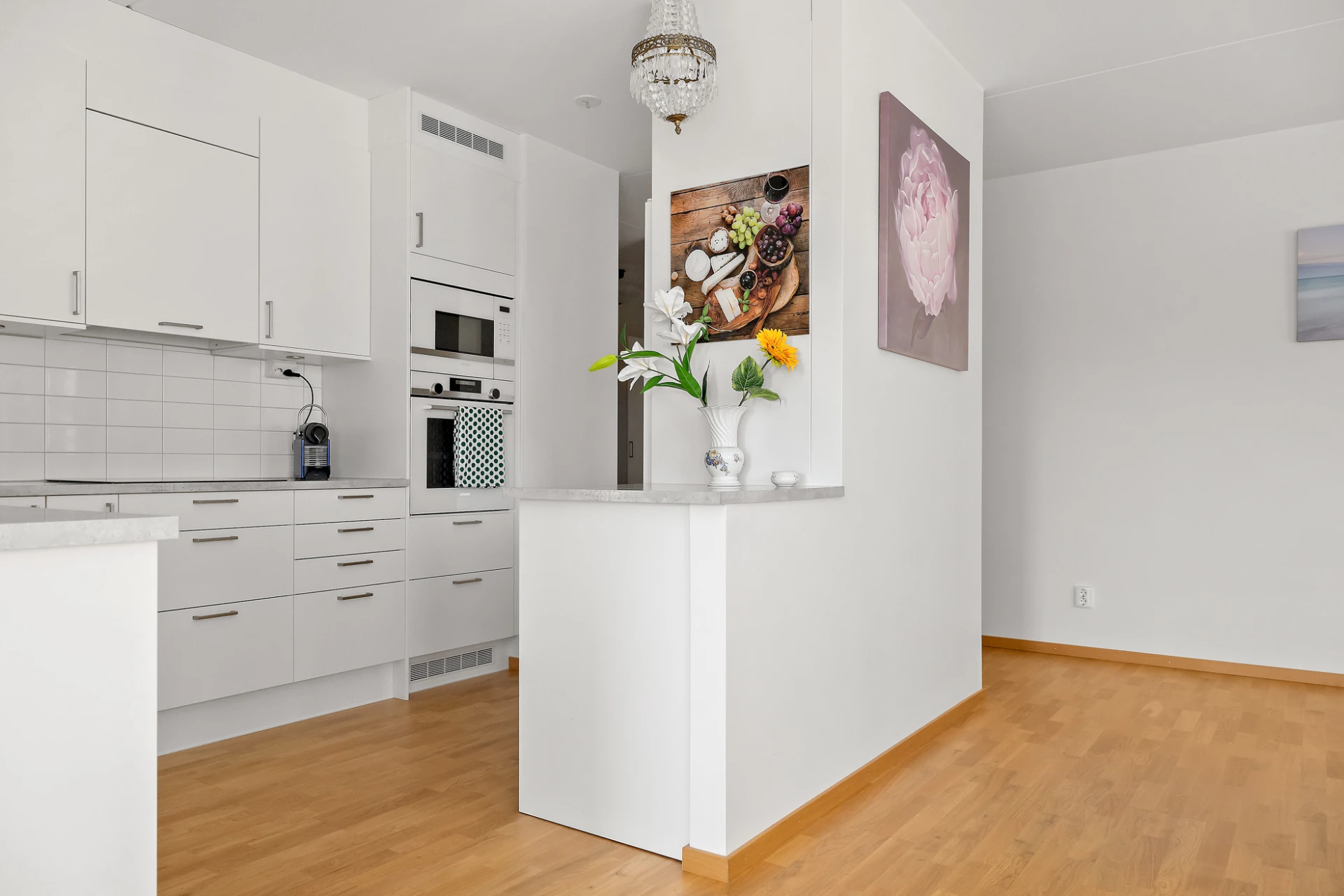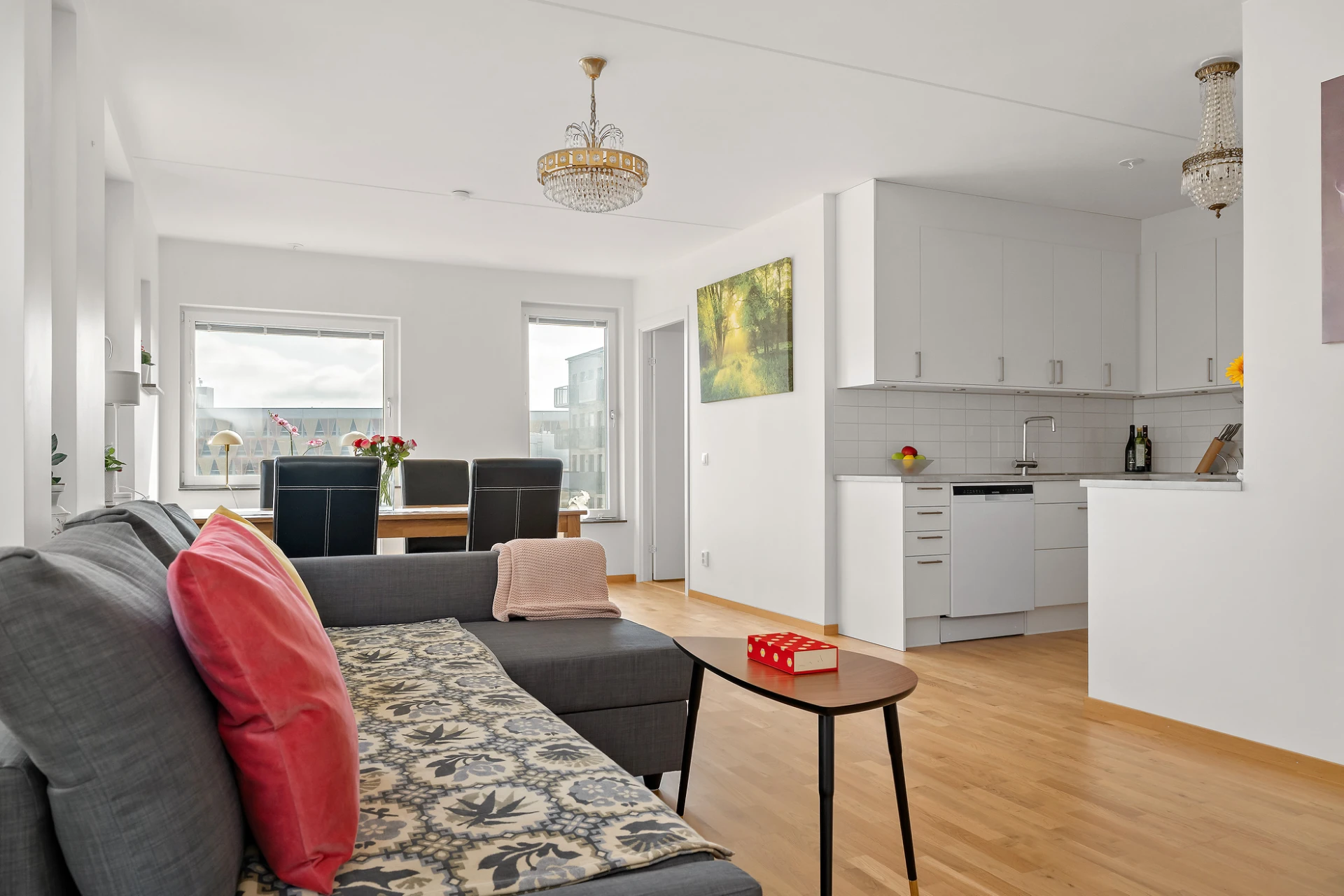 Välkomna till ett hem som överraskar och imponerar – en underbar fyrarummare med dubbla balkonger och ett genomgående ljusflöde från hela tre väderstreck som skapar en otroligt rymd. Högt upp i huset, med hiss hela vägen upp, bor vi på ett lugnt och upphöjt läge med utsikt över omgivningen. Bostadens hjärta består av en öppen yta med vardagsrum, kök och matplats i ett - omgivet av asymmetriska fönster som skapar karaktär. Helt enkelt den självklara samlingsplatsen där vi gärna bjuder in till härliga stunder med nära och kära. Det genomgående köket går i tidlöst vitt och bjuder på full utrustning om delvis inbyggda vitvaror samt kyl och frys i fullhöjd - en fröjd för den matlagningsglade. Från vardagsrummet når vi en av bostadens två balkonger och den andra balkongen, i sydväst, nås från master bedroom lugnt beläget mot gården. Som om det inte vore nog har vi här ytterligare två sovrum, både badrum med tvättutrustning och gäst-wc i ljusa utföranden och lyxen om fönster. Lägg därtill kompletta ljusa ytskikt i sampel med klassisk parkett som utgör den perfekta basen att sätta vår egen prägel!