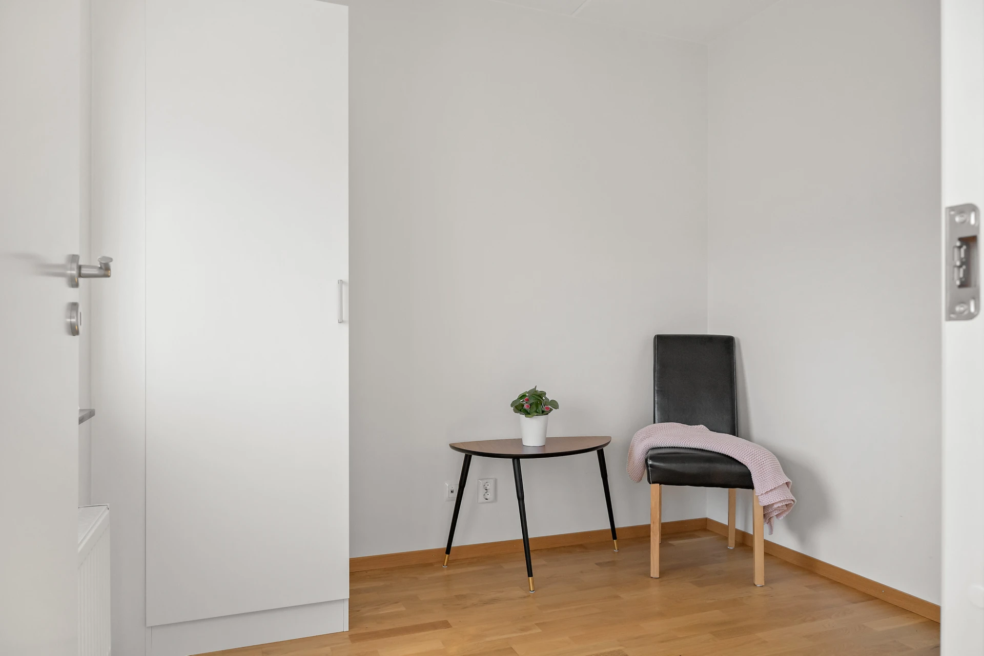 Parkettgolv och vita väggar. Rymmer enkelsäng.