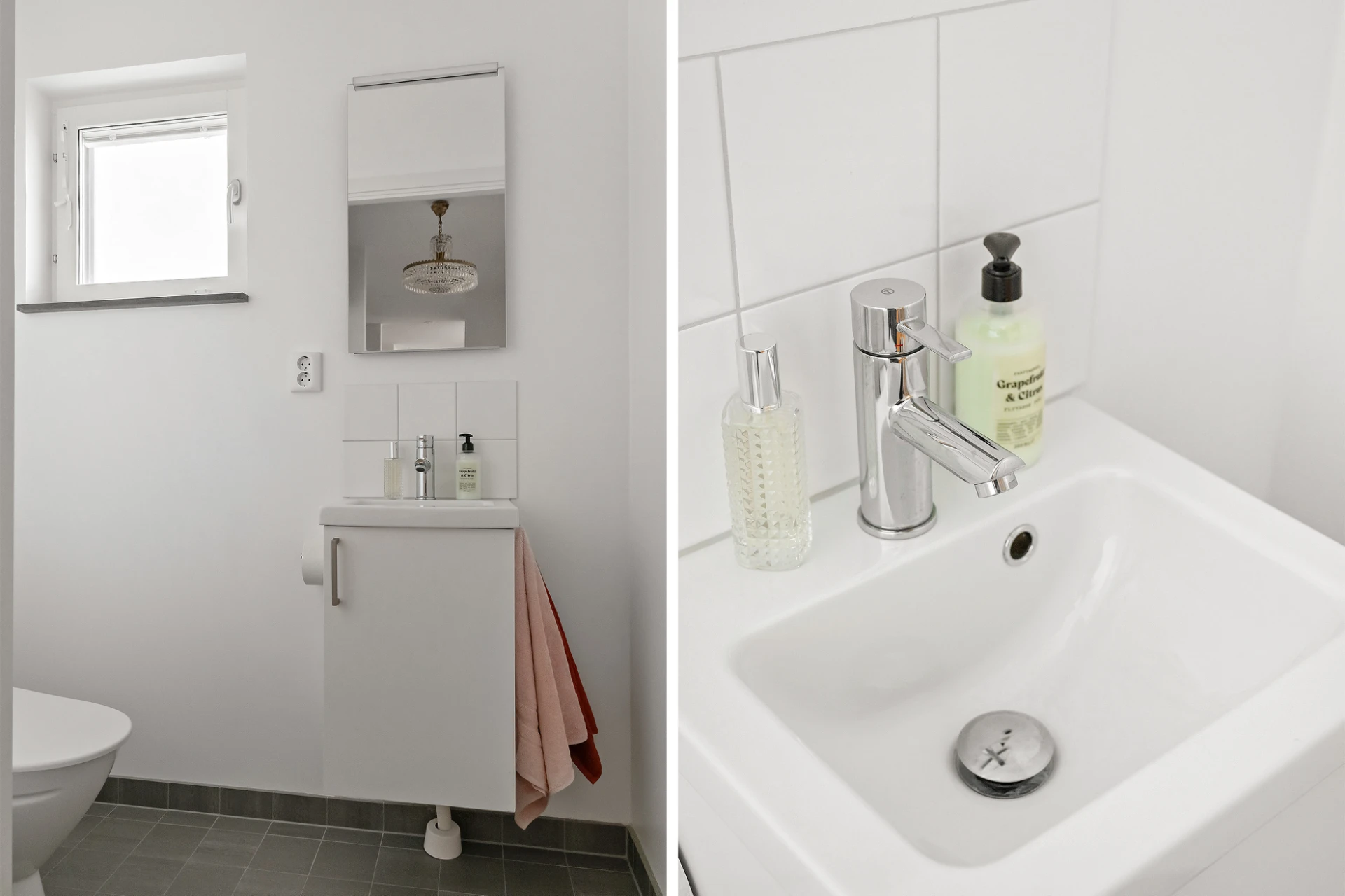Grå klinker och vitt kakel samt vita väggar. Inrett med wc, handfat med vit kommod och spegel. Ljusbringande fönster.