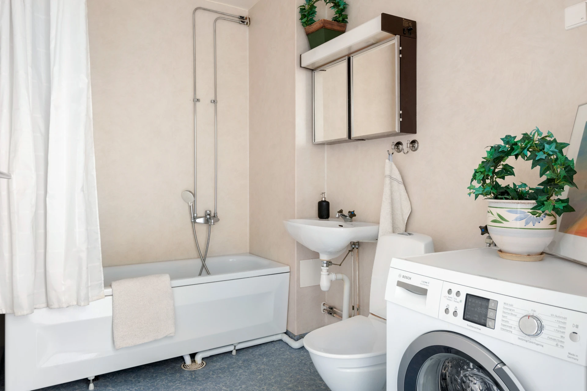 Grå/blå våtrumsmatta och beige våtrumstapet. Badrummet är inrett med wc, handfat, spegelskåp, badkar och tvättmaskin.