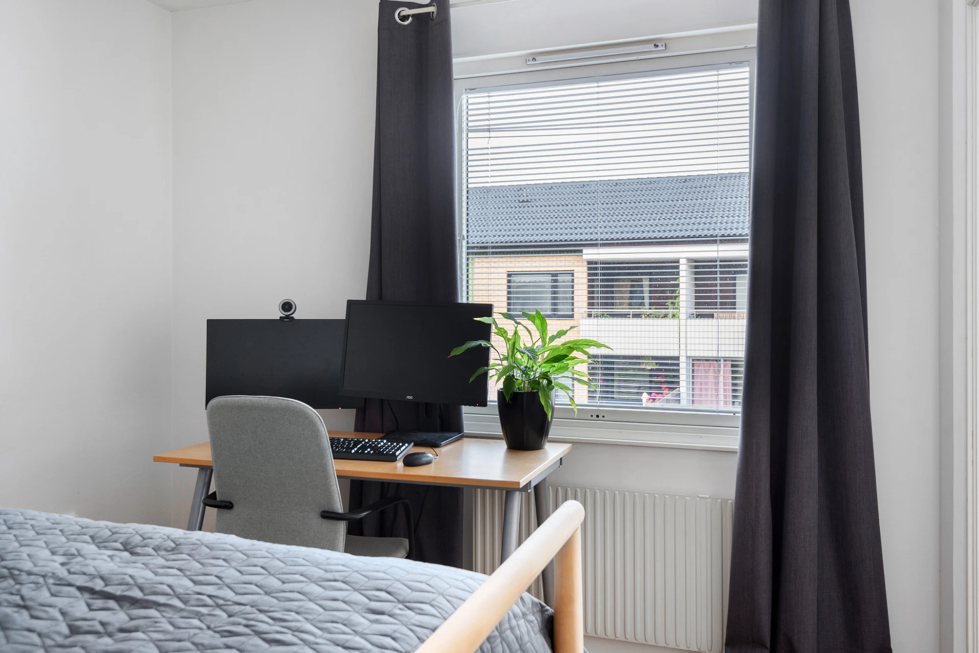 Ekparkett och vita väggar. Rymmer enkelsäng eller arbetsplats.