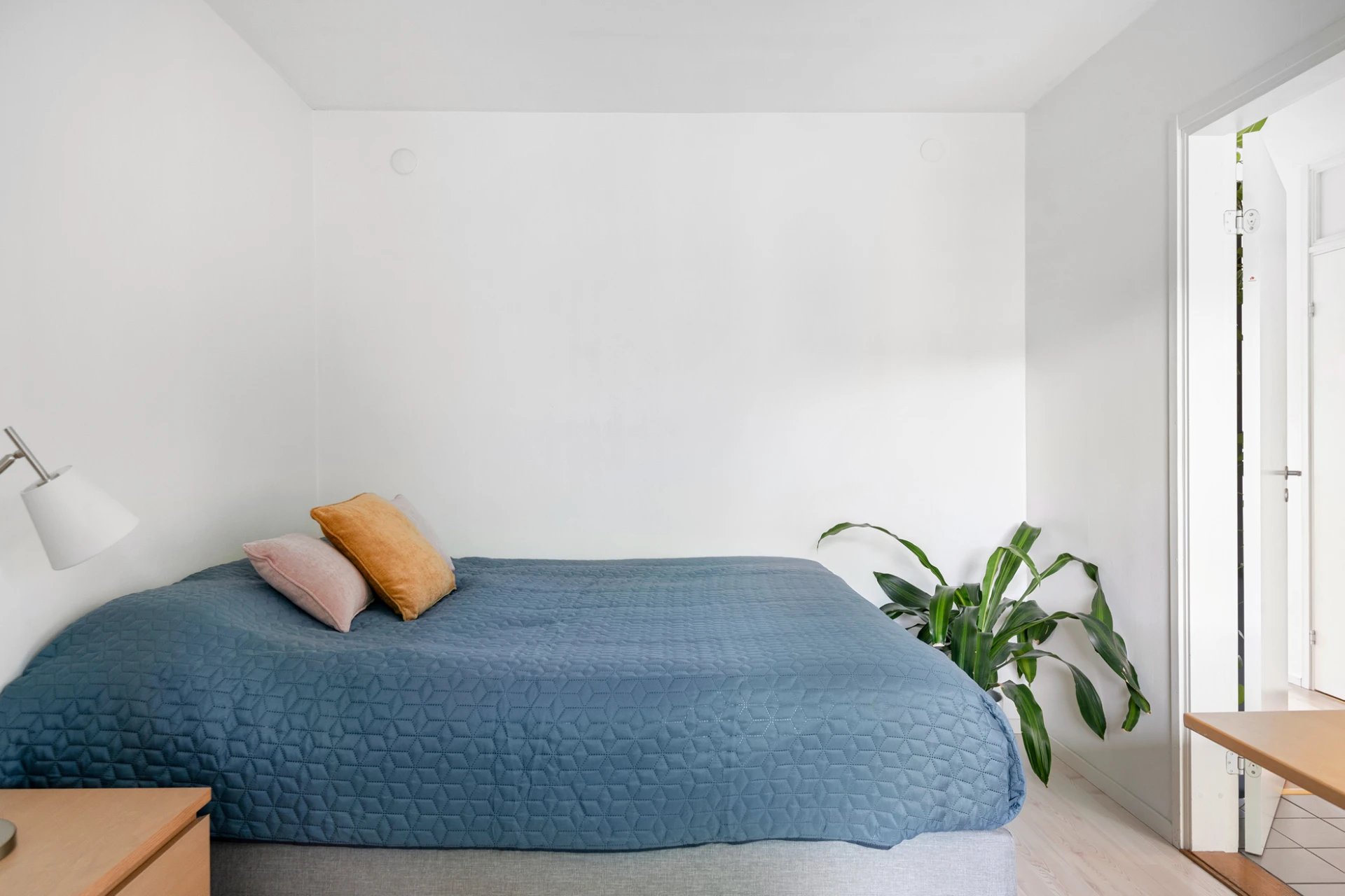 Ljust golv och vita väggar. Rymmer dubbelsäng.