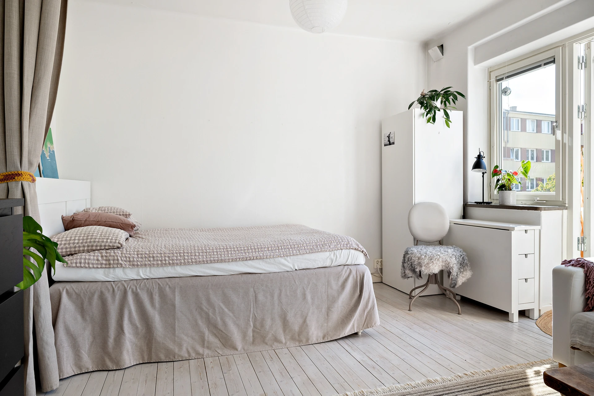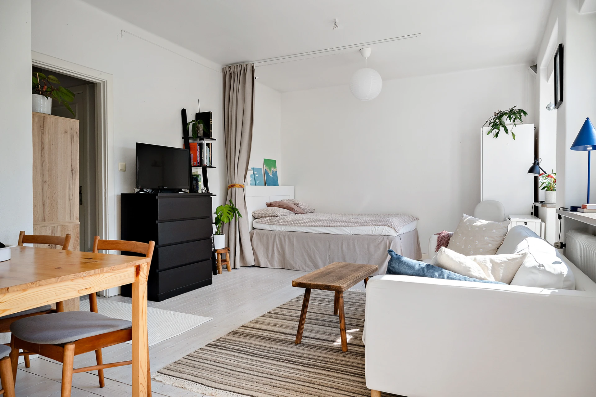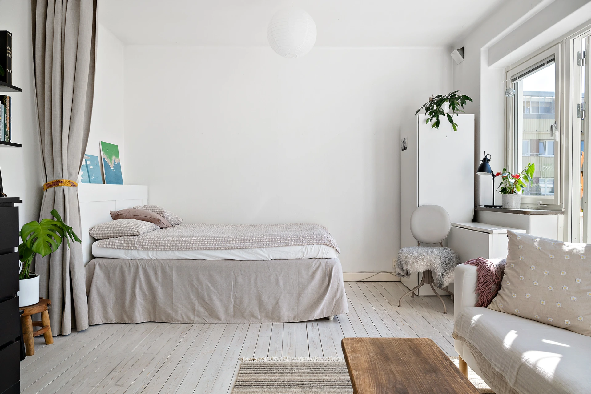 Välkommen till Bokbindaregatan 13 – en inbjudande etta med härlig funkischarm, belägen högst upp i huset på attraktiva Väster. Här bor du i ett stilrent och smakfullt hem där klassiska originaldetaljer möter moderna renoveringar – perfekt för dig som söker något utöver det vanliga. Bostaden bjuder på ett fantastiskt ljusinsläpp genom generösa fönsterpartier som skapar en luftig och harmonisk känsla. Det fina brädgolvet, den tilltagna takhöjden och de bevarade detaljerna från funkiseran ger lägenheten karaktär. Allrummet är rymligt och lättmöblerat – en social yta där du med enkelhet får plats med både soffa, matbord och säng. Från rummet kliver du rakt ut på den stora, insynsskyddade balkongen i bästa sydvästläge – en grön oas där du njuter av solen hela eftermiddagen och kvällen, med plats för både matgrupp och planteringar. Köket är praktiskt och fräscht, med goda arbetsytor och förvaring. Badrummet kombinerar en tidsenlig estetik med modern funktion. Hallen erbjuder dessutom utmärkta förvaringsmöjligheter.