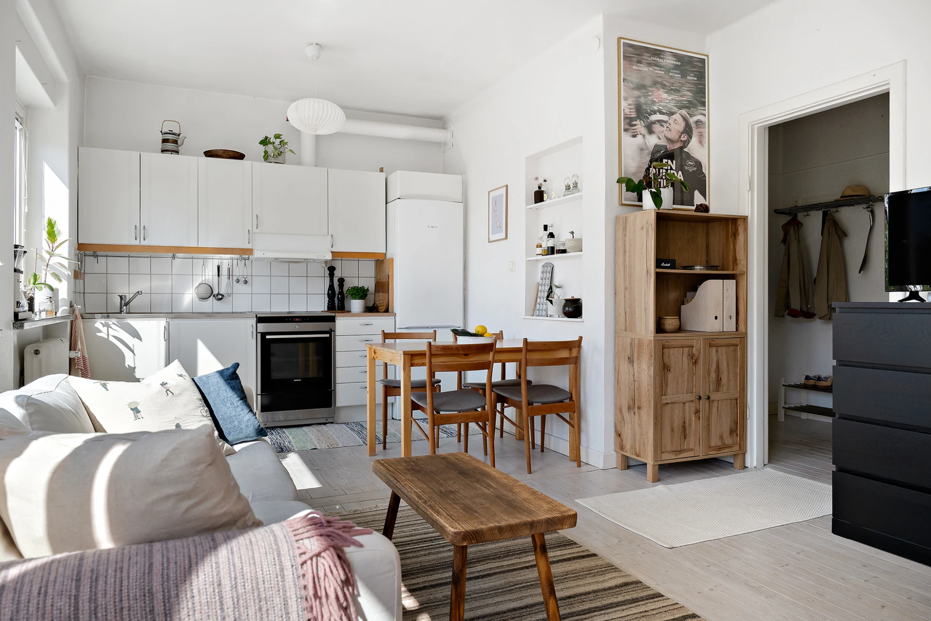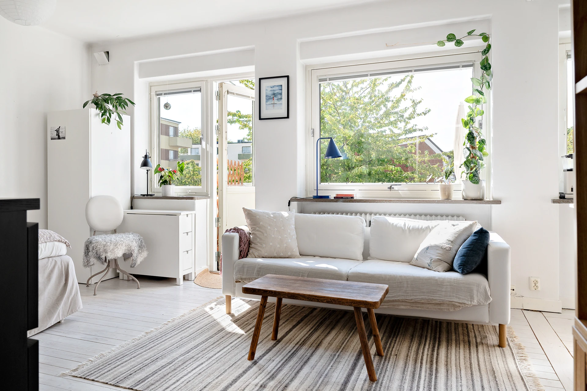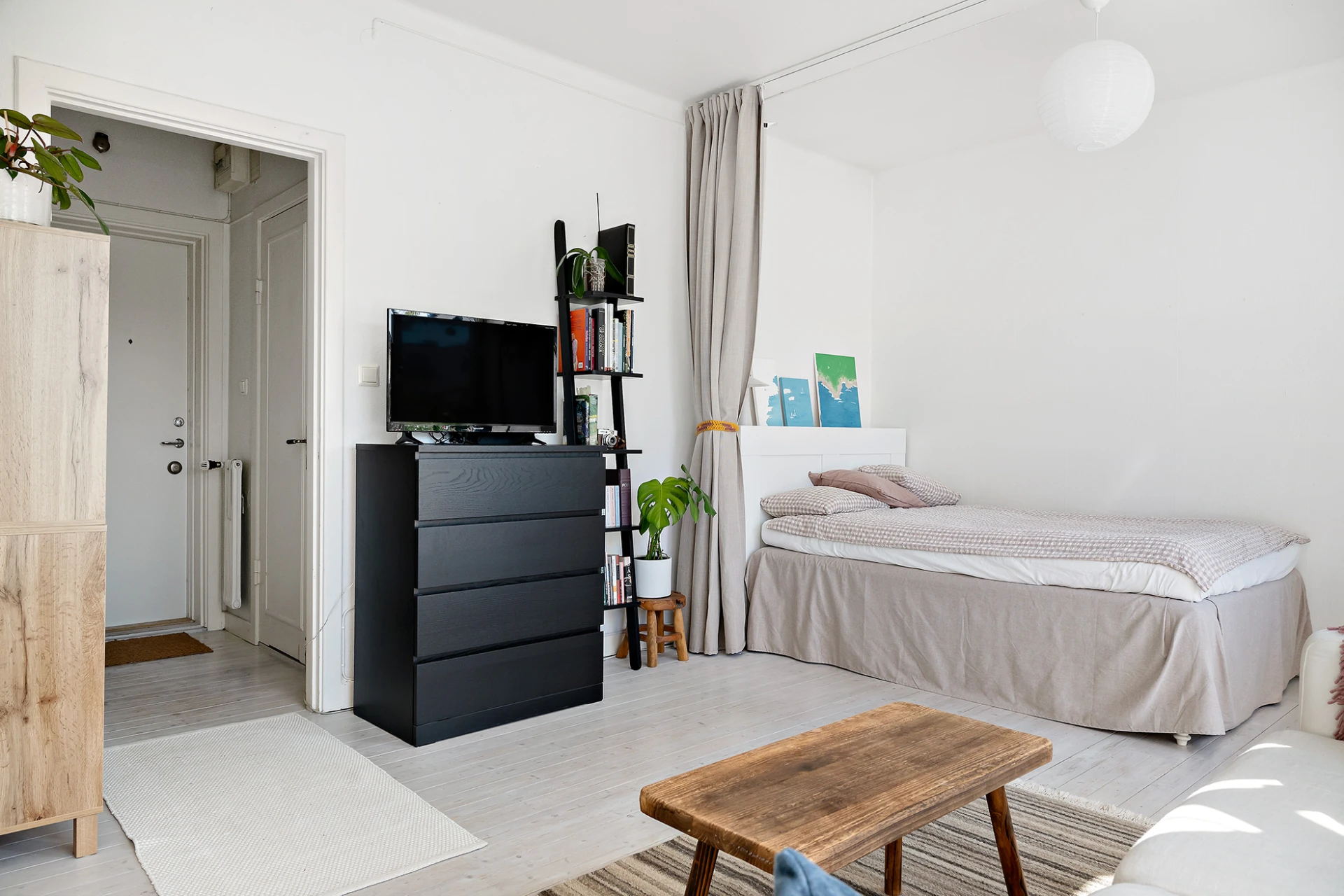Välkommen till Bokbindaregatan 13 – en inbjudande etta med härlig funkischarm, belägen högst upp i huset på attraktiva Väster. Här bor du i ett stilrent och smakfullt hem där klassiska originaldetaljer möter moderna renoveringar – perfekt för dig som söker något utöver det vanliga. Bostaden bjuder på ett fantastiskt ljusinsläpp genom generösa fönsterpartier som skapar en luftig och harmonisk känsla. Det fina brädgolvet, den tilltagna takhöjden och de bevarade detaljerna från funkiseran ger lägenheten karaktär. Allrummet är rymligt och lättmöblerat – en social yta där du med enkelhet får plats med både soffa, matbord och säng. Från rummet kliver du rakt ut på den stora, insynsskyddade balkongen i bästa sydvästläge – en grön oas där du njuter av solen hela eftermiddagen och kvällen, med plats för både matgrupp och planteringar. Köket är praktiskt och fräscht, med goda arbetsytor och förvaring. Badrummet kombinerar en tidsenlig estetik med modern funktion. Hallen erbjuder dessutom utmärkta förvaringsmöjligheter.