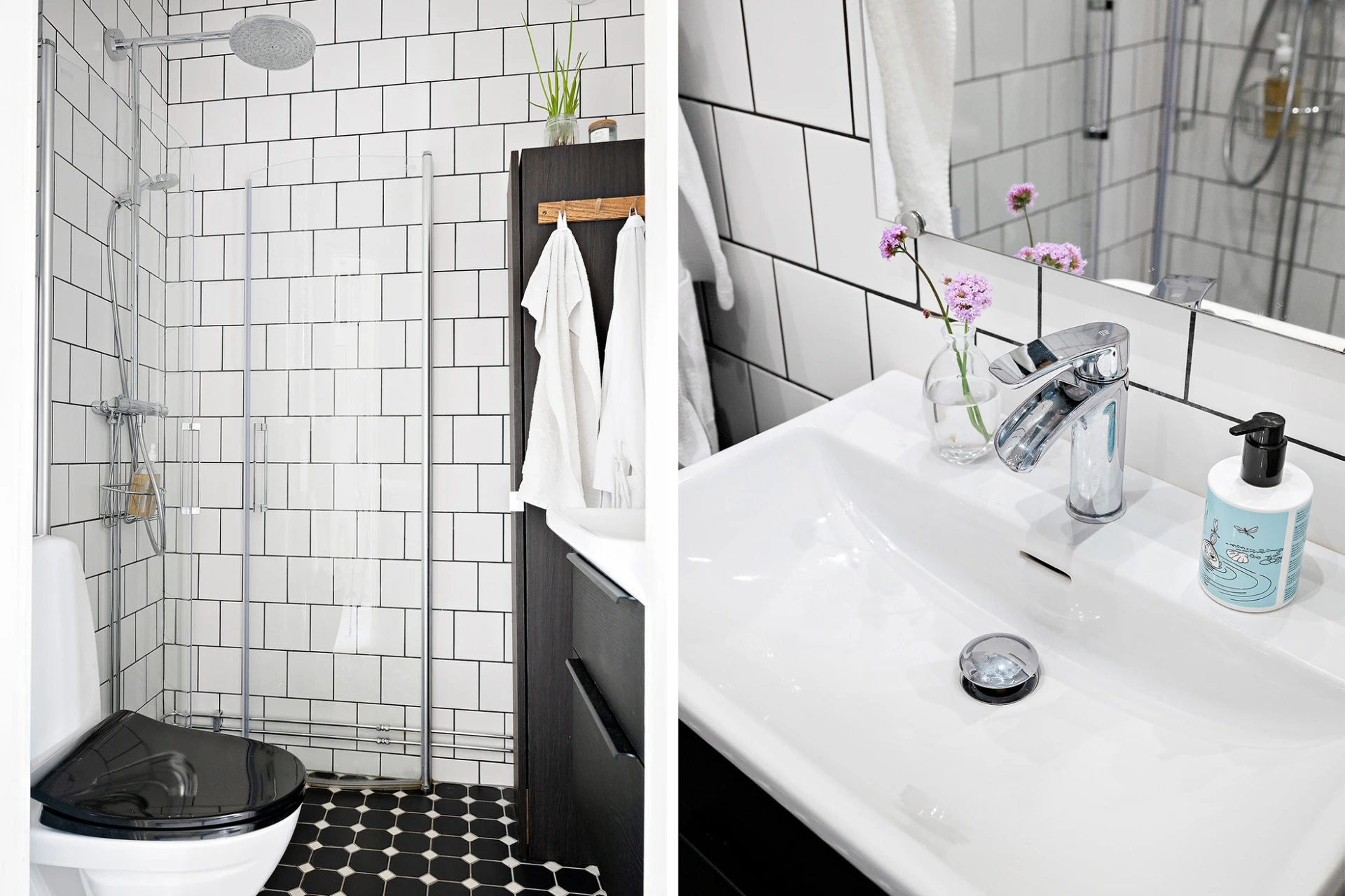 Badrummet renoverades ca 2018 med känsla för husets stil och karaktär. Matieralvalen består av ett mörkt klinekrgolv, vitt kakel och det är utrustat med ett förvaringsskåp, elektrisk handdukstork, kommod med handfat, dimbara spotlights samt dusch och wc.