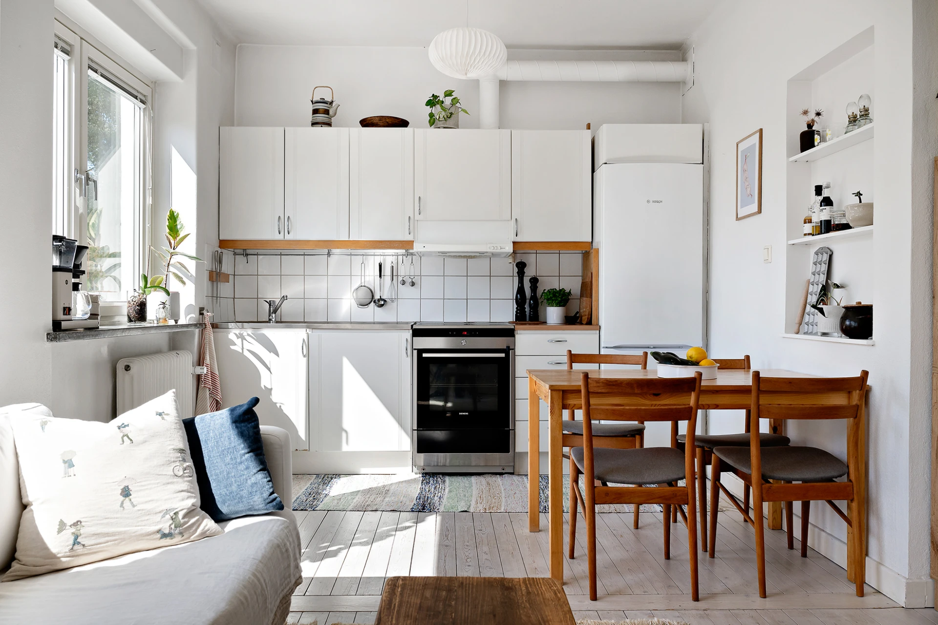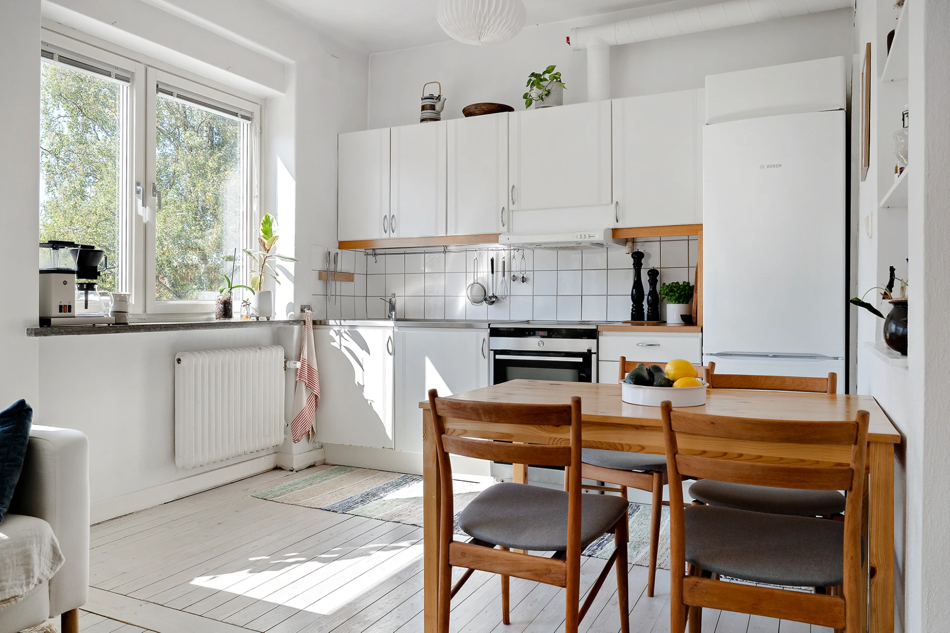 Funktionellt och ljust kök med gott om förvaring. Utrustat med spis med induktionshäll, kombinerad kyl/frys, fläkt och ugn. Gott om plats för en fristående köksö.