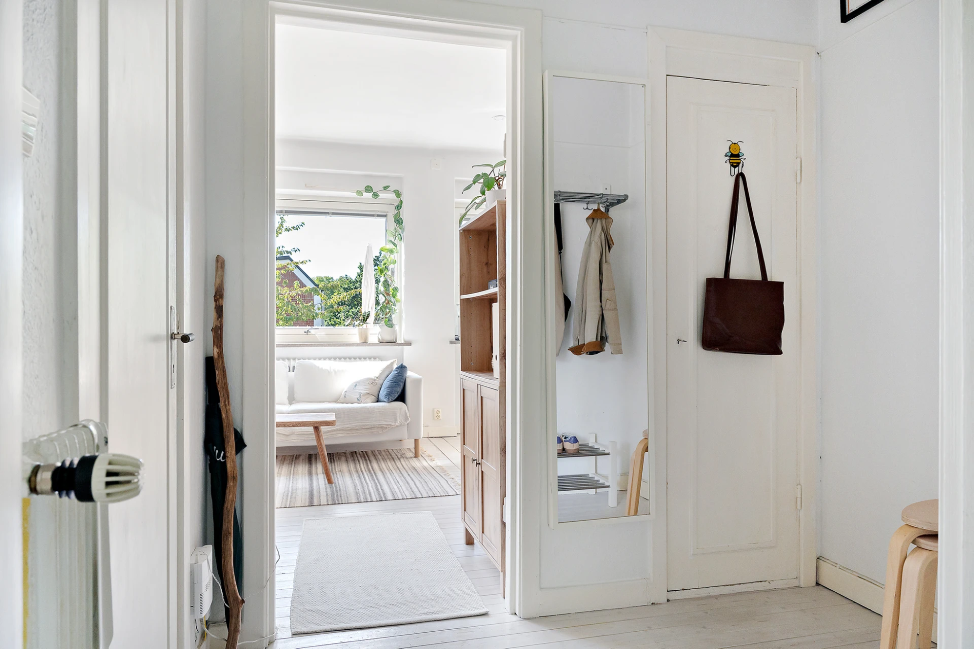 Rymlig hall med plats för ytterkläder och en stor klädkammare. Säkerhetsdörr.