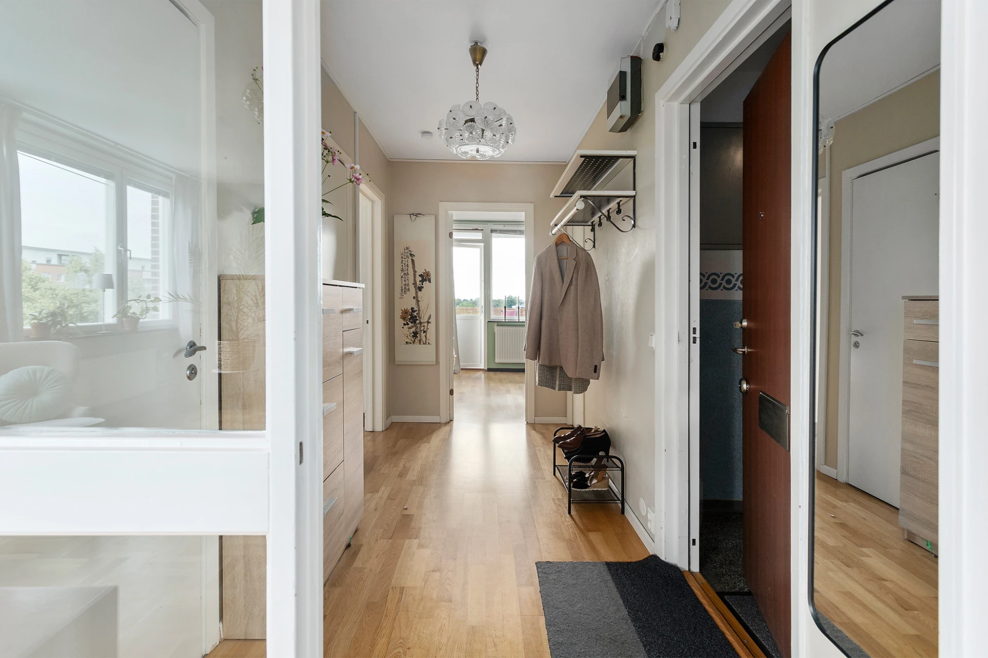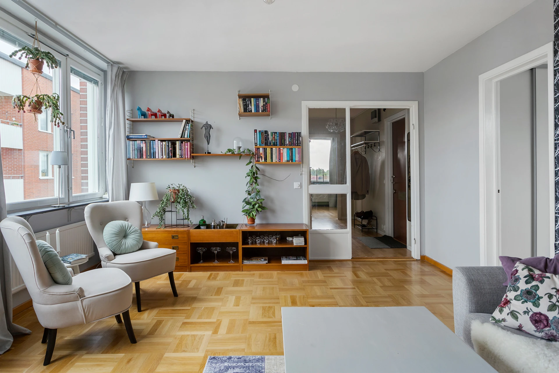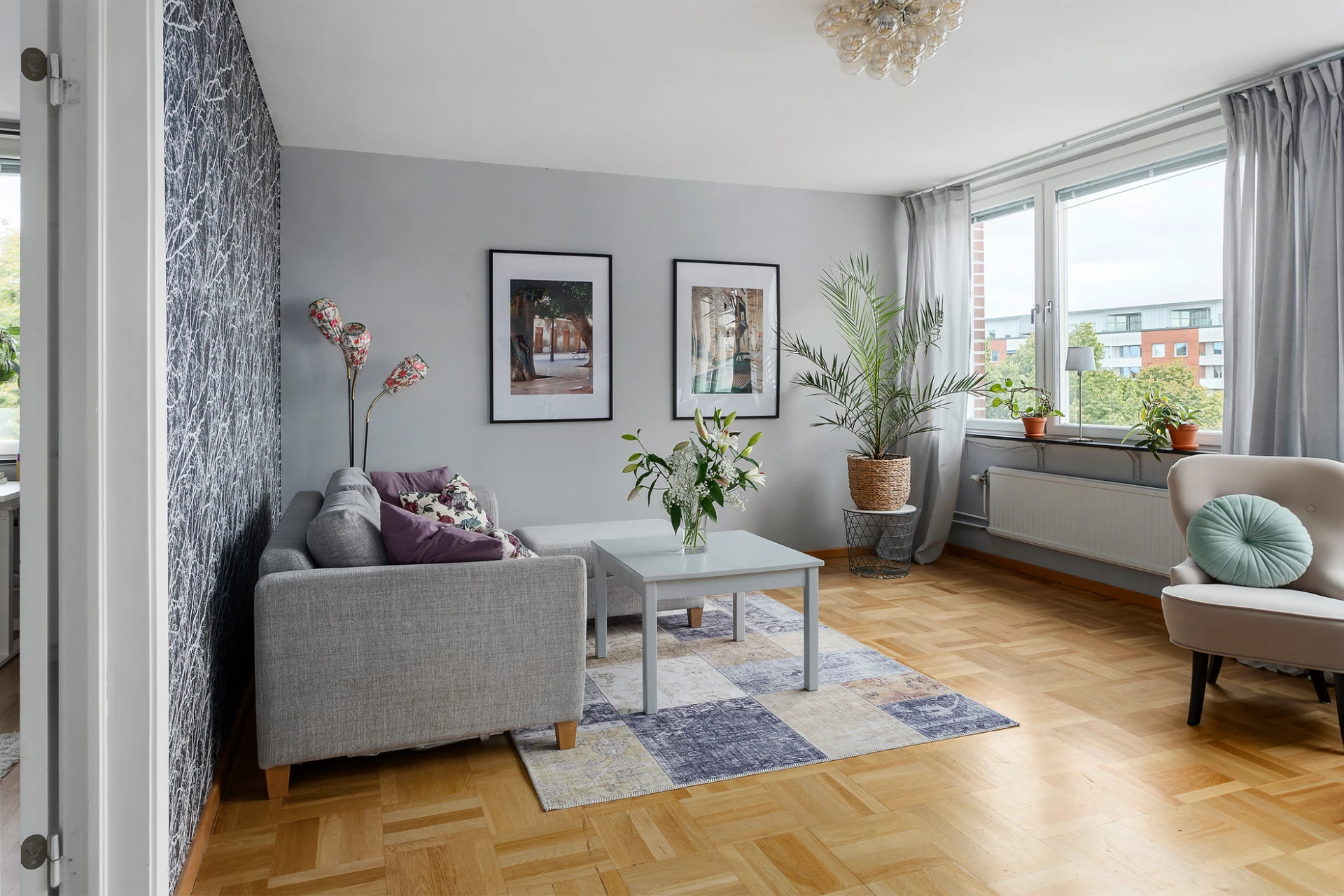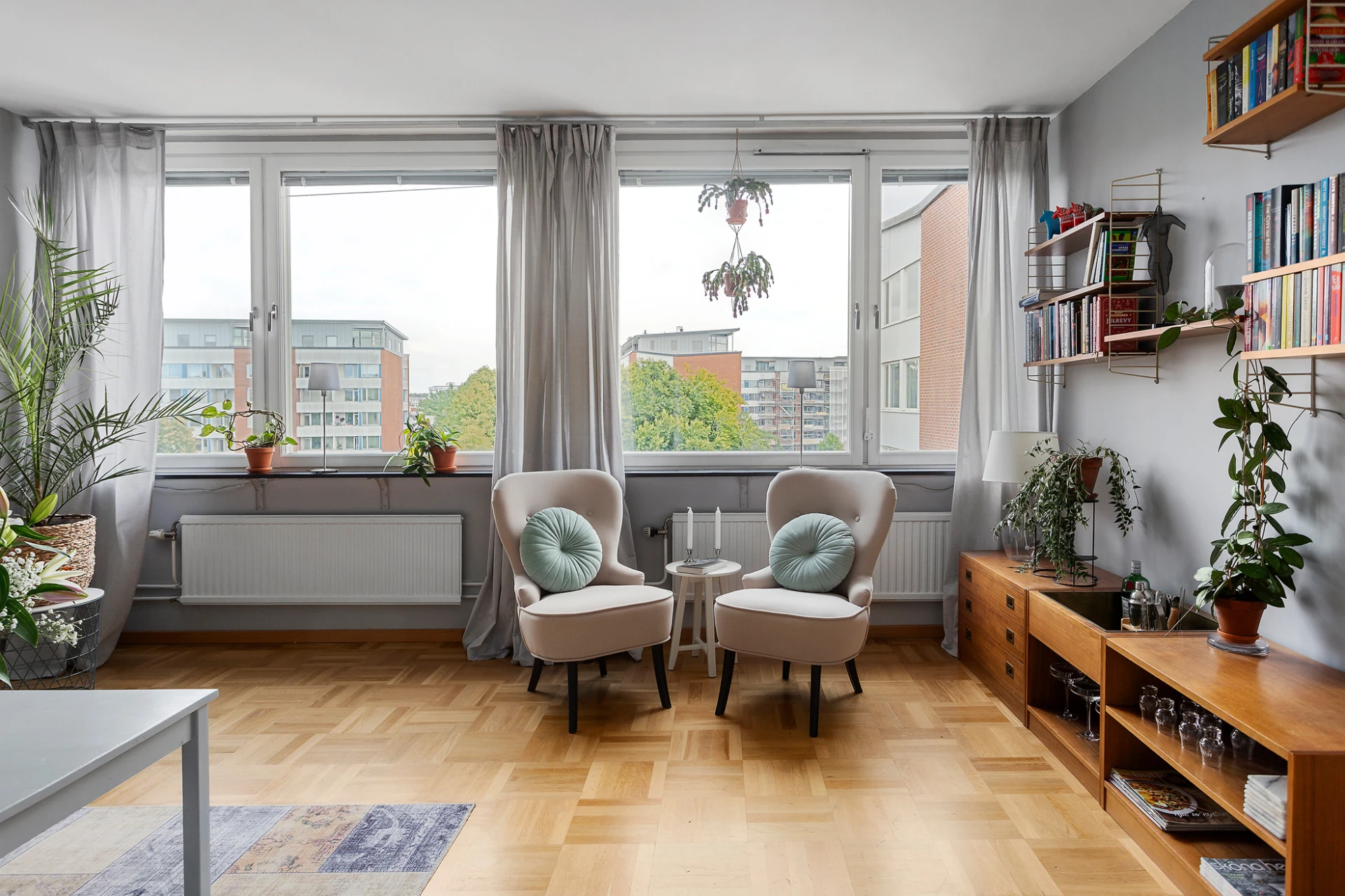 Bostaden bjuder på ett omsorgsfullt renoverat kök med plats för matbord, ett luftigt vardagsrum och två sovrum. Från det ena sovrummet har vi direkt utgång till den södervända balkongen där vi kan njuta av en fridfull utsikt över innergården och trädtopparna. Vidare bjuder bostaden på en praktisk klädkammare, flertalet garderober samt en extra gäst-WC - ett hem som både är bekvämt och funktionellt.