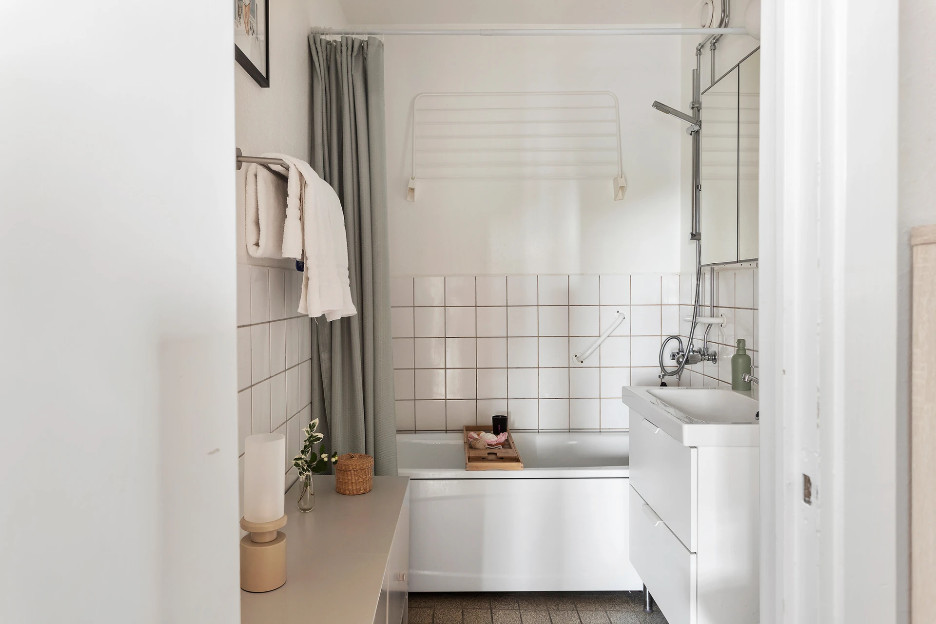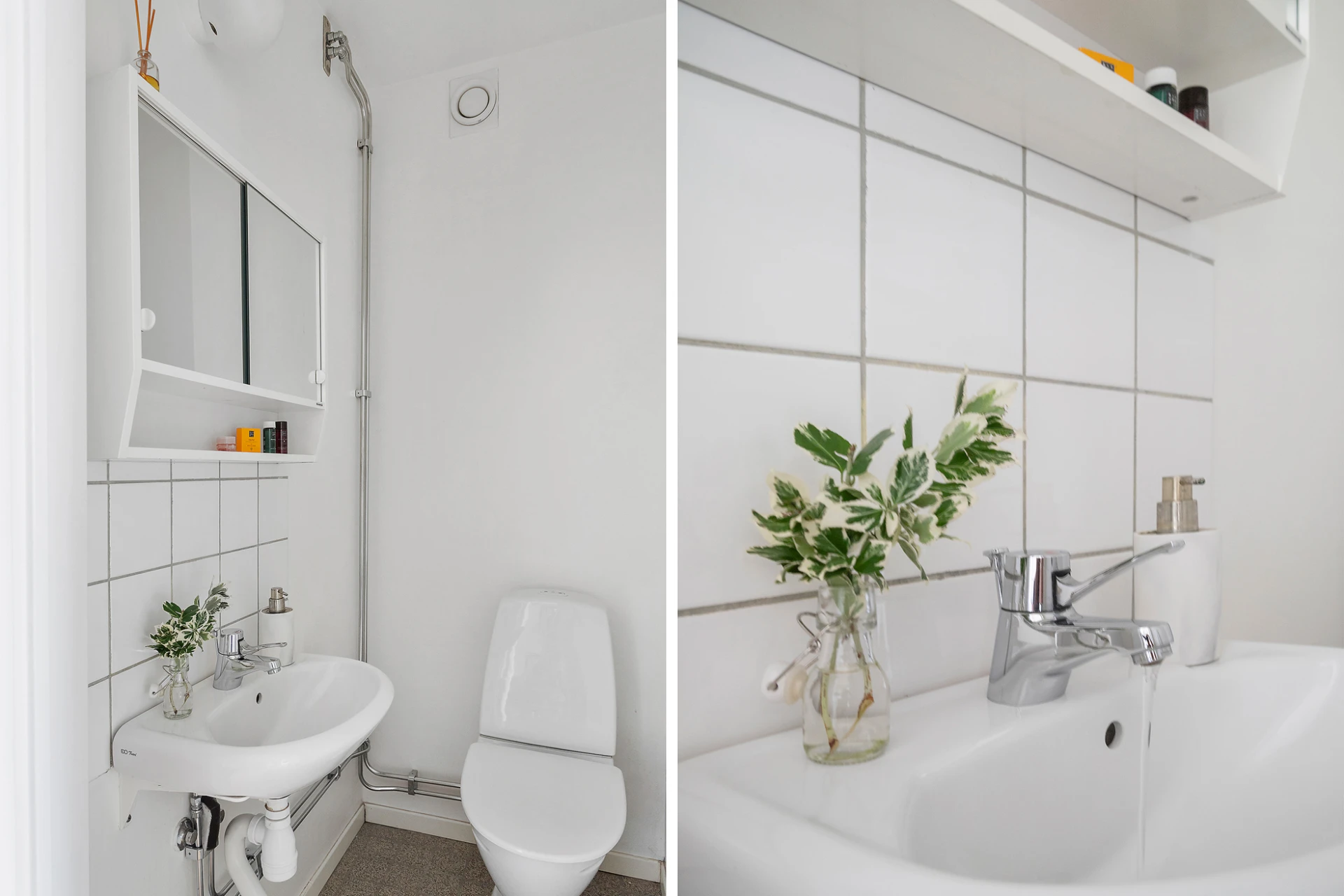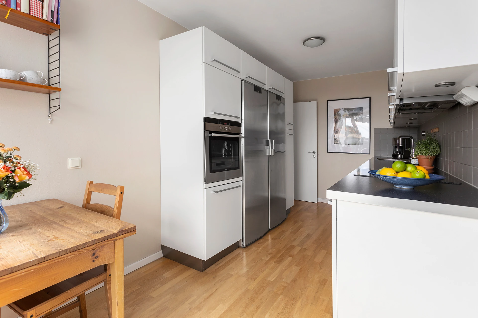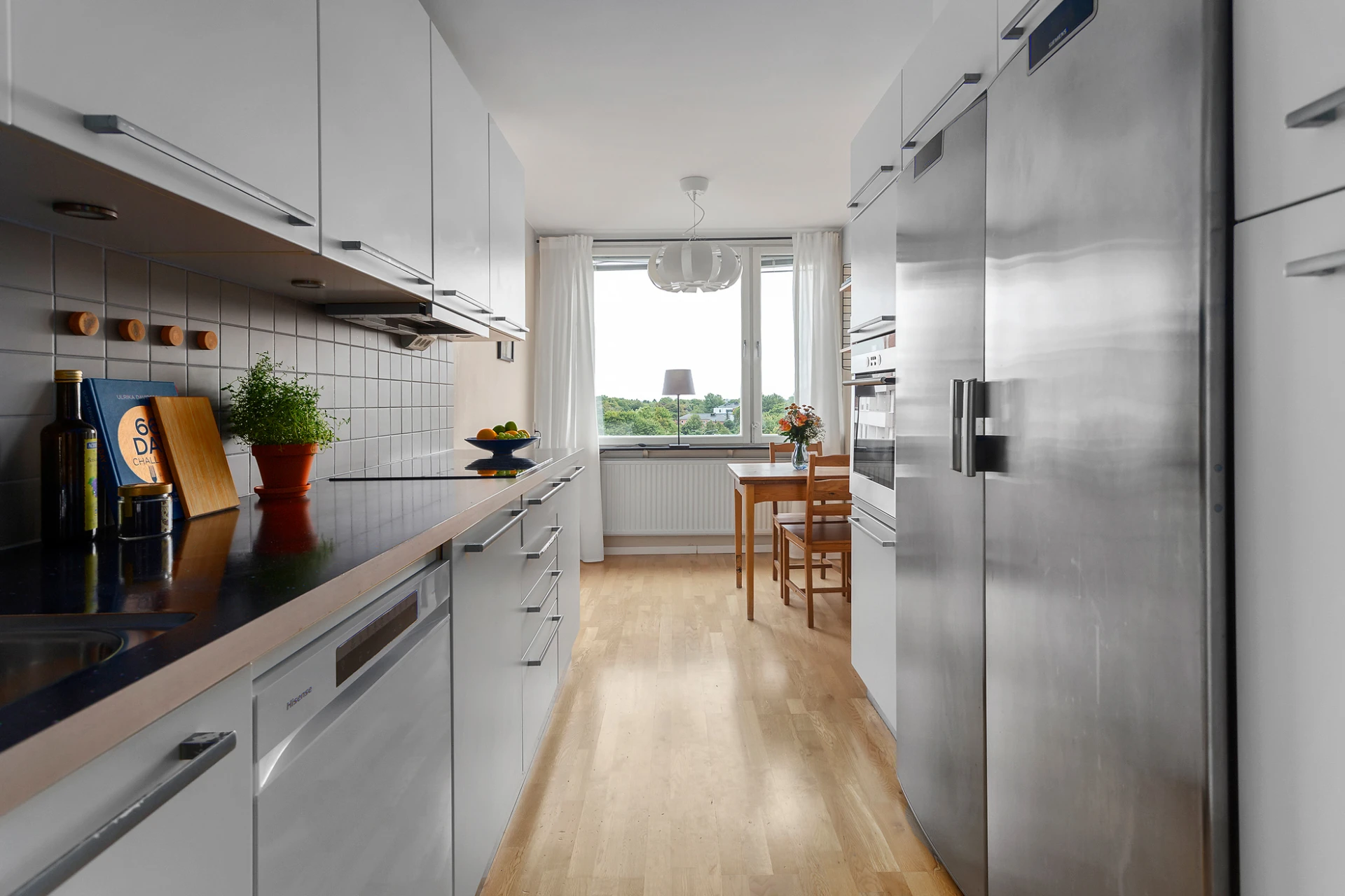 Bostaden bjuder på ett omsorgsfullt renoverat kök med plats för matbord, ett luftigt vardagsrum och två sovrum. Från det ena sovrummet har vi direkt utgång till den södervända balkongen där vi kan njuta av en fridfull utsikt över innergården och trädtopparna. Vidare bjuder bostaden på en praktisk klädkammare, flertalet garderober samt en extra gäst-WC - ett hem som både är bekvämt och funktionellt.