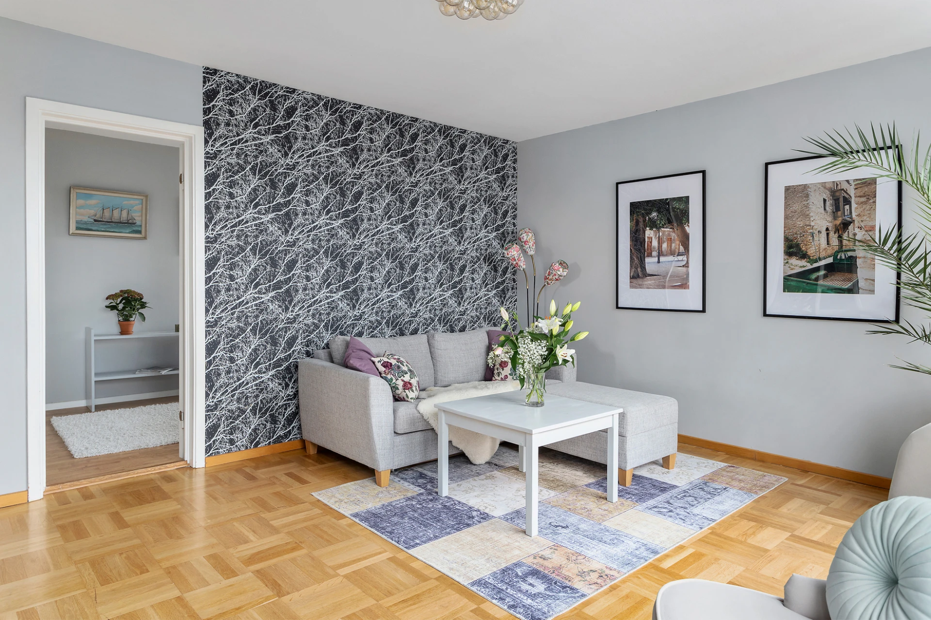 Parkettgolv och grå väggar samt mönstrad fondvägg.
