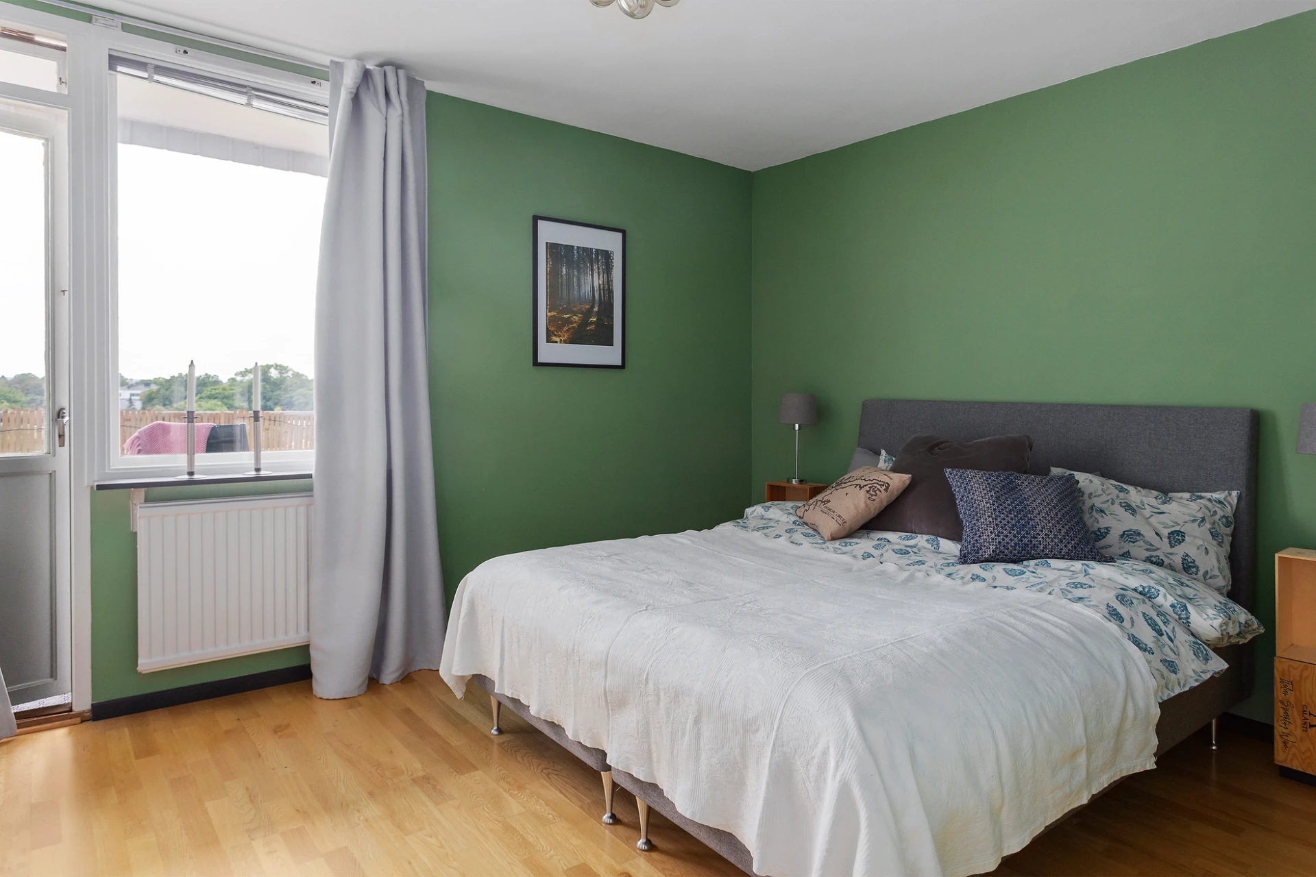 Parkettgolv och gröna väggar. Förvaringsmöjligheter i garderober och utgång till balkong.