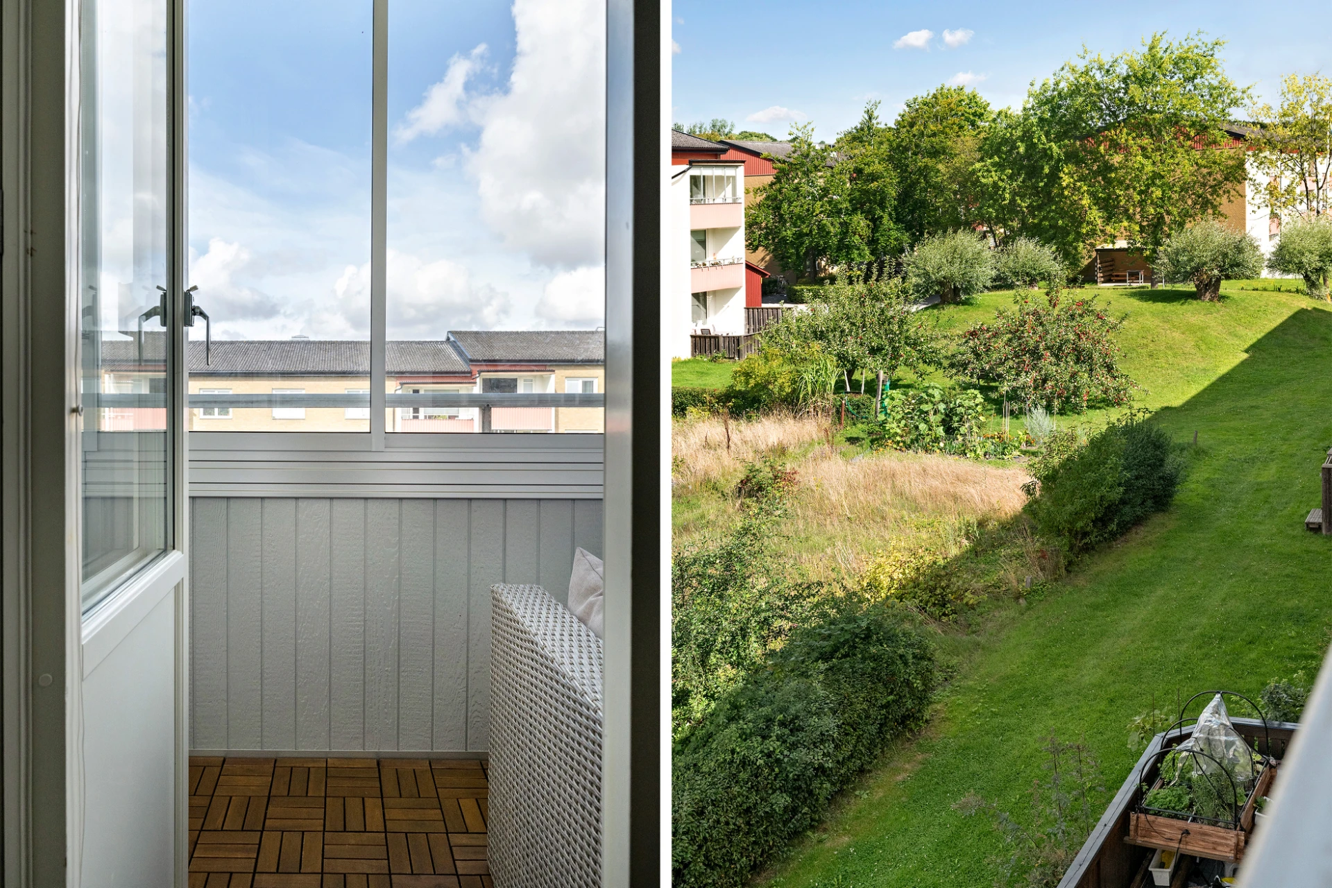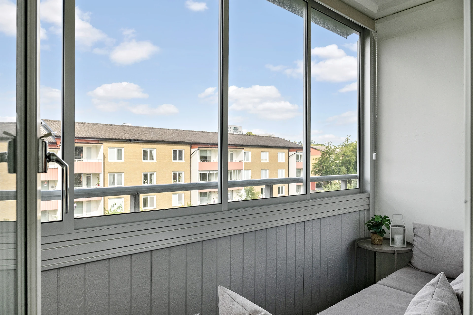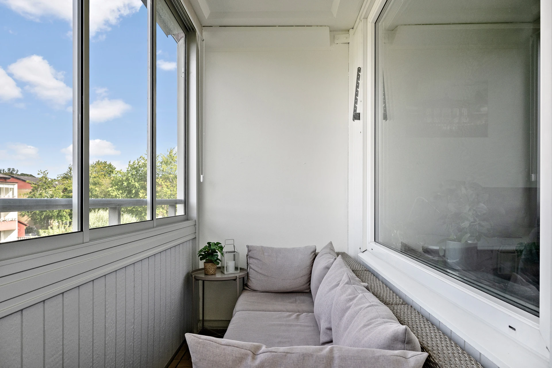 Rymlig och ombonad inglasad balkong som fungerar som ett extra rum året om, perfekt för morgonkaffet, avkoppling under dagen eller en middag i kvällssolen. I samband med inglasningen installerades även måttbeställda gardiner som ger både skugga och avskildhet vid behov.