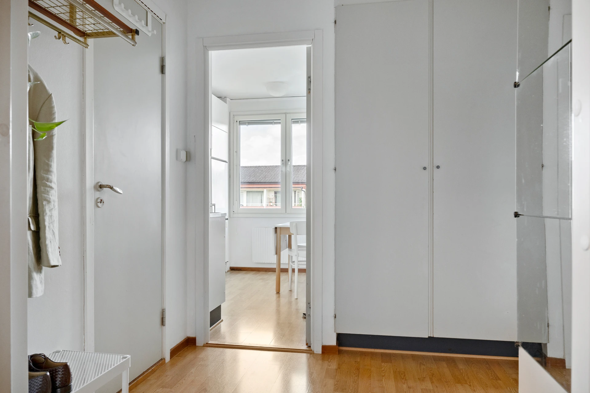 Välkomnande hall med plats för avhängning av jackor och förvaring av skor direkt till höger. Från hallen nås både badrum, kök och vardagsrum, vilket skapar ett smidigt och praktiskt flöde i bostaden. Vitmålade väggar i kombination med parkettgolv ger ett ljust och stilrent intryck.