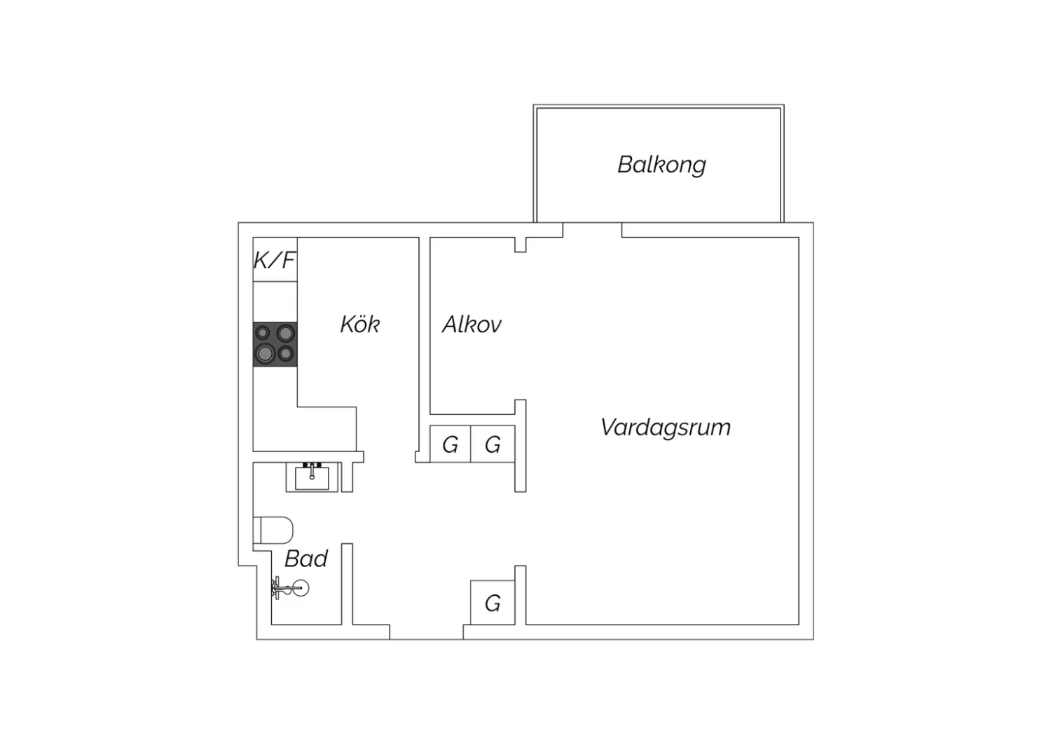 Här möts kök och matplats i en naturlig harmoni med det ljusa och luftiga vardagsrummet, som rymmer både sociala ytor och en smart placerad sovalkov. Tack vare de generösa fönsterpartierna i både kök och vardagsrum flödar ljuset genom hela lägenheten och skapar en varm, inbjudande atmosfär. Sovalkoven är diskret placerad och kan enkelt skärmas av med stilrena gardiner, perfekt för den som önskar avskildhet utan att tumma på rymd och öppenhet. Från vardagsrummet når du den rymliga och soliga balkongen, en härlig förlängning av hemmet under årets varmare månader. Här njuter du av frukosten i morgonsolen eller kopplar av i kvällsljuset.
