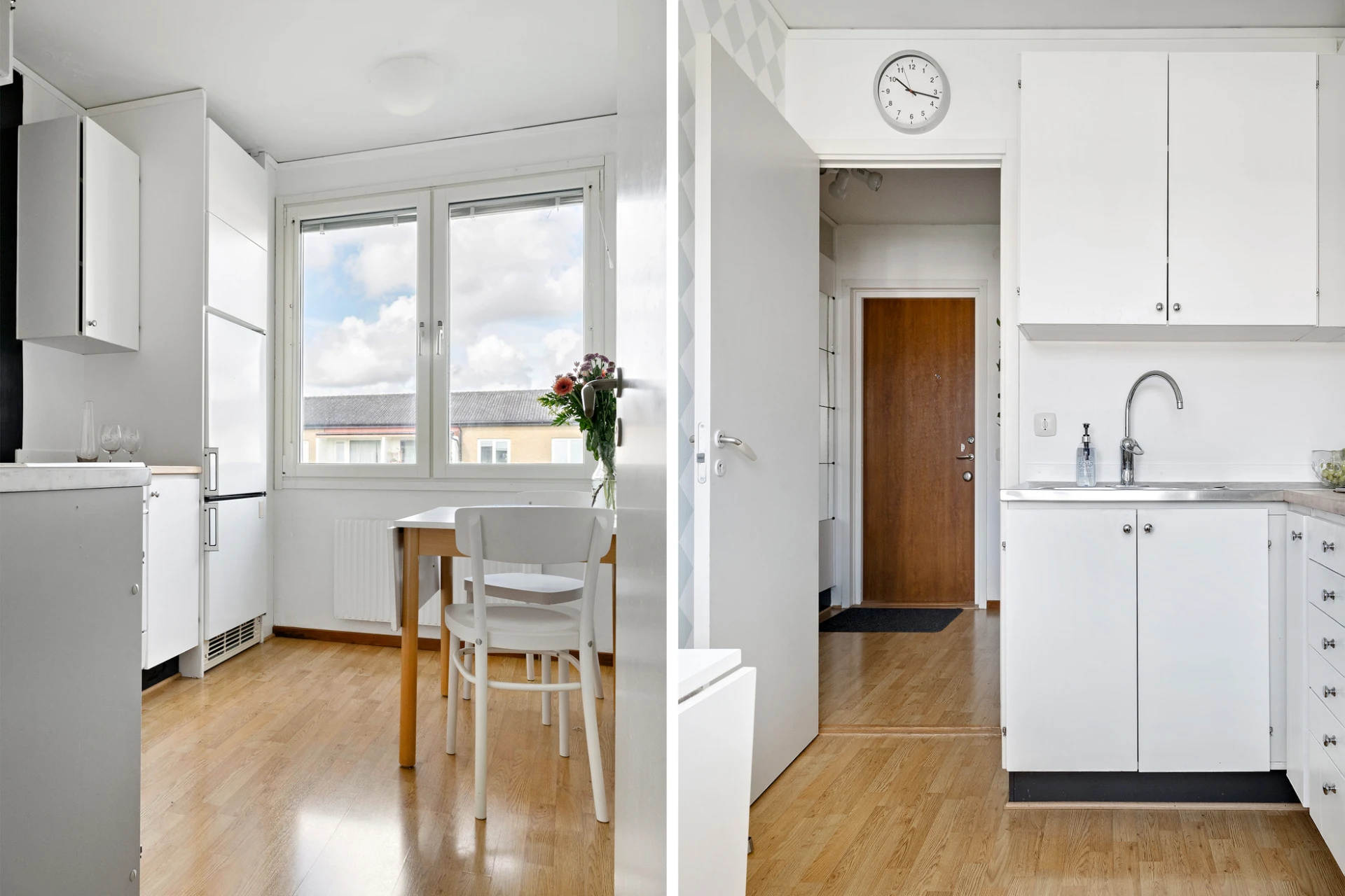 Välplanerat kök med generöst ljusinsläpp från stora fönsterpartier och plats för matbord för fyra personer. Vita skåpluckor med silvriga detaljer ger ett modernt intryck, och det genomgående parkettgolvet bidrar till en enhetlig känsla. Köket är utrustat med kyl/frys, spis, ugn samt en praktisk bänkdiskmaskin.