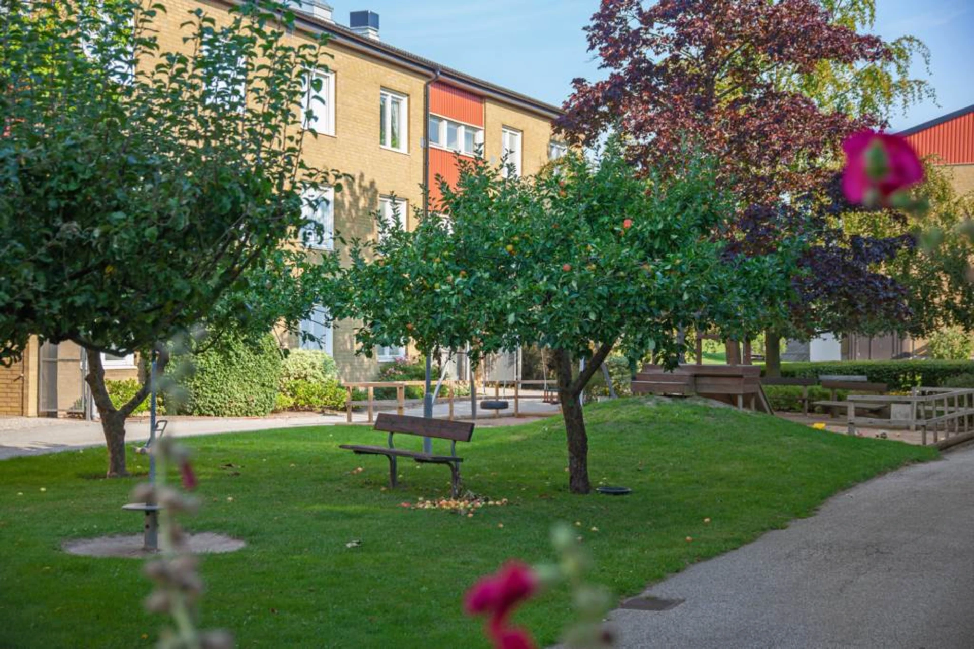 Gemensamma gårdar med utemöbler, lekplats och mattpiskning. För den odlingsintresserade finns odlingslotter att hyra.