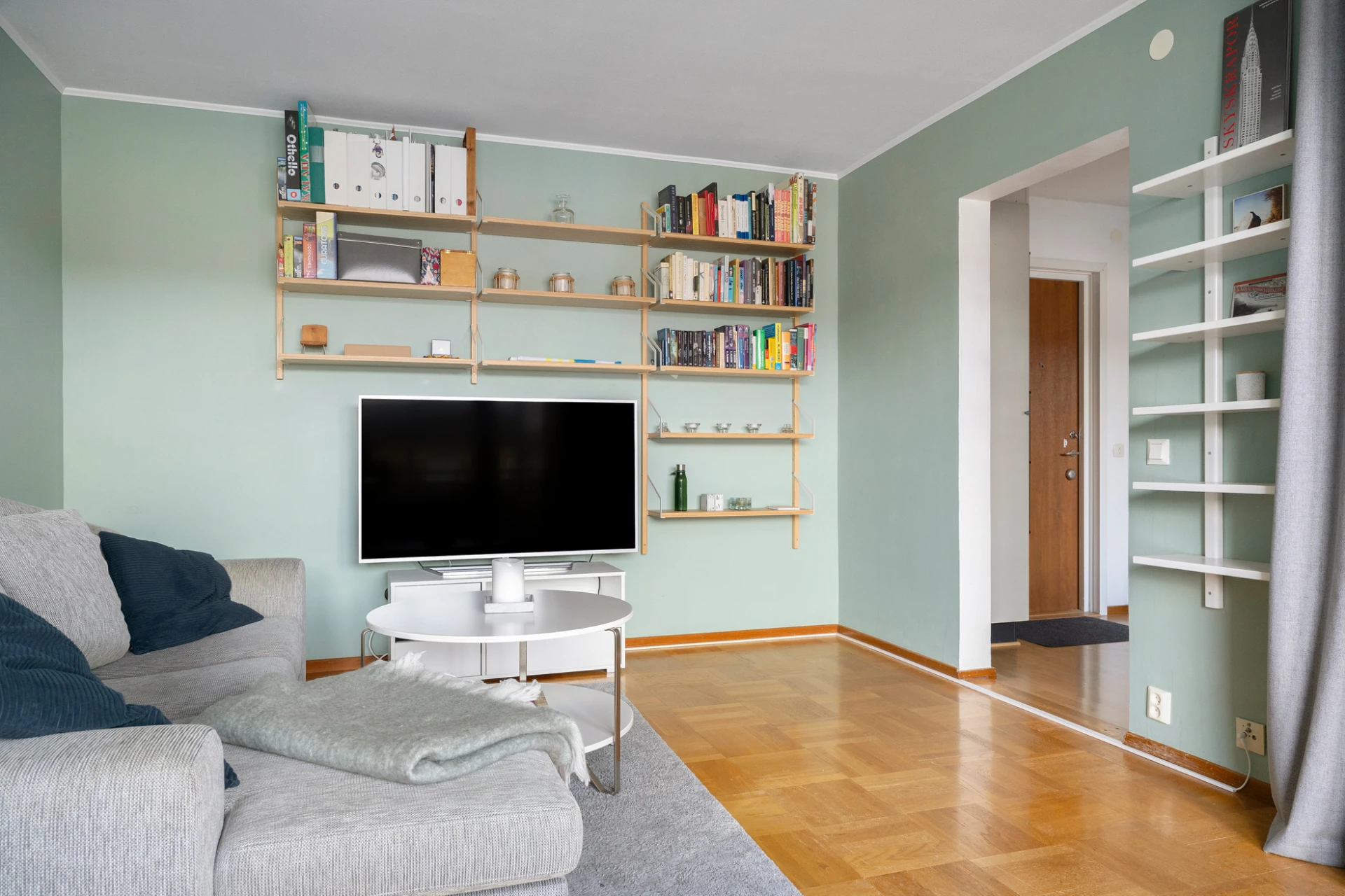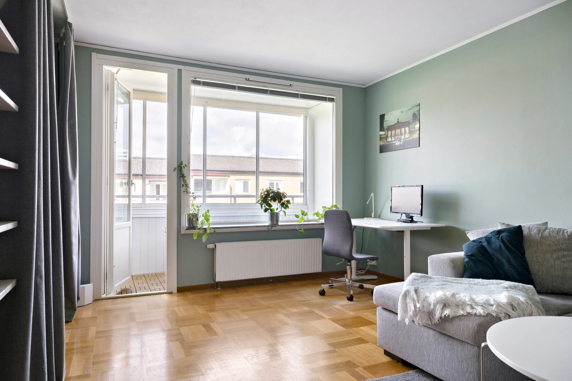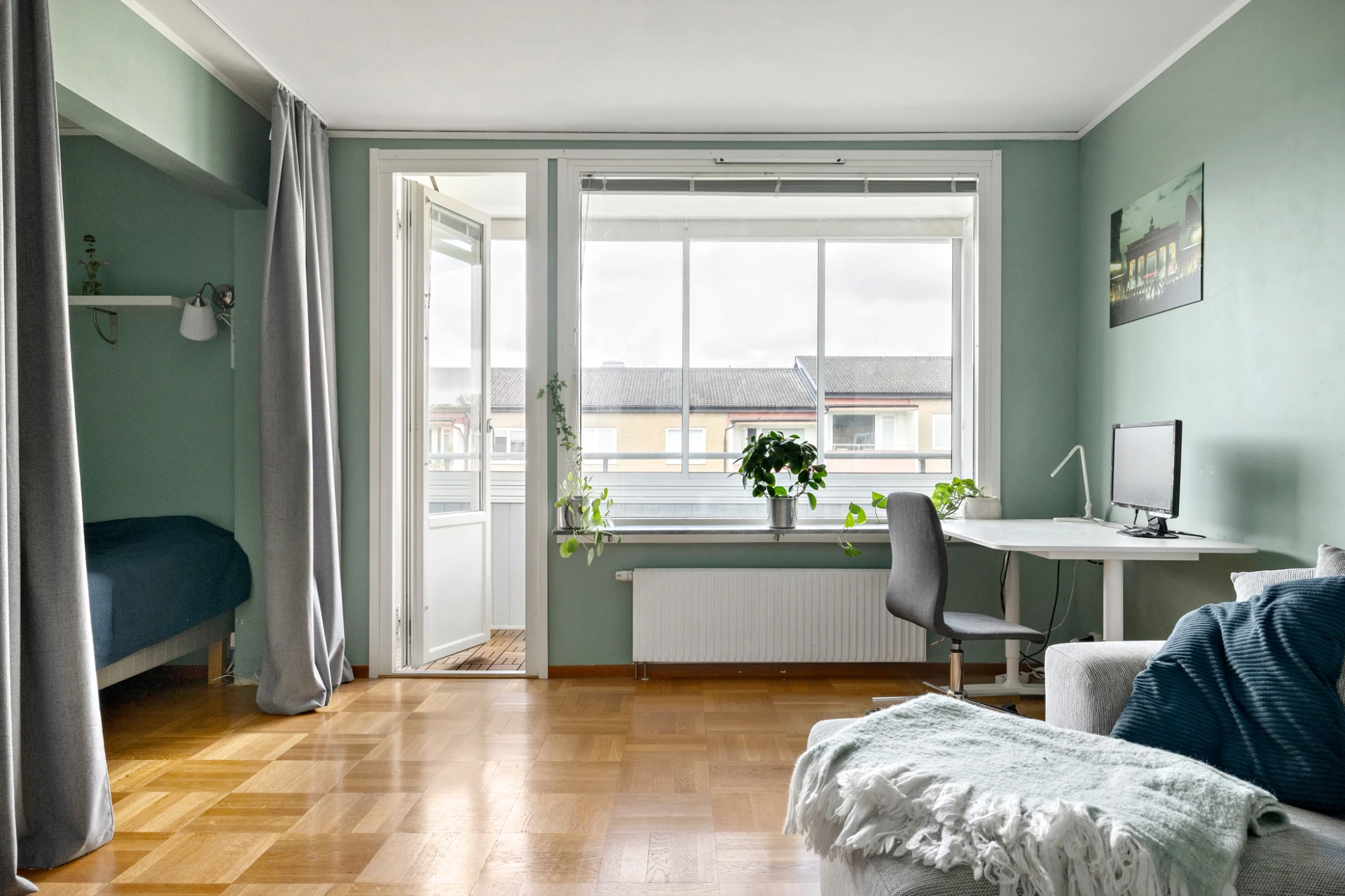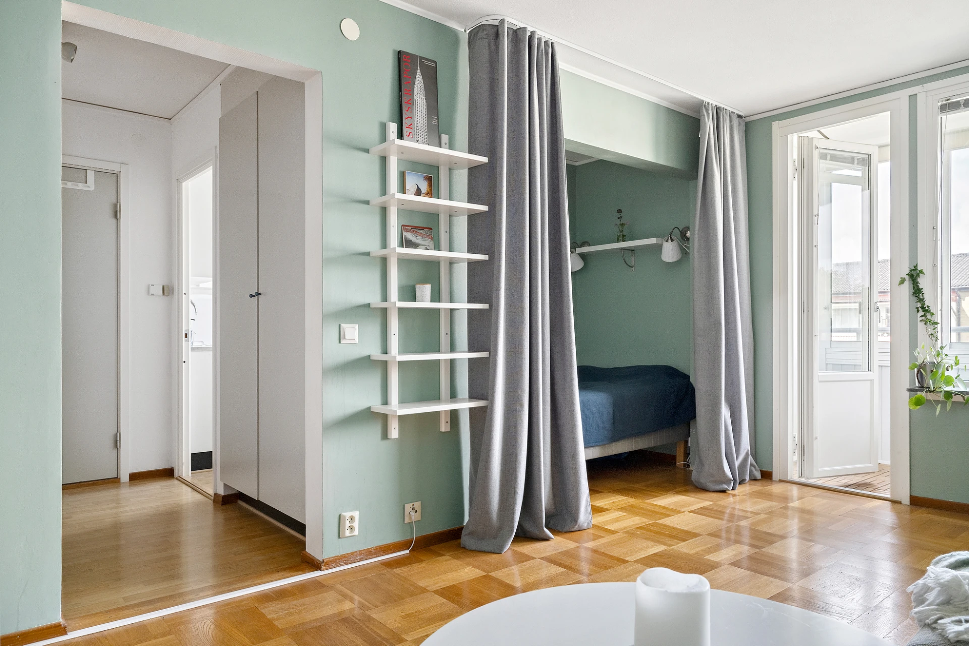 Rymligt och harmoniskt vardagsrum med grönmålade väggar som, i kombination med stora fönsterpartier, skapar en lugn och inbjudande atmosfär. Här finns gott om plats för både en generös soffgrupp och matplats, samtidigt som sängen smidigt döljs i den mysiga sovalkoven. Från vardagsrummet finns även utgång till balkongen.