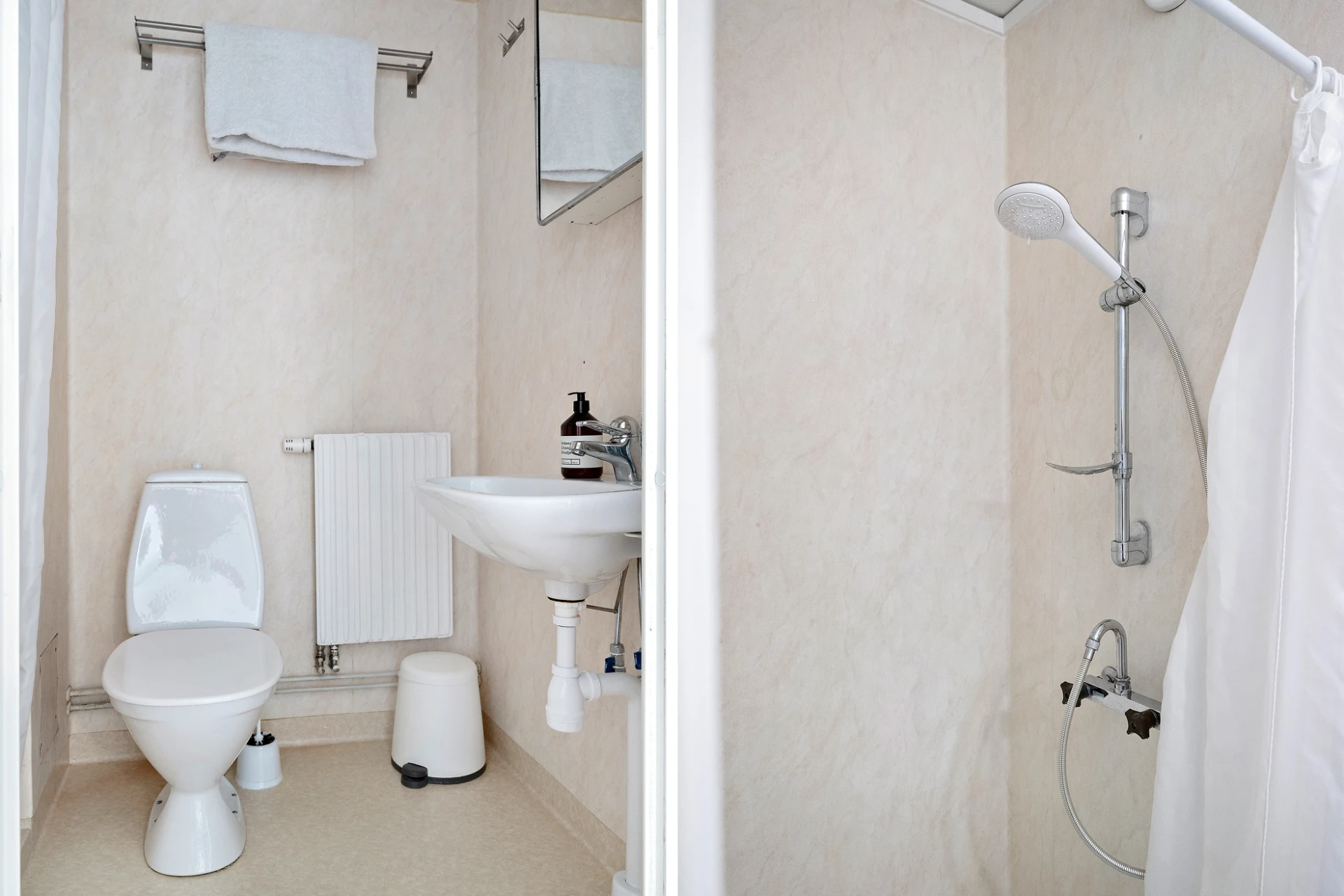 Välplanerat badrum med praktisk våtrumsmatta och tidlös inredning. Utrustat med WC, handfat, spegelskåp, dusch och handdukstork.