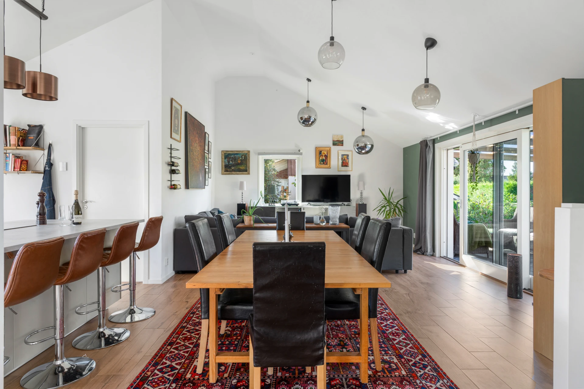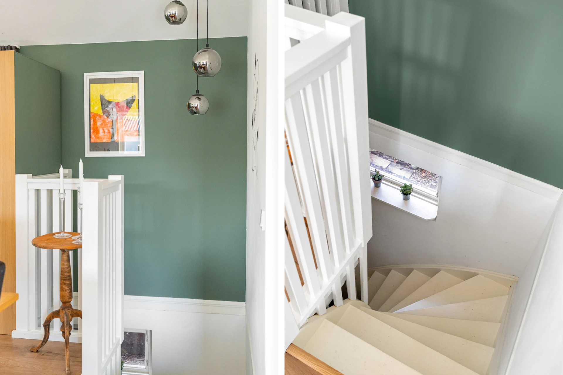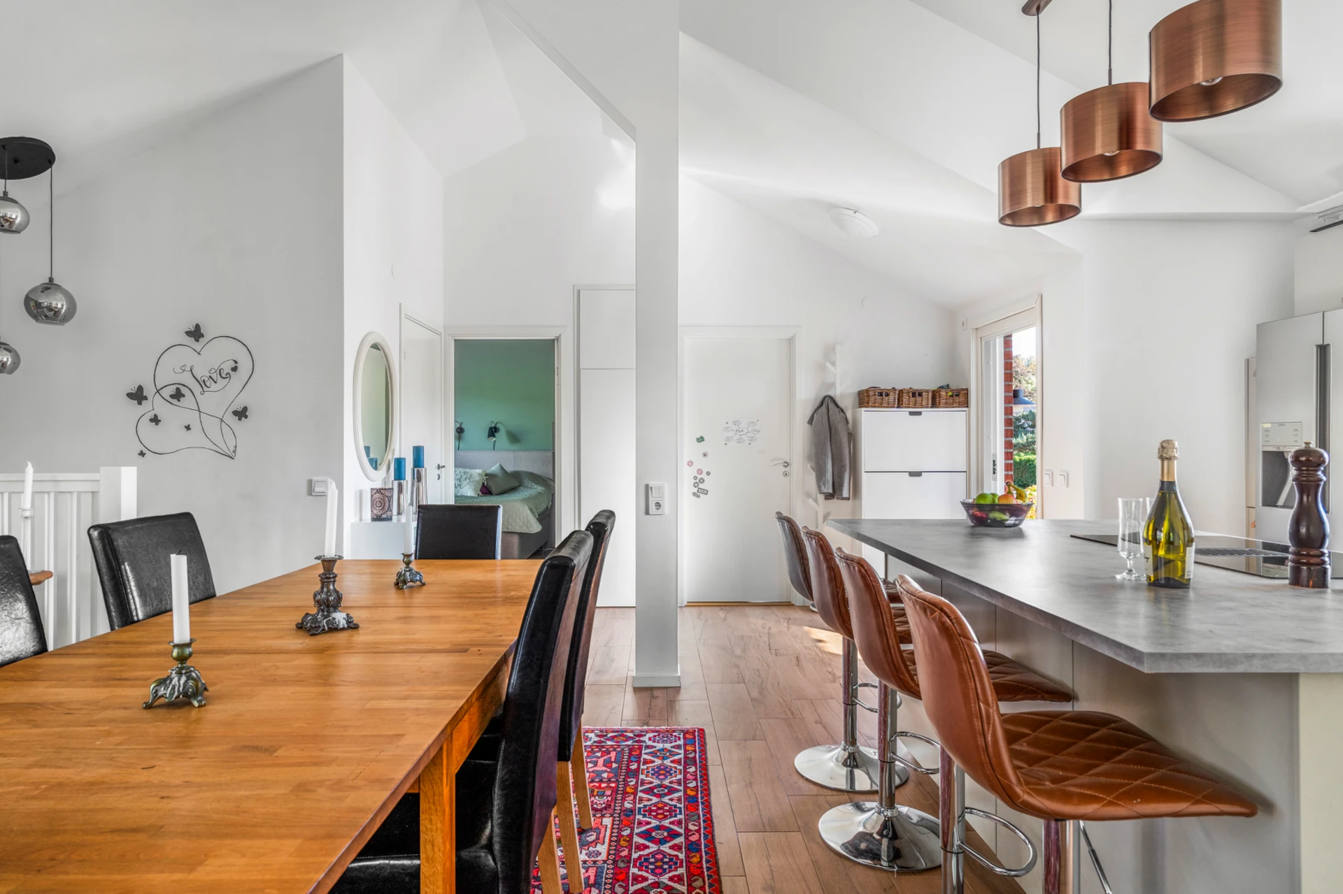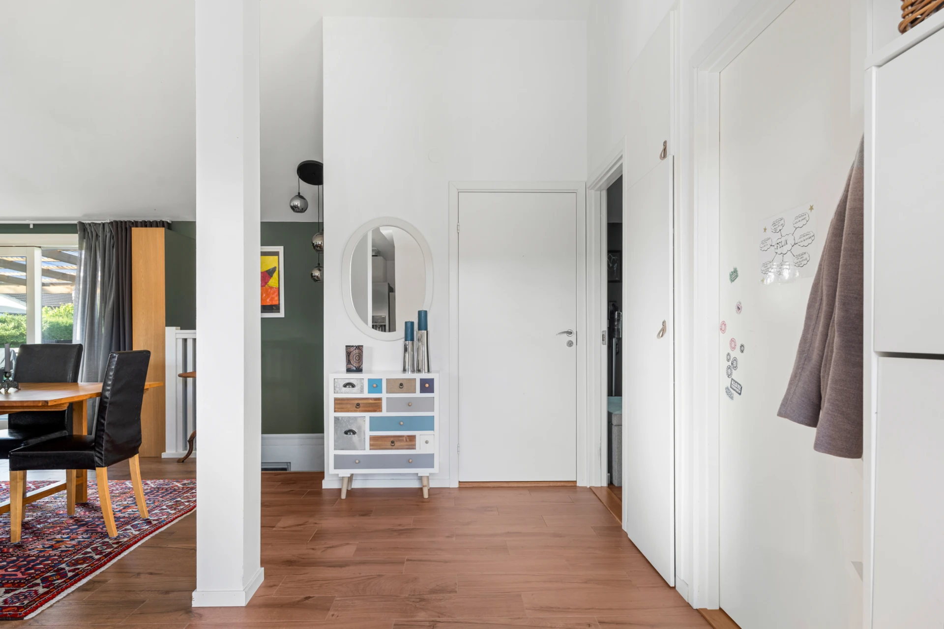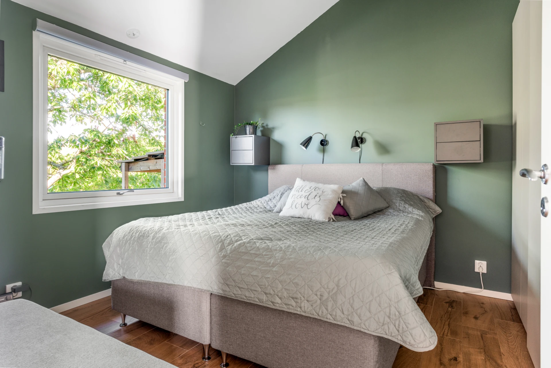 Klinker på golvet med vattenburen golvvärme och vitmålade väggar med fondvägg med mörkgrön ton. Öppet upp i nock och utgång till altan i västerläge.