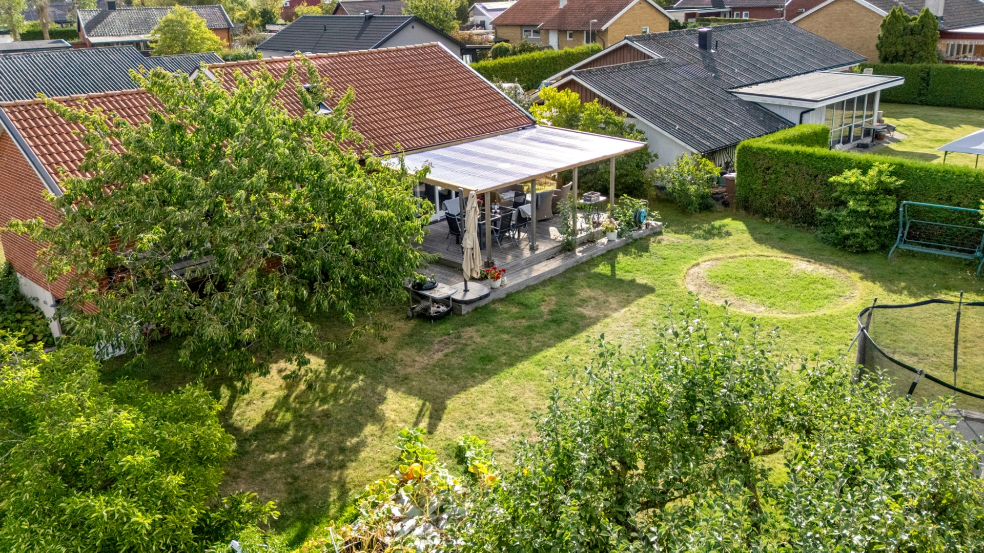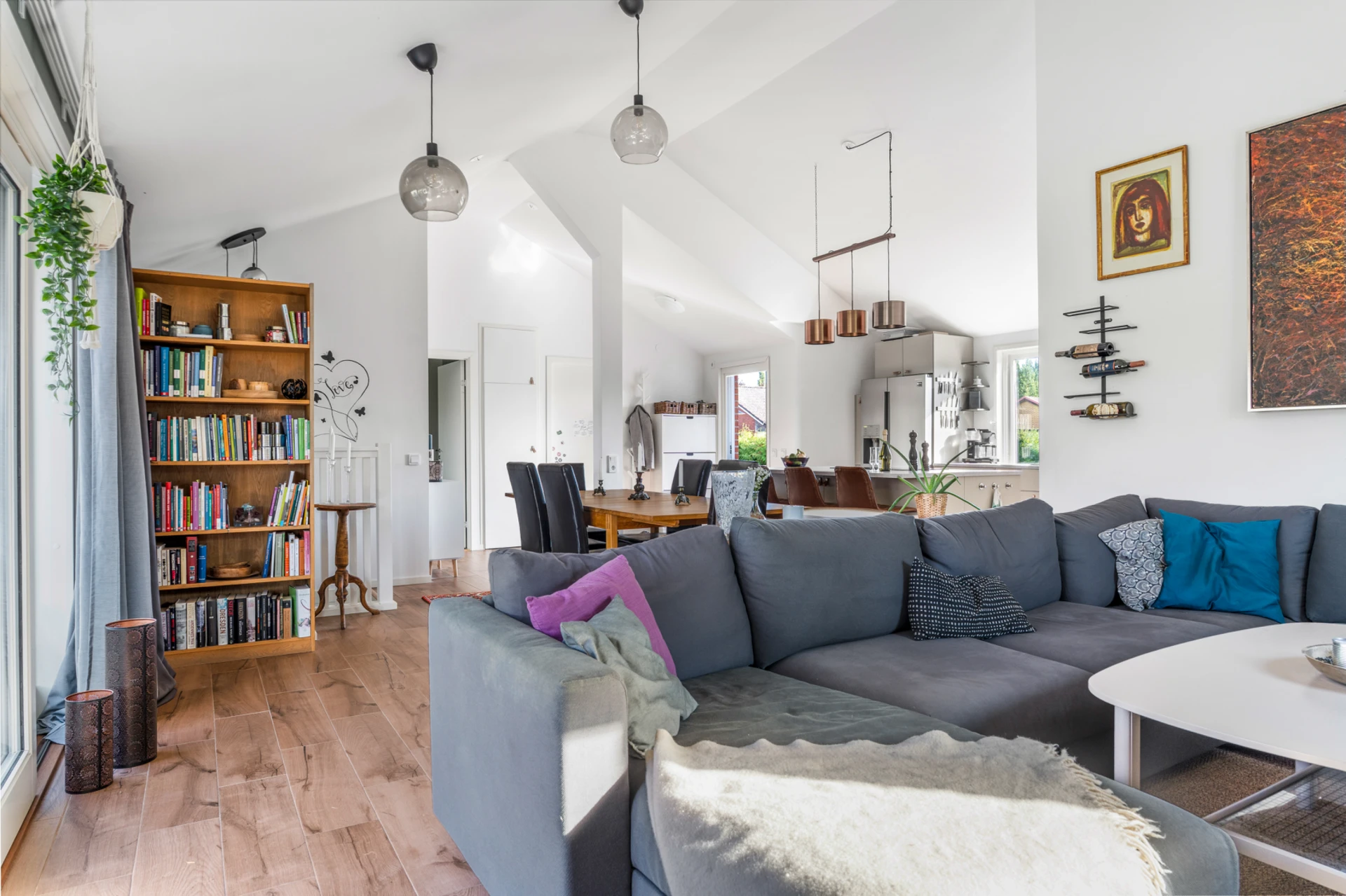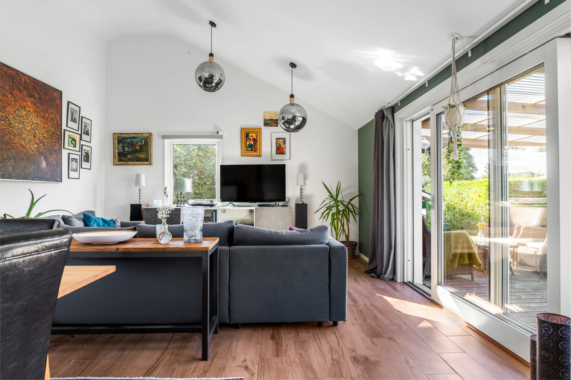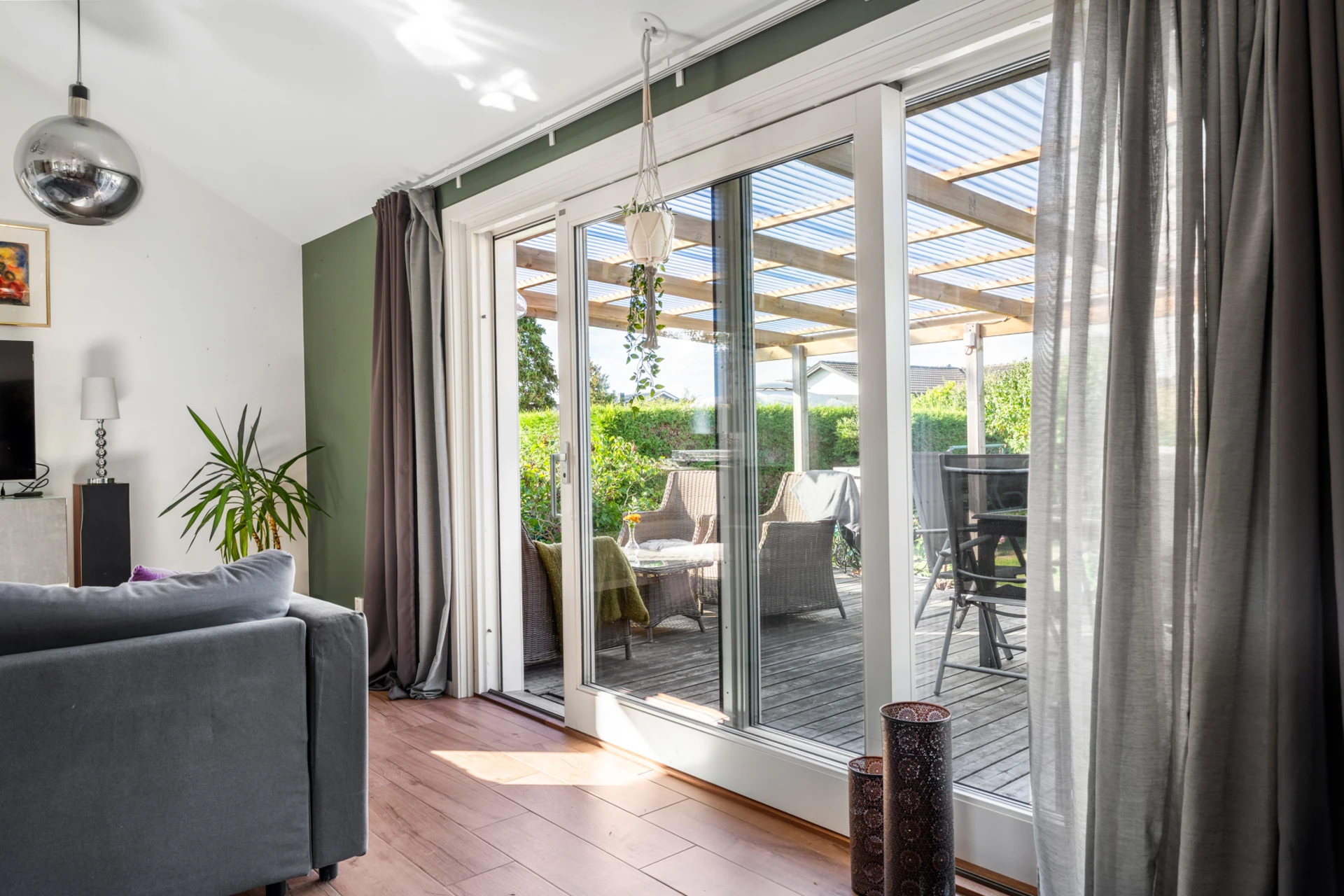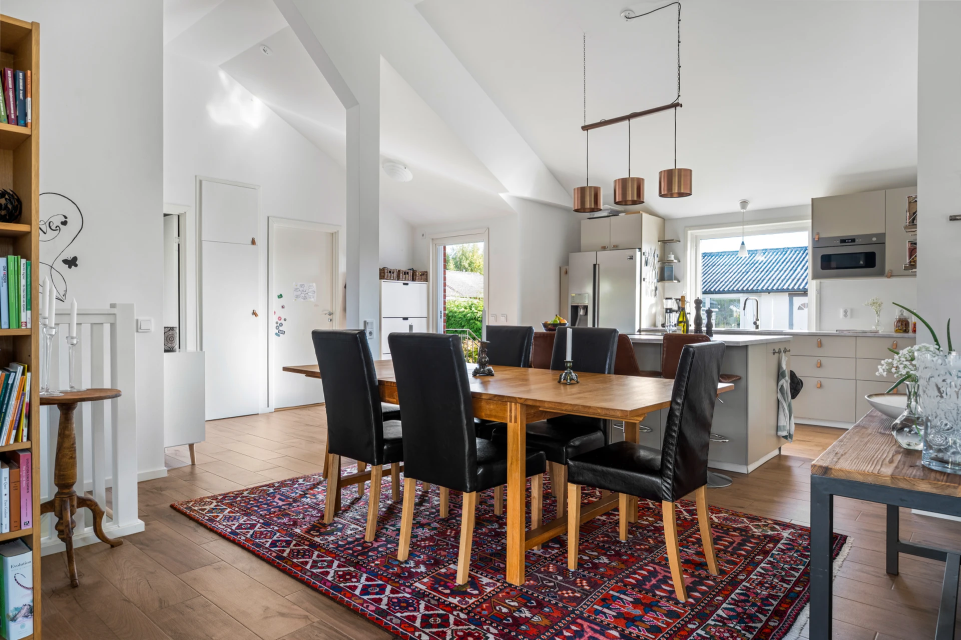Klinker på golvet med vattenburen golvvärme och vitmålade väggar med fondvägg med mörkgrön ton. Öppet upp i nock och utgång till altan i västerläge.