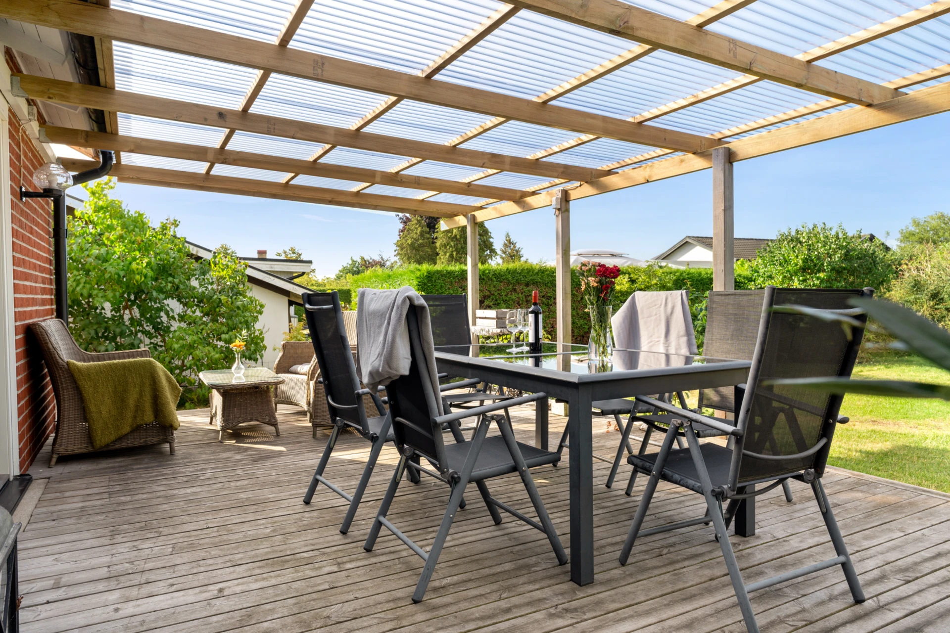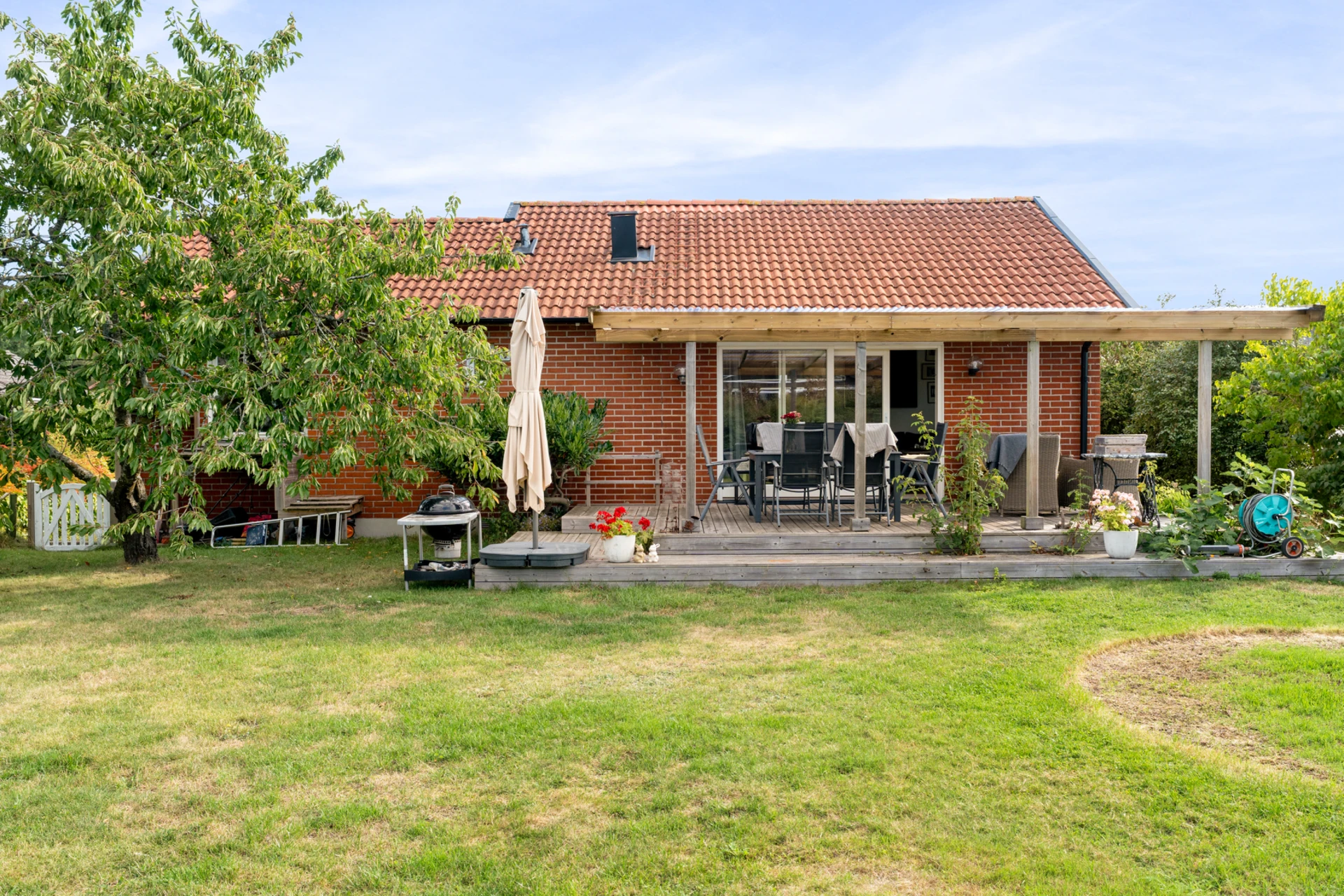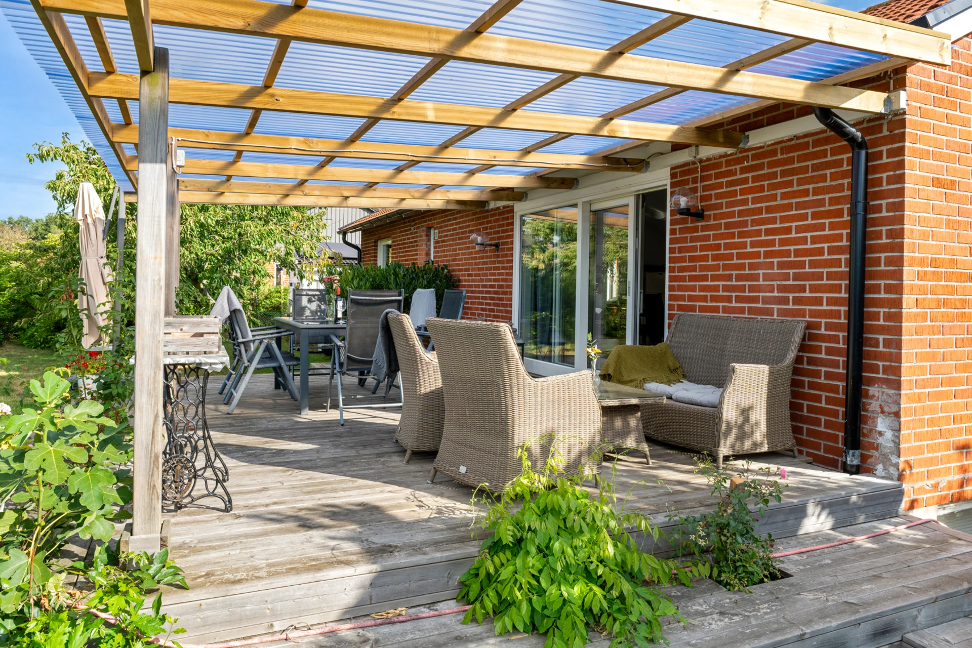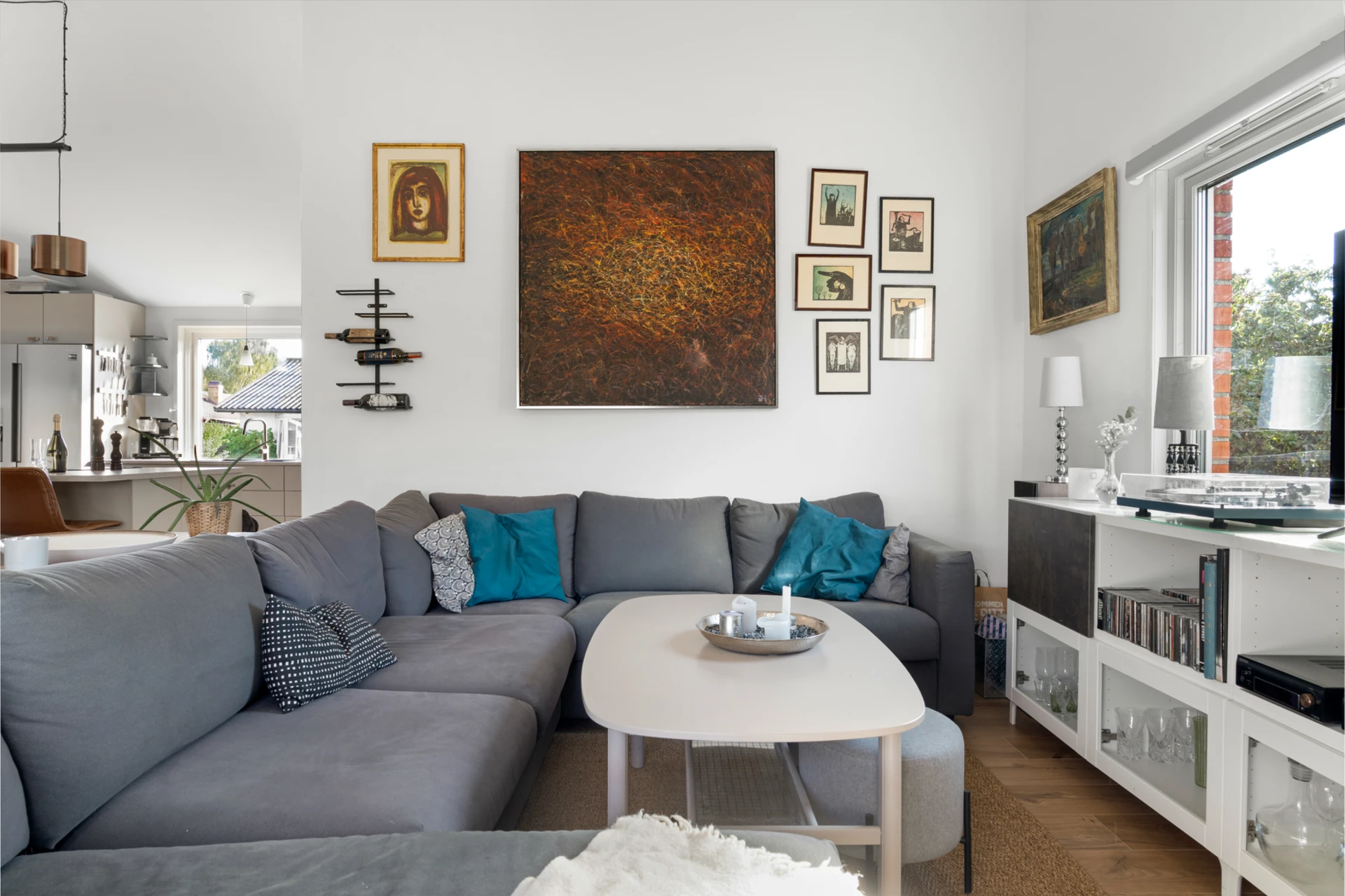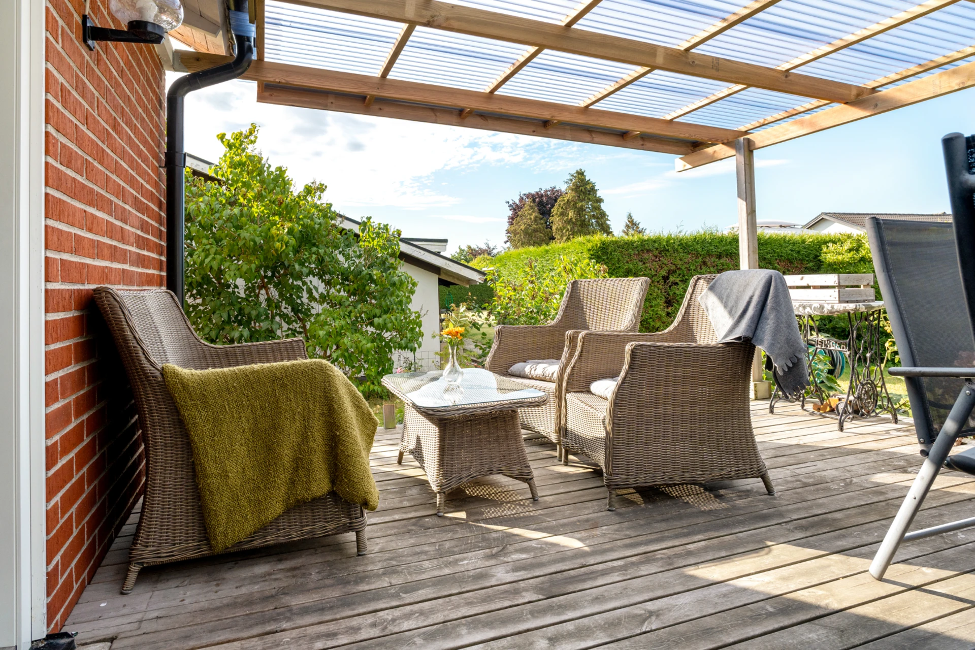 Klinker på golvet med vattenburen golvvärme och vitmålade väggar med fondvägg med mörkgrön ton. Öppet upp i nock och utgång till altan i västerläge.