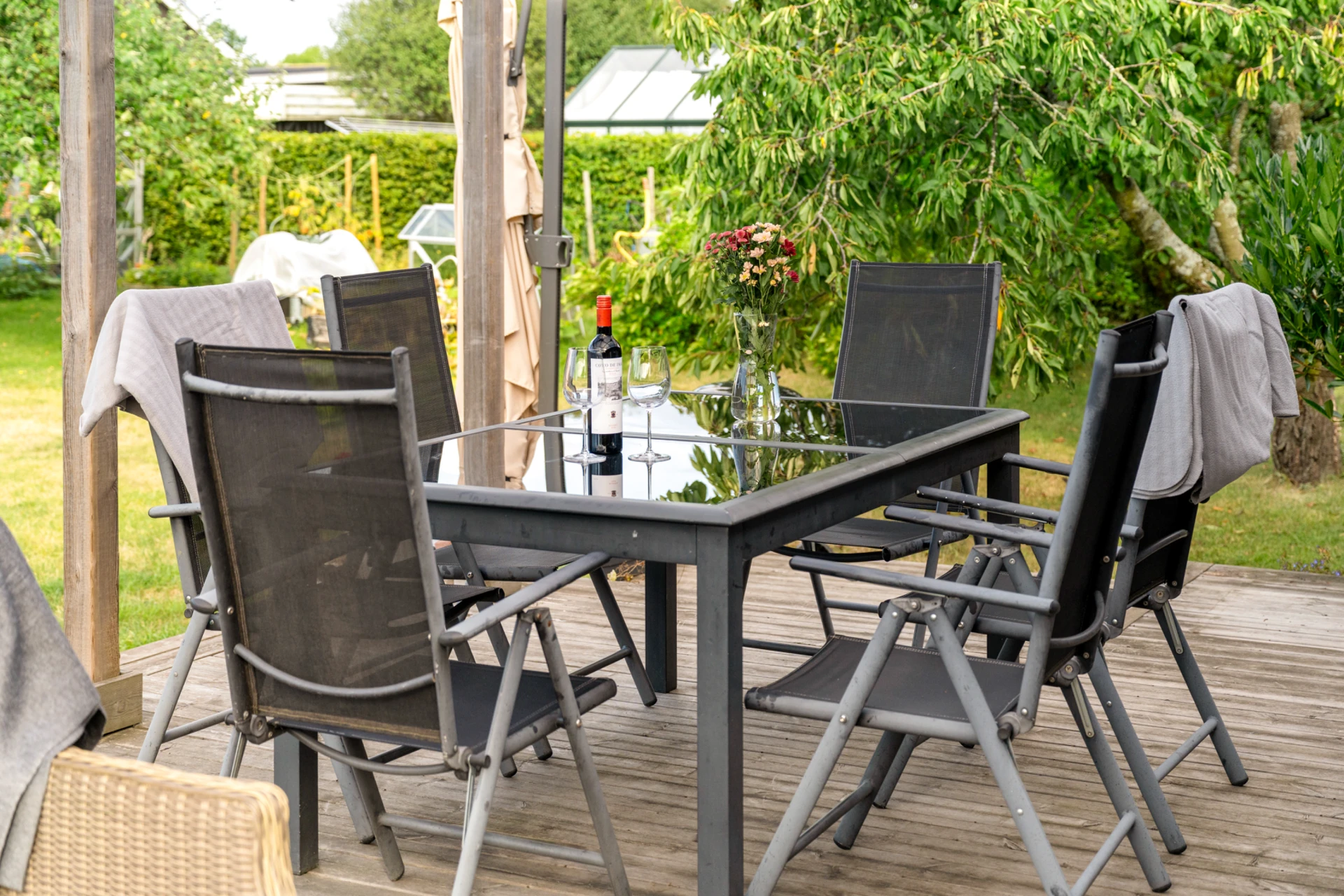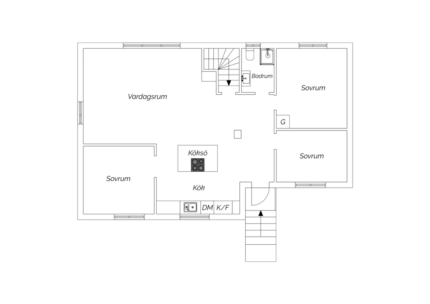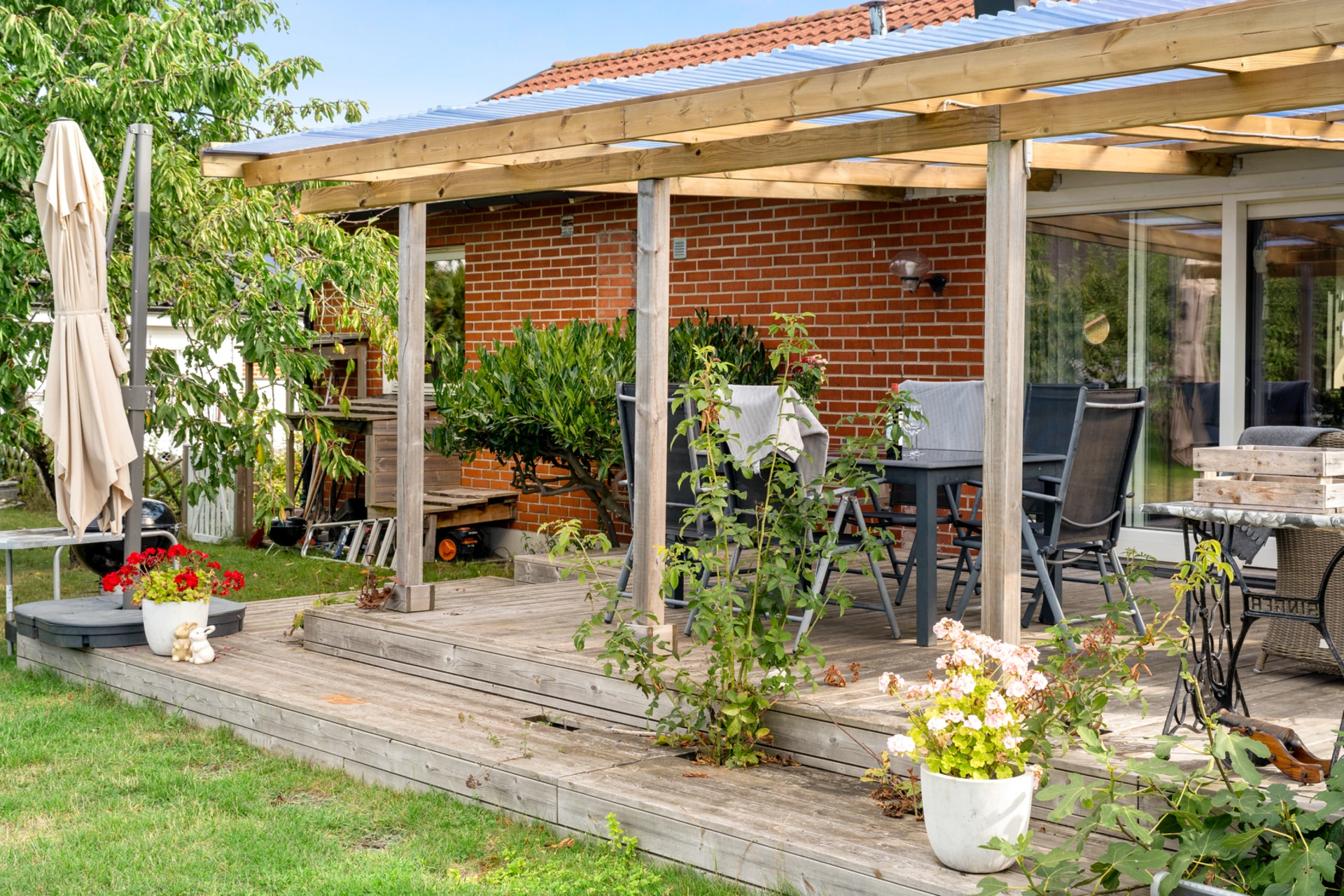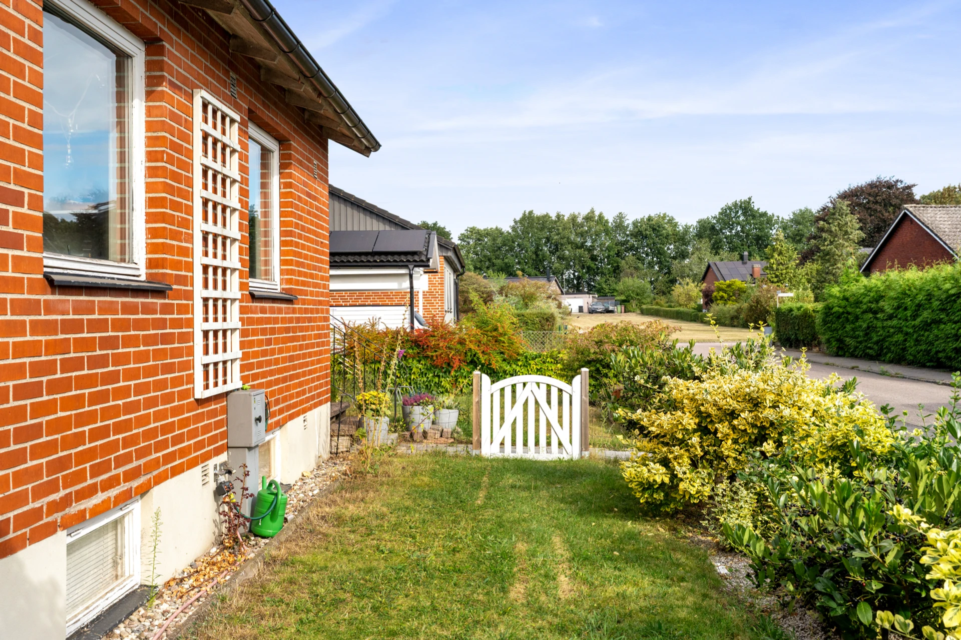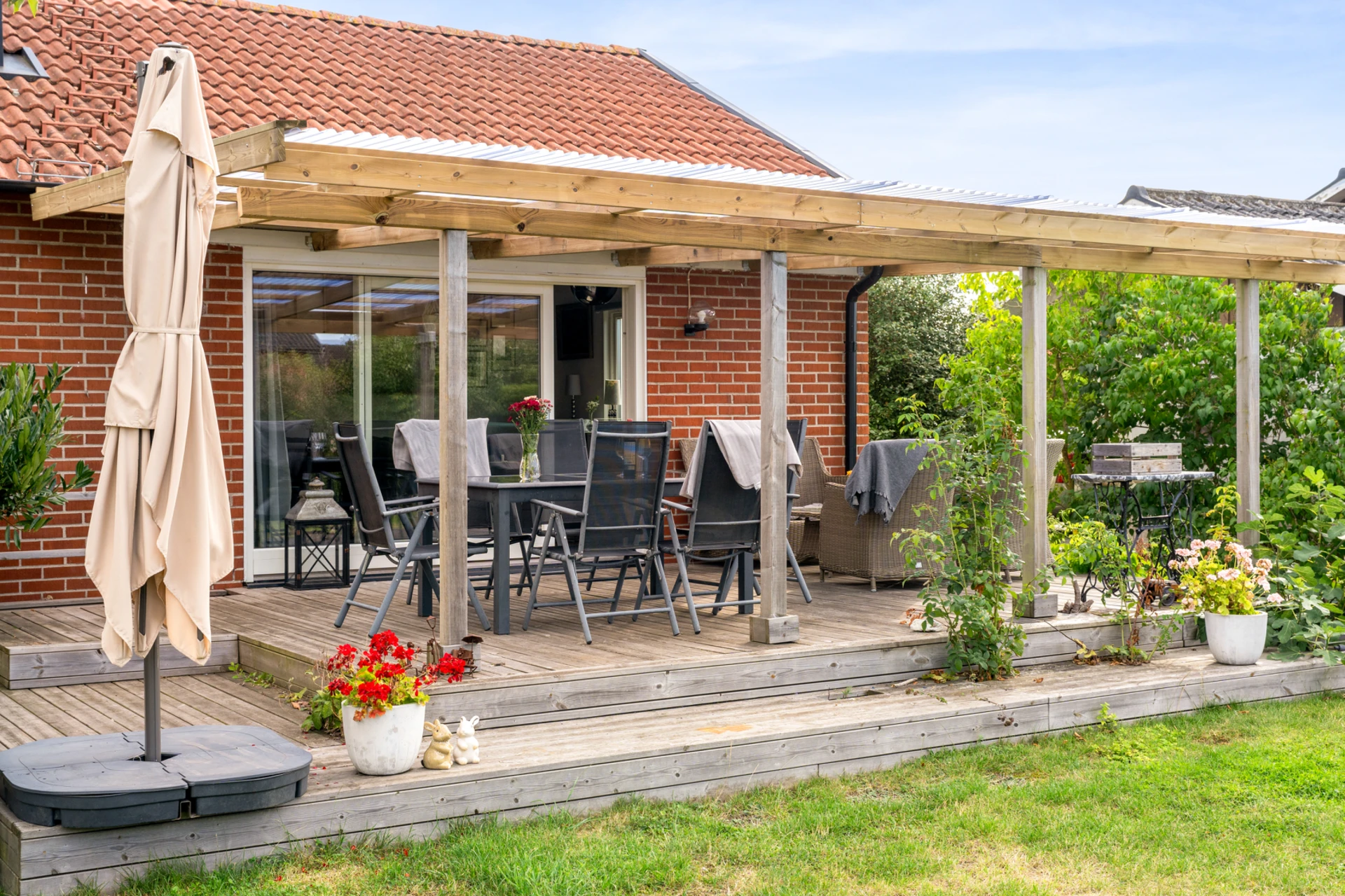 Klinker på golvet med vattenburen golvvärme och vitmålade väggar med fondvägg med mörkgrön ton. Öppet upp i nock och utgång till altan i västerläge.