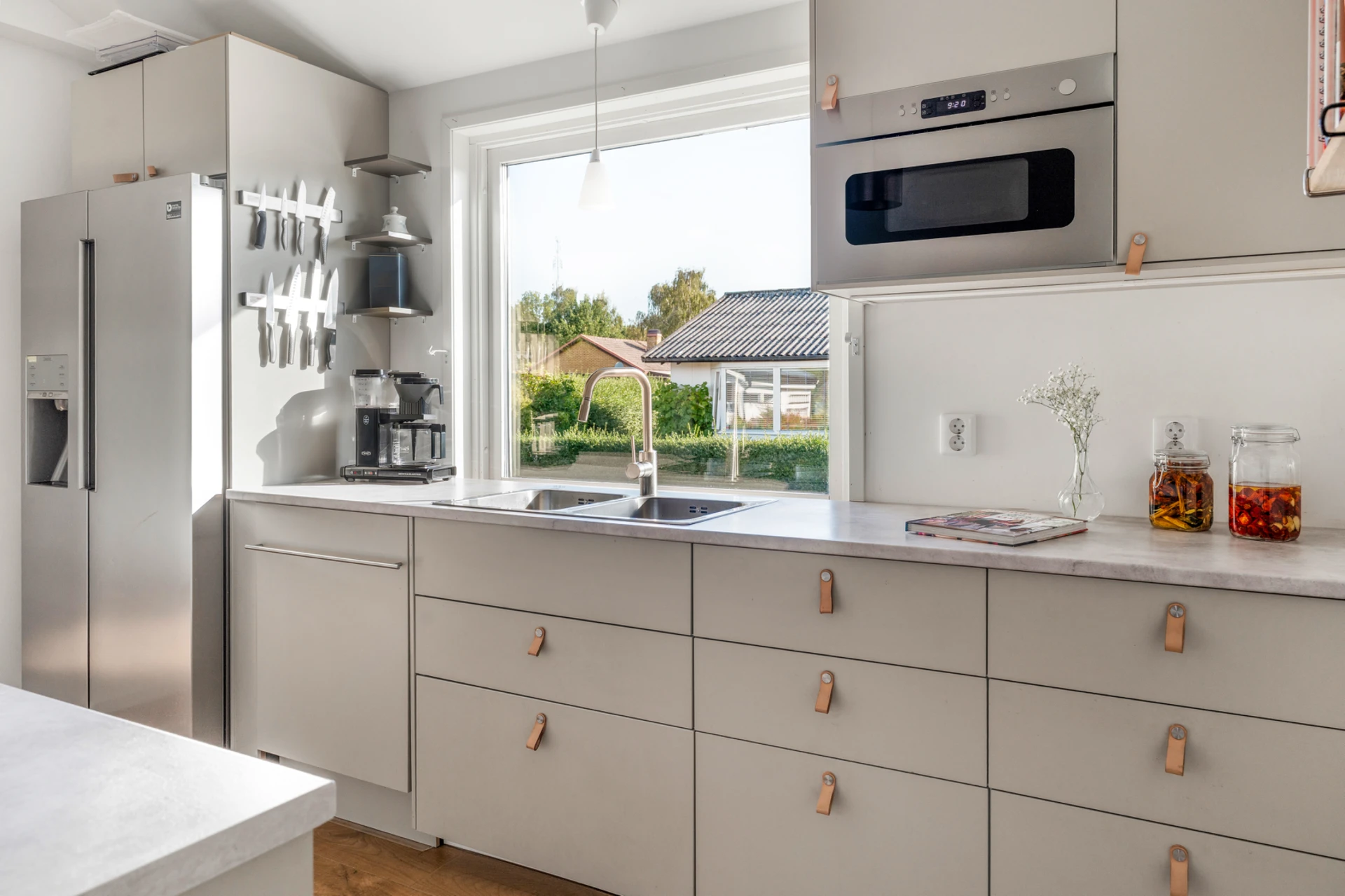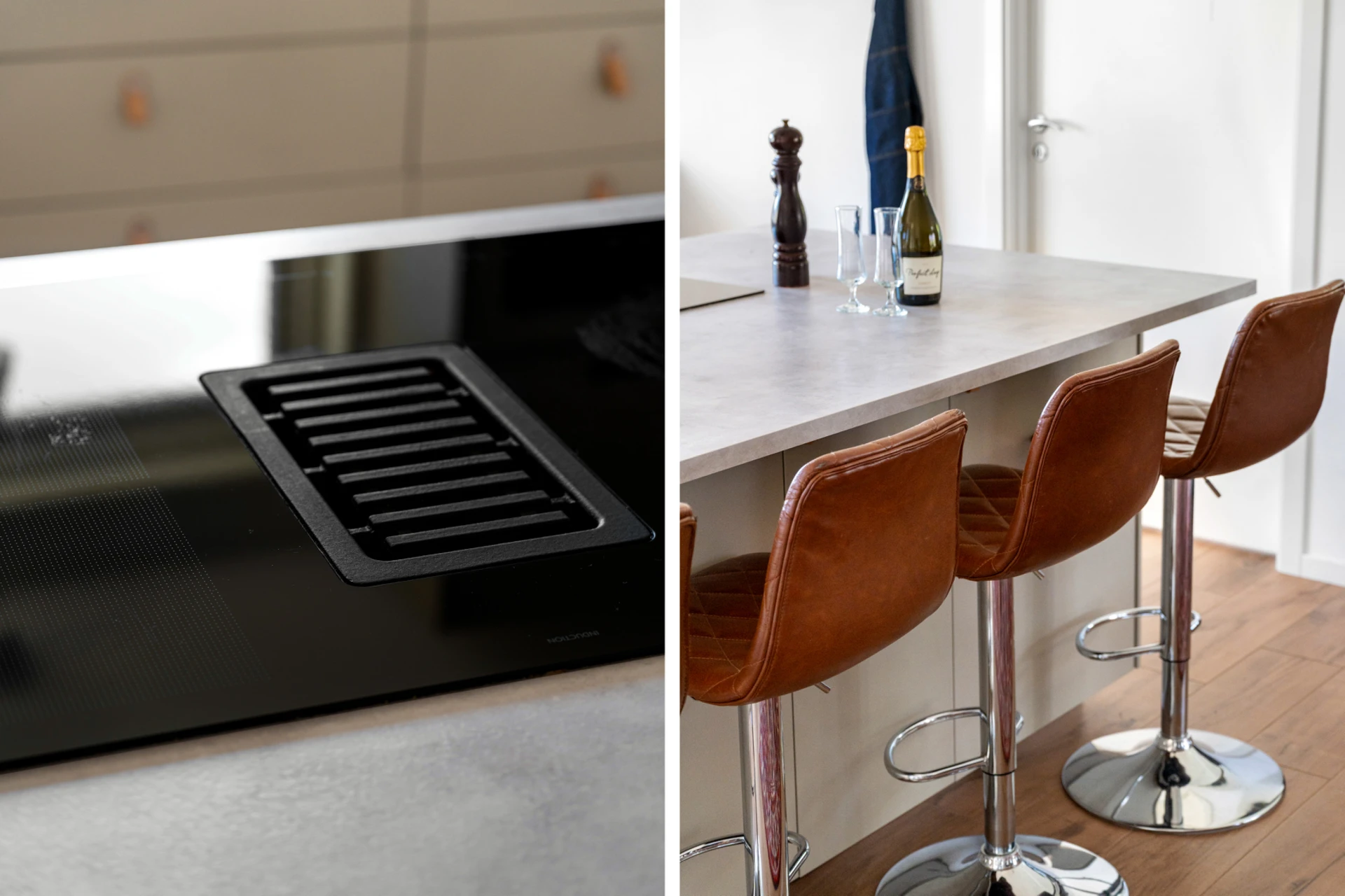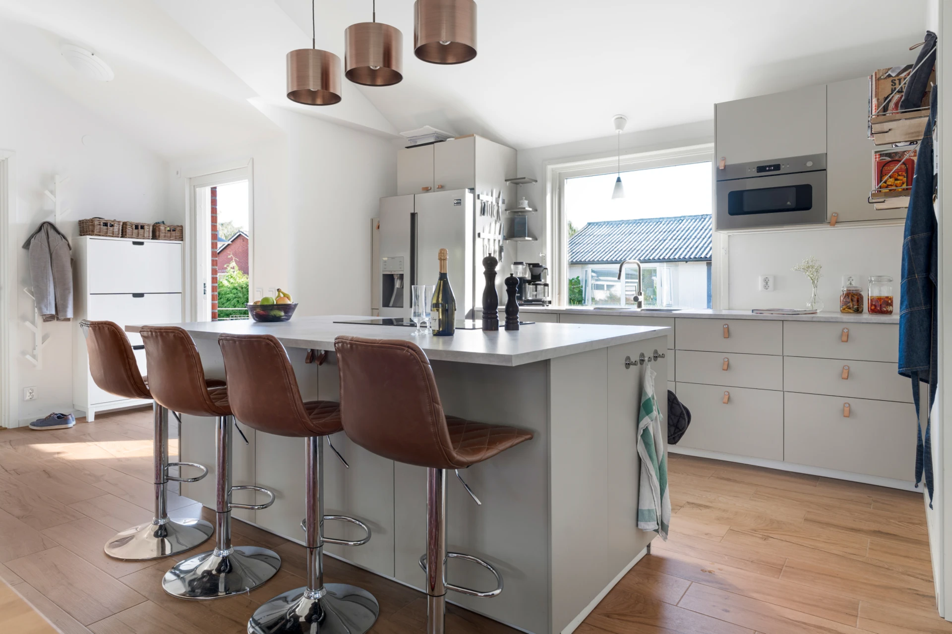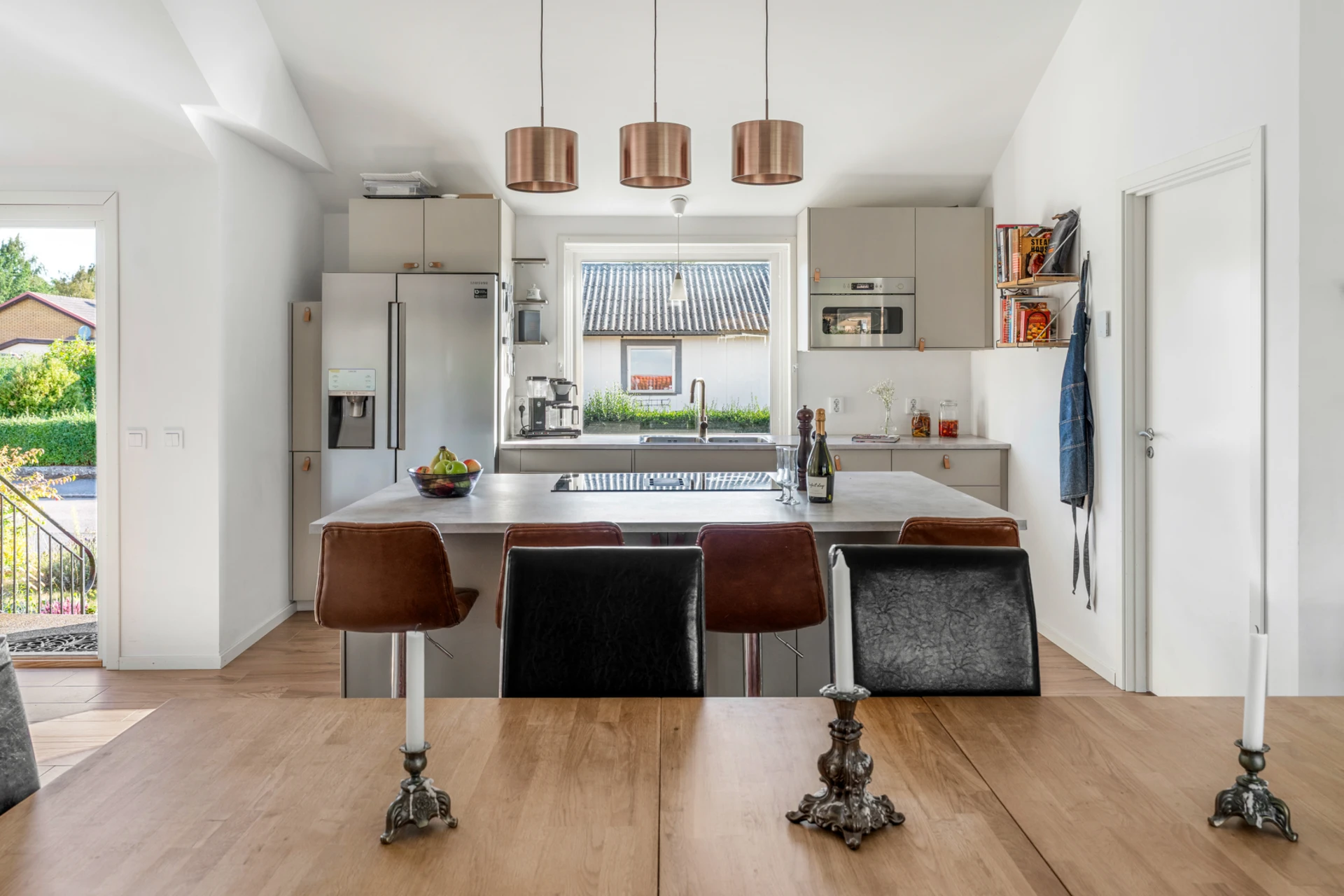 Klinker på golvet med vattenburen golvvärme och vitmålade väggar. Beige köksinredning från IKEA (2022) och ljus komposit bänkskiva. Köket är inrett med induktionshäll med inbyggd fläkt (IKEA, 2022), inbyggd varmluftsugn (IKEA, 2022), mikrovågsugn (IKEA, 2022) och diskmaskin (2025), inbyggt skafferi, kyl och frys (Samsung, 2017). Stor köksö med sittplatser.