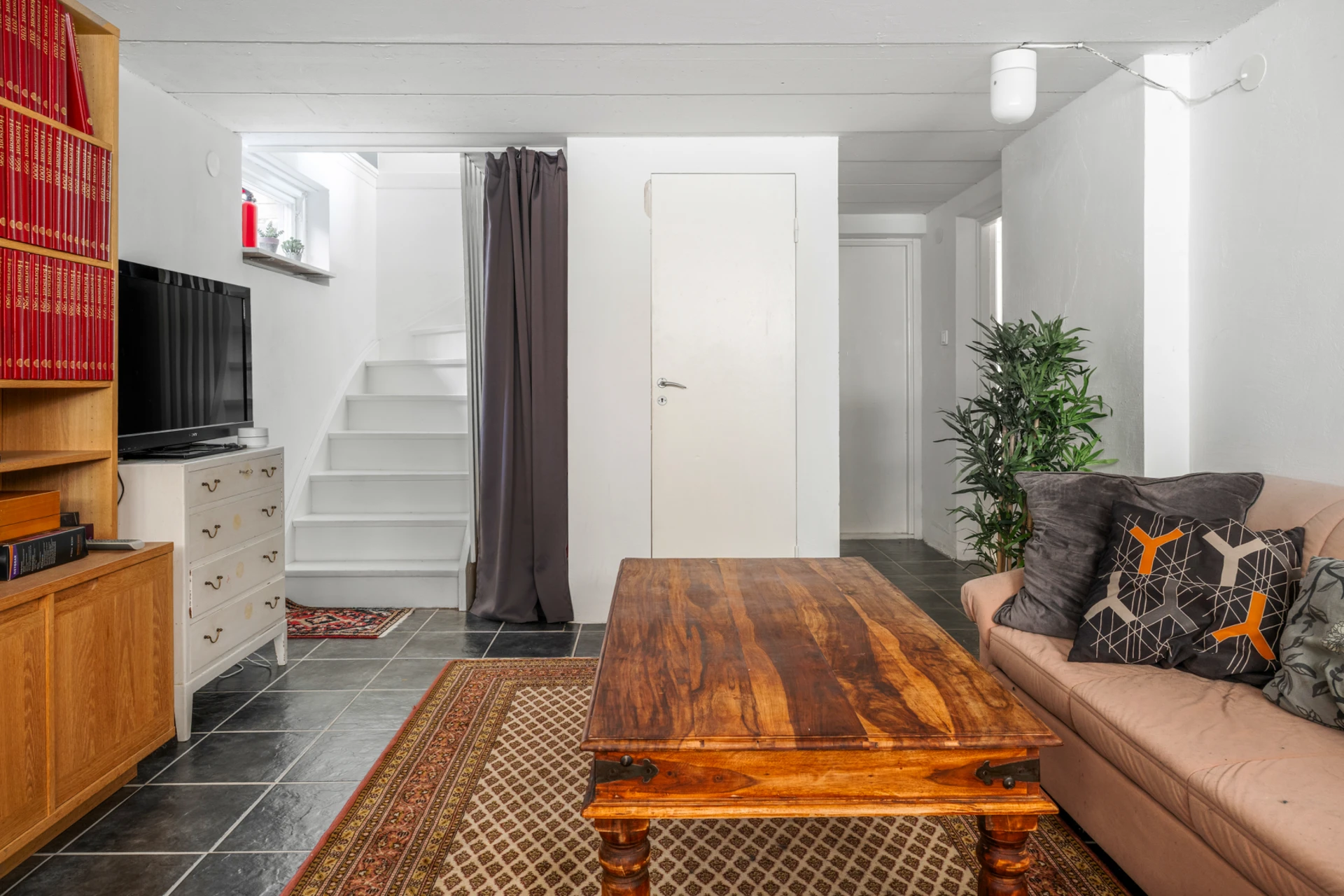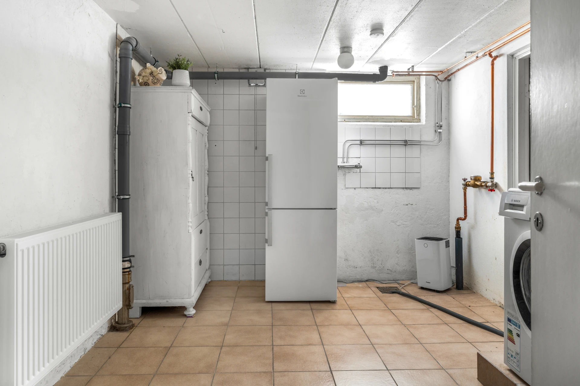 Klinker på golvet och vitmålade väggar. Utrustat med tvättmaskin, torktumlare samt avfuktare och bra plats för klädtorkning.