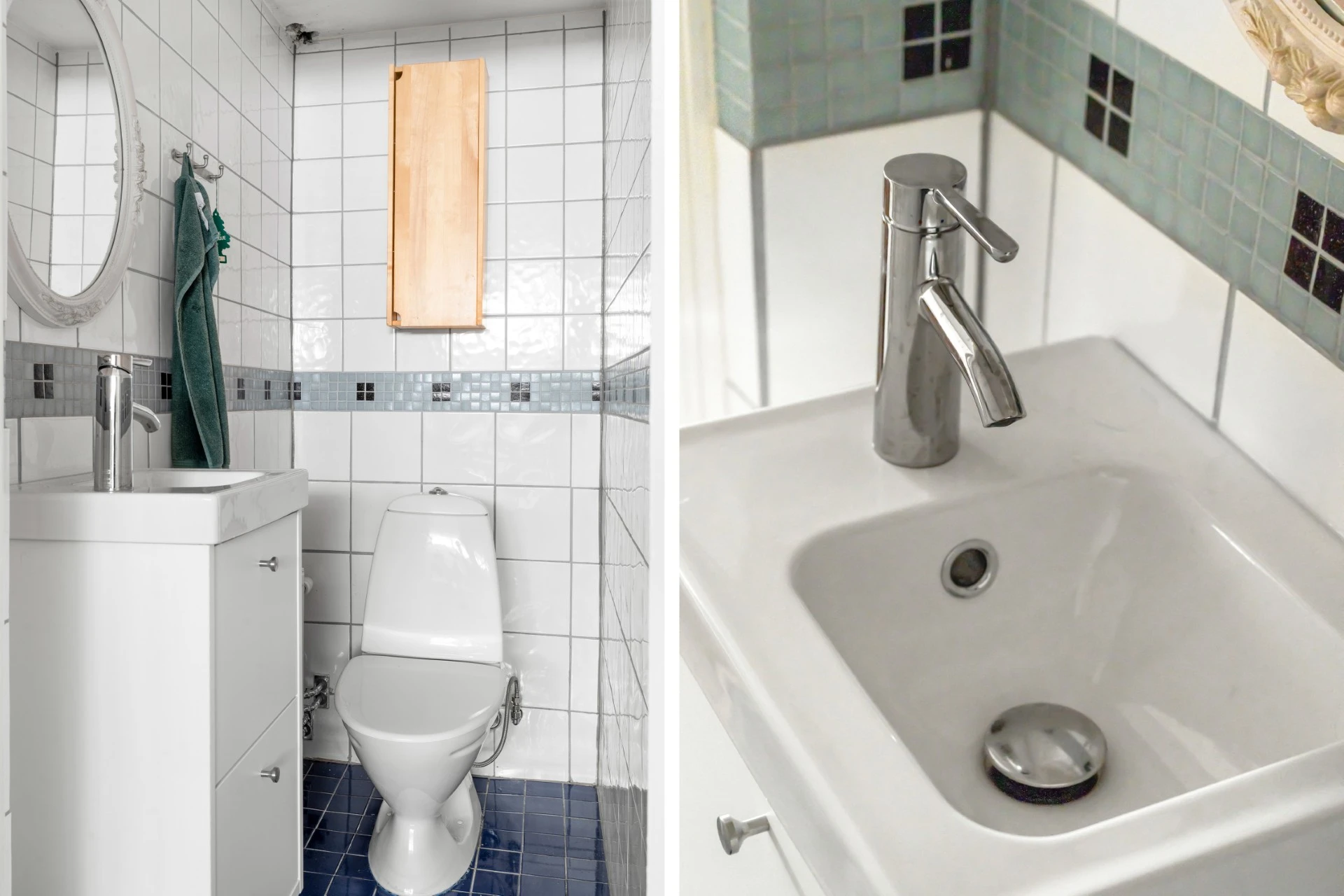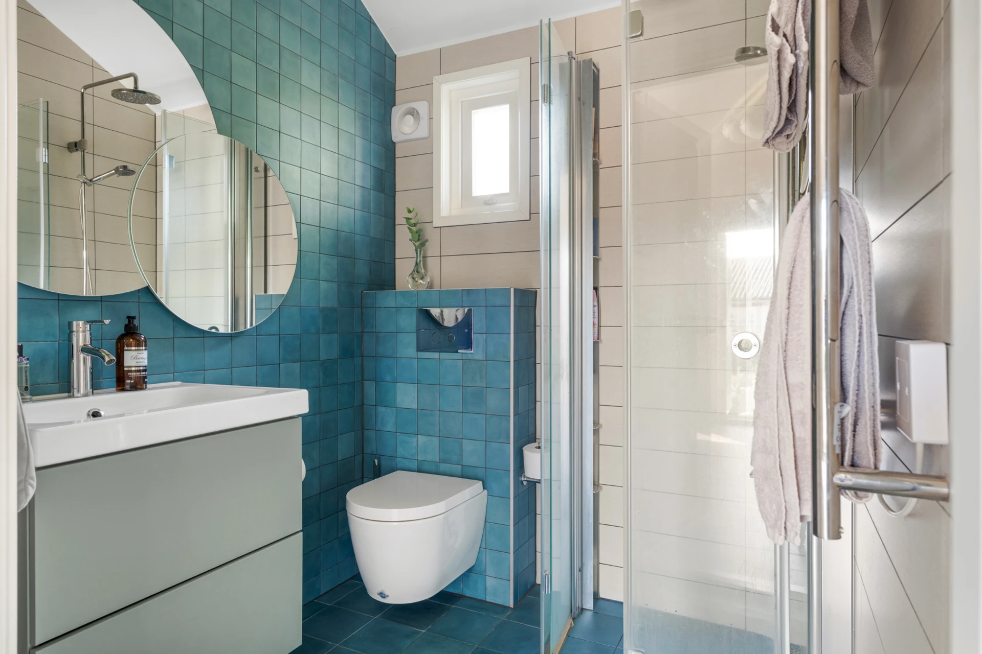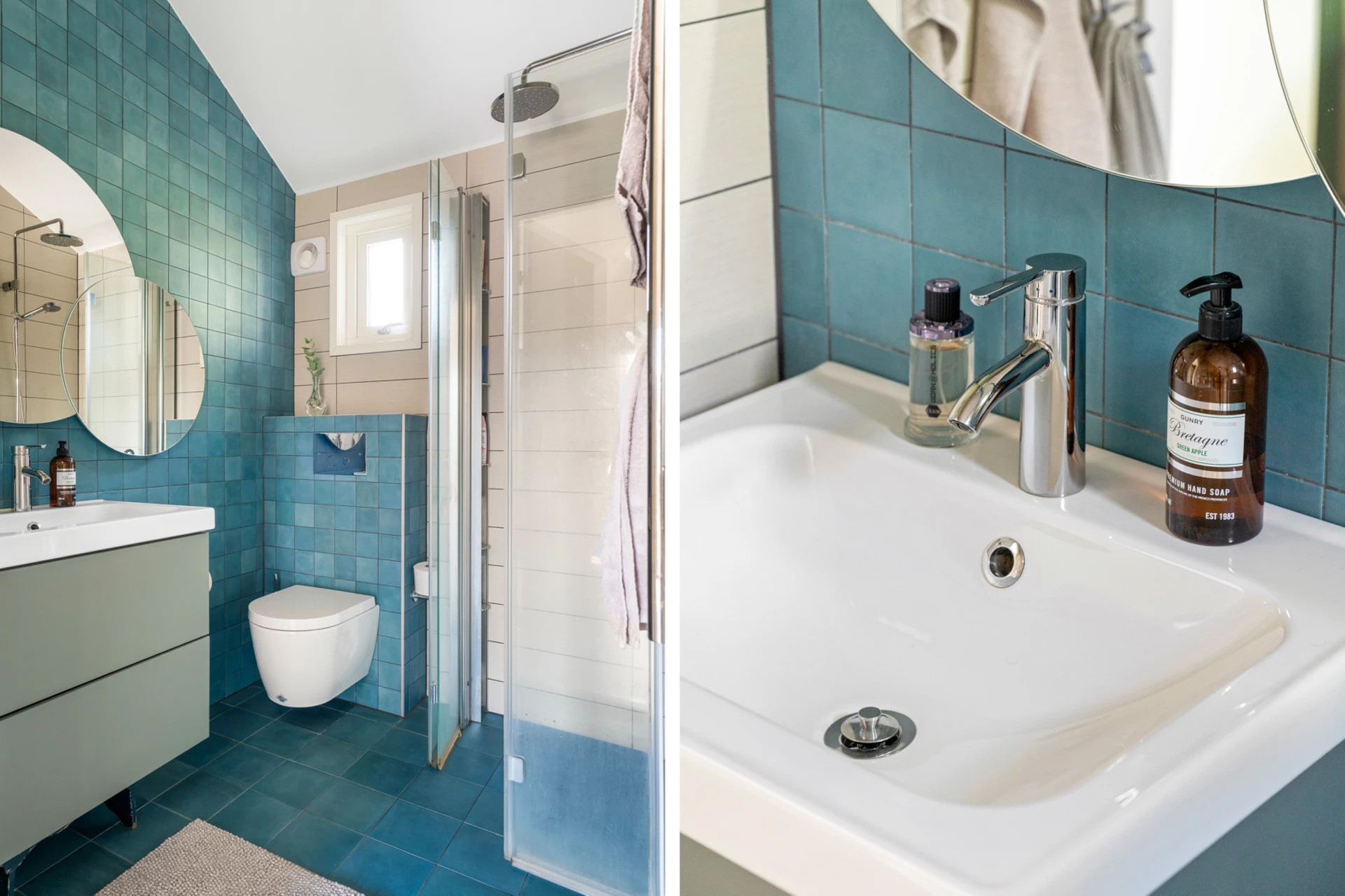 Blått klinker på golvet med elburen golvvärme och blått/vitt kakel på väggarna. Badrummet är inrett med vägghängd WC, handfat med kommod, spegel, handdukstork, takdusch med vikbara glasdörrar och infällda spotlights.