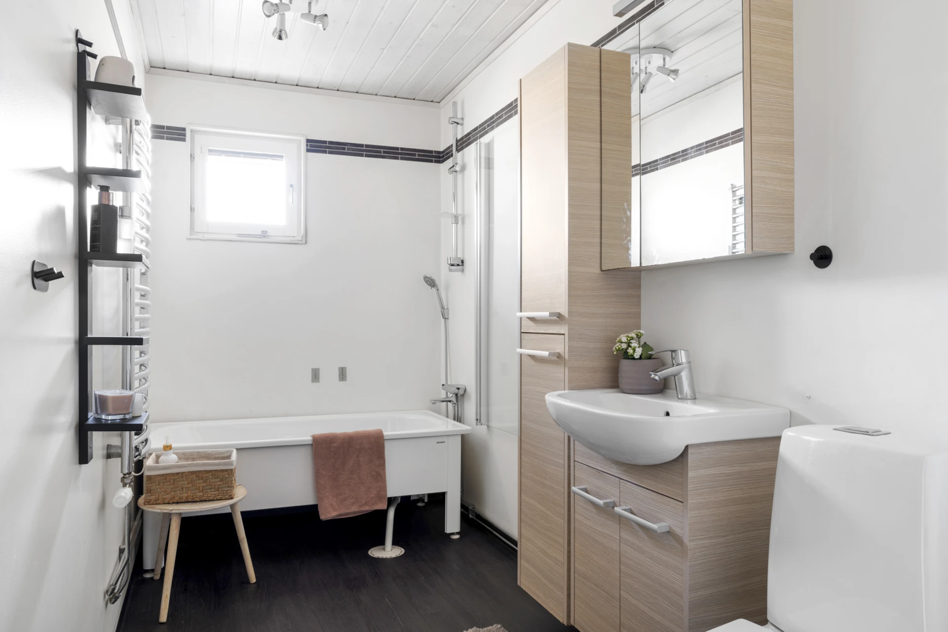 Mörk våtrumsmatta på golvet och ljus våtrumstapet. Utrustat med handfat med kommod, spegelskåp, högskåp, handdukstork, WC samt badkar.