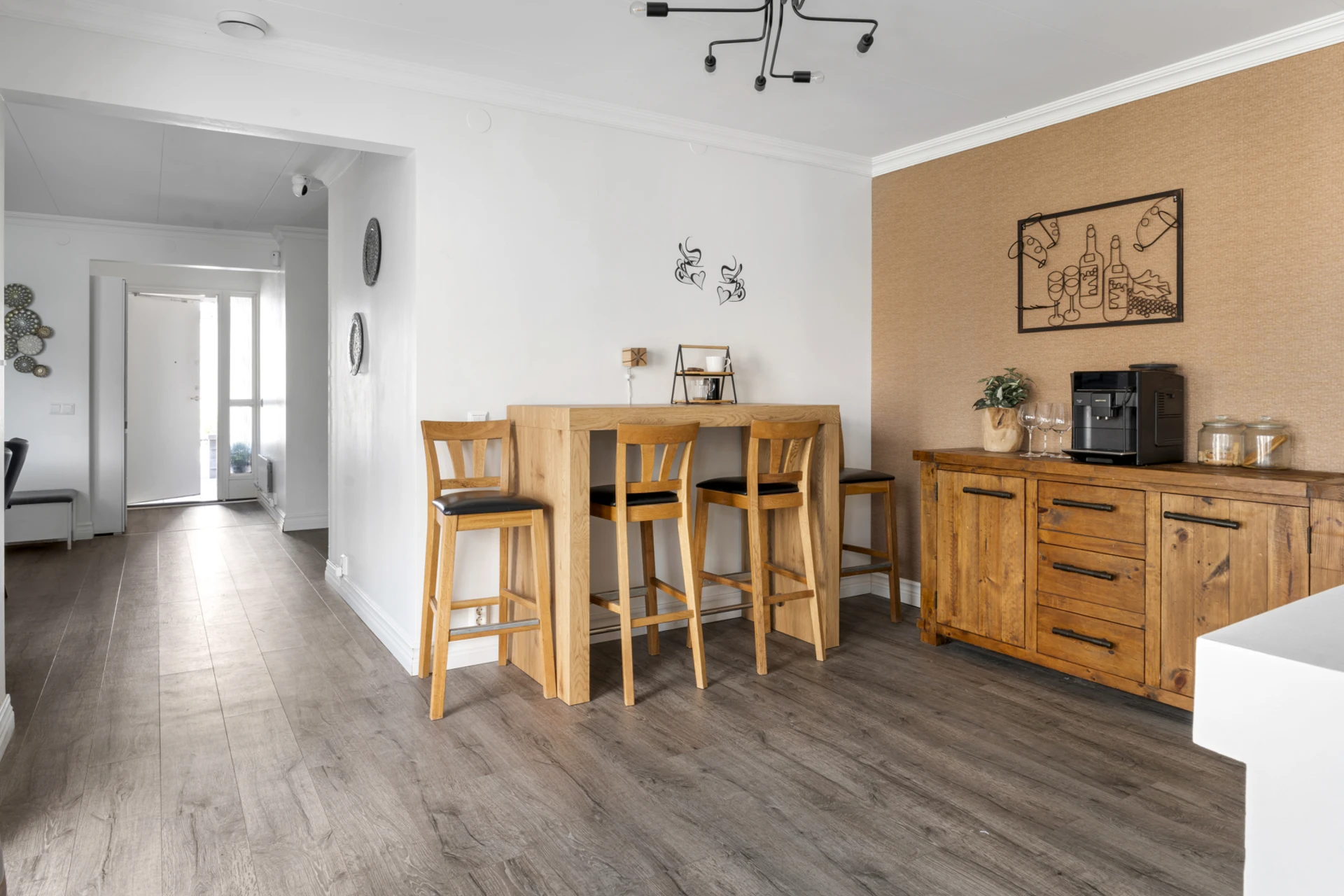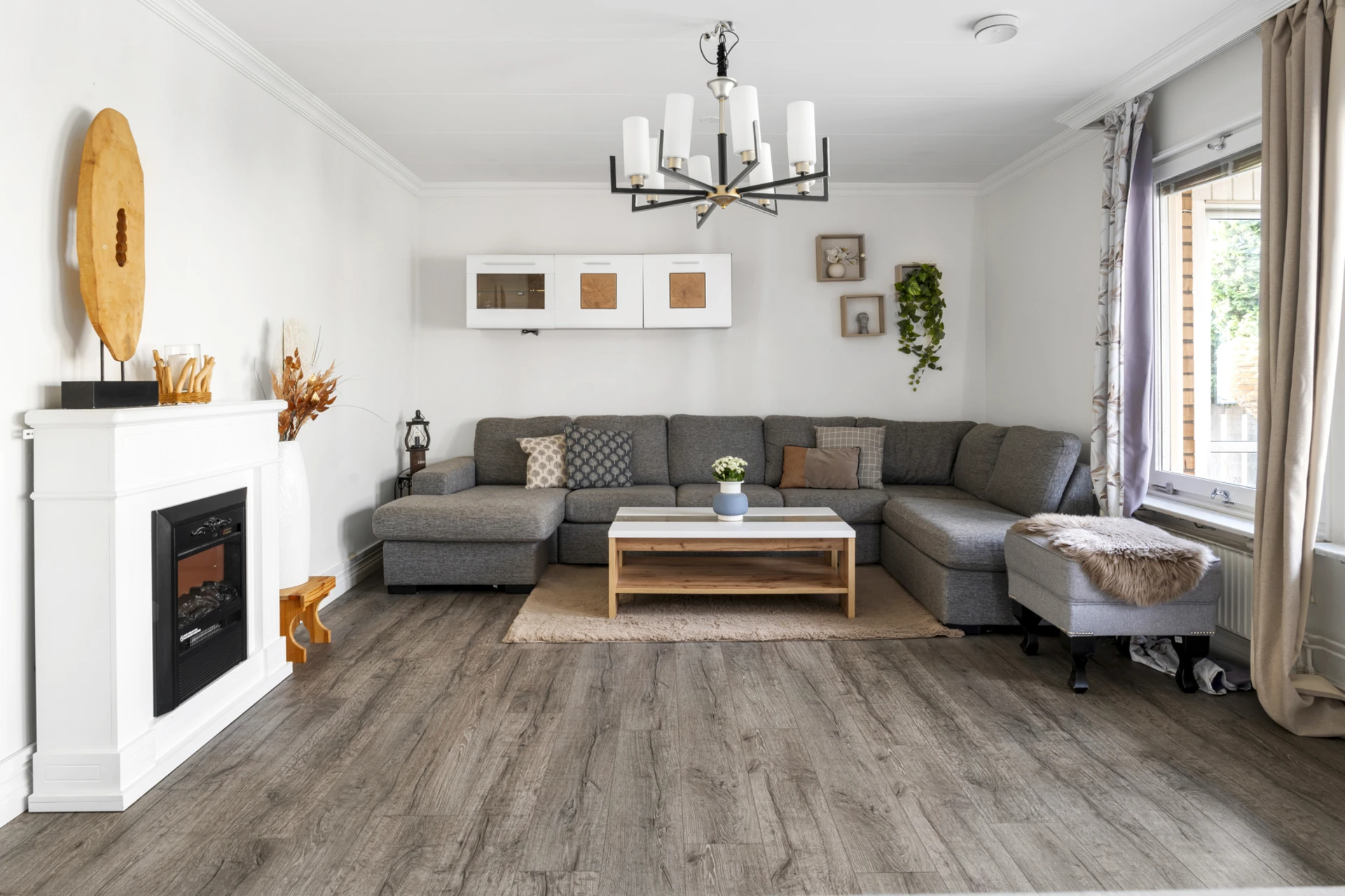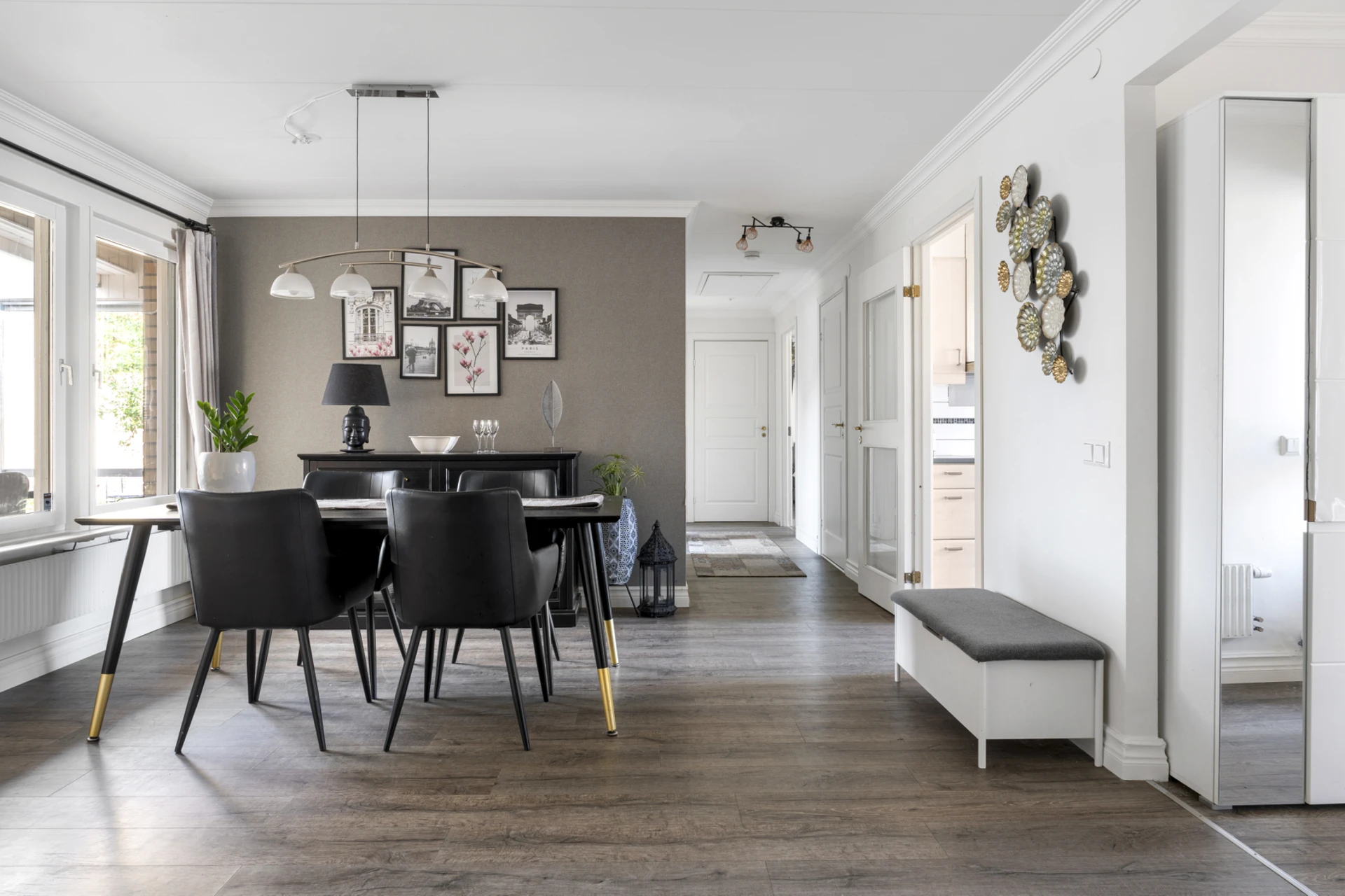 Mörkt laminatgolv och ljusa väggar med fondvägg.