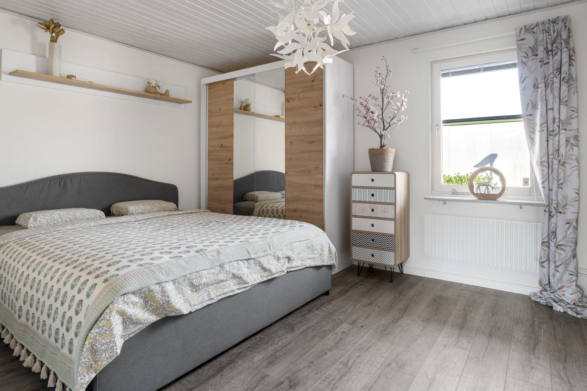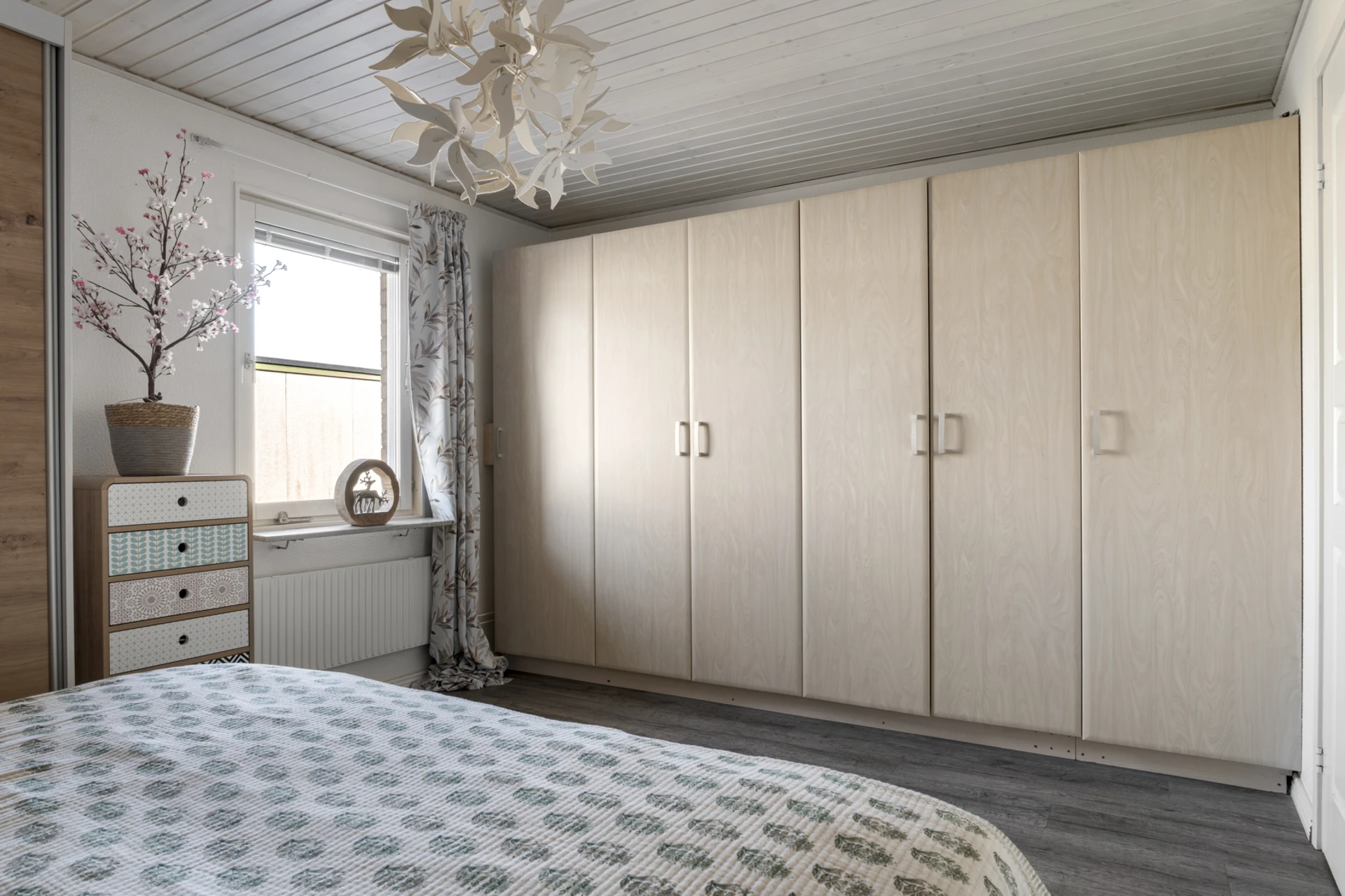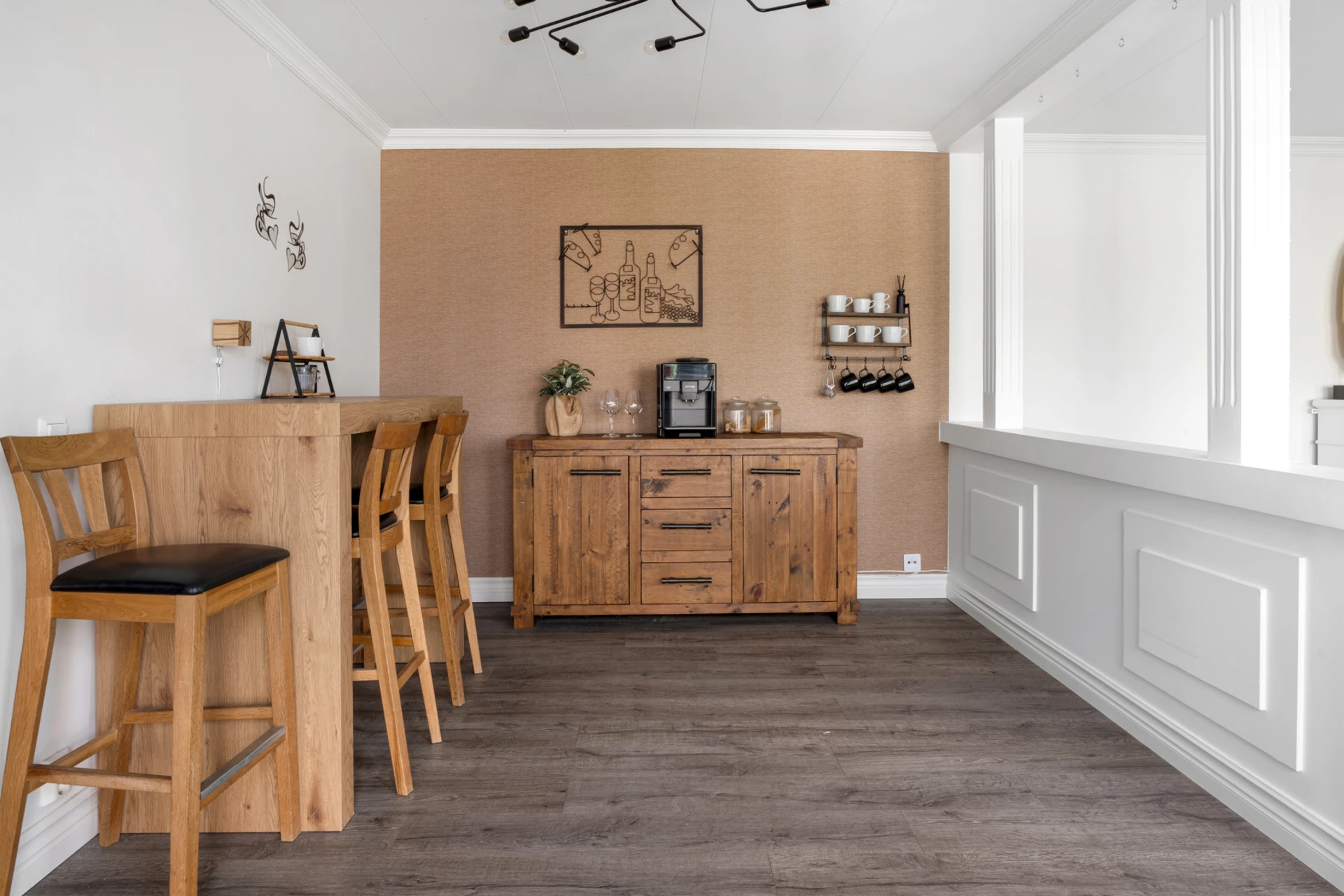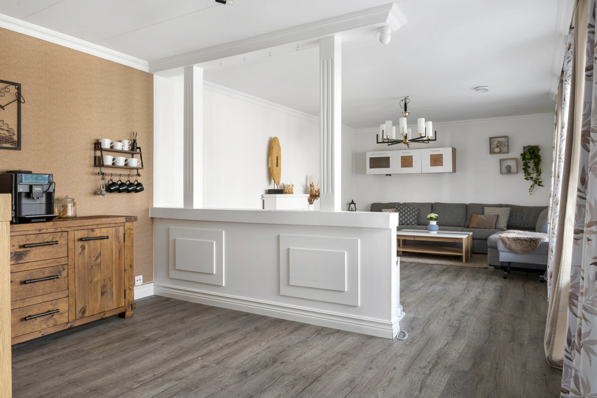 Mörkt laminatgolv och ljusa väggar med fondvägg.