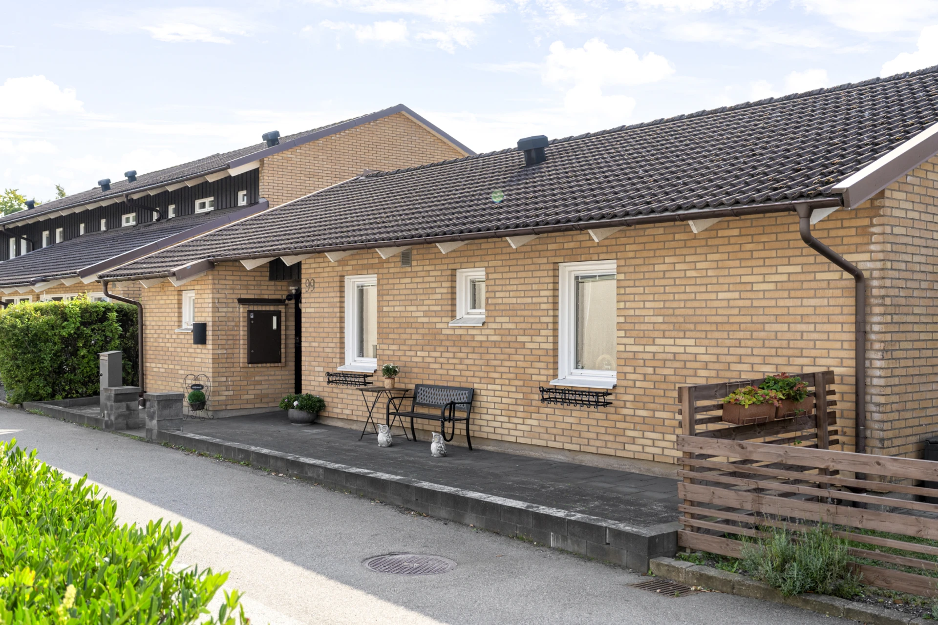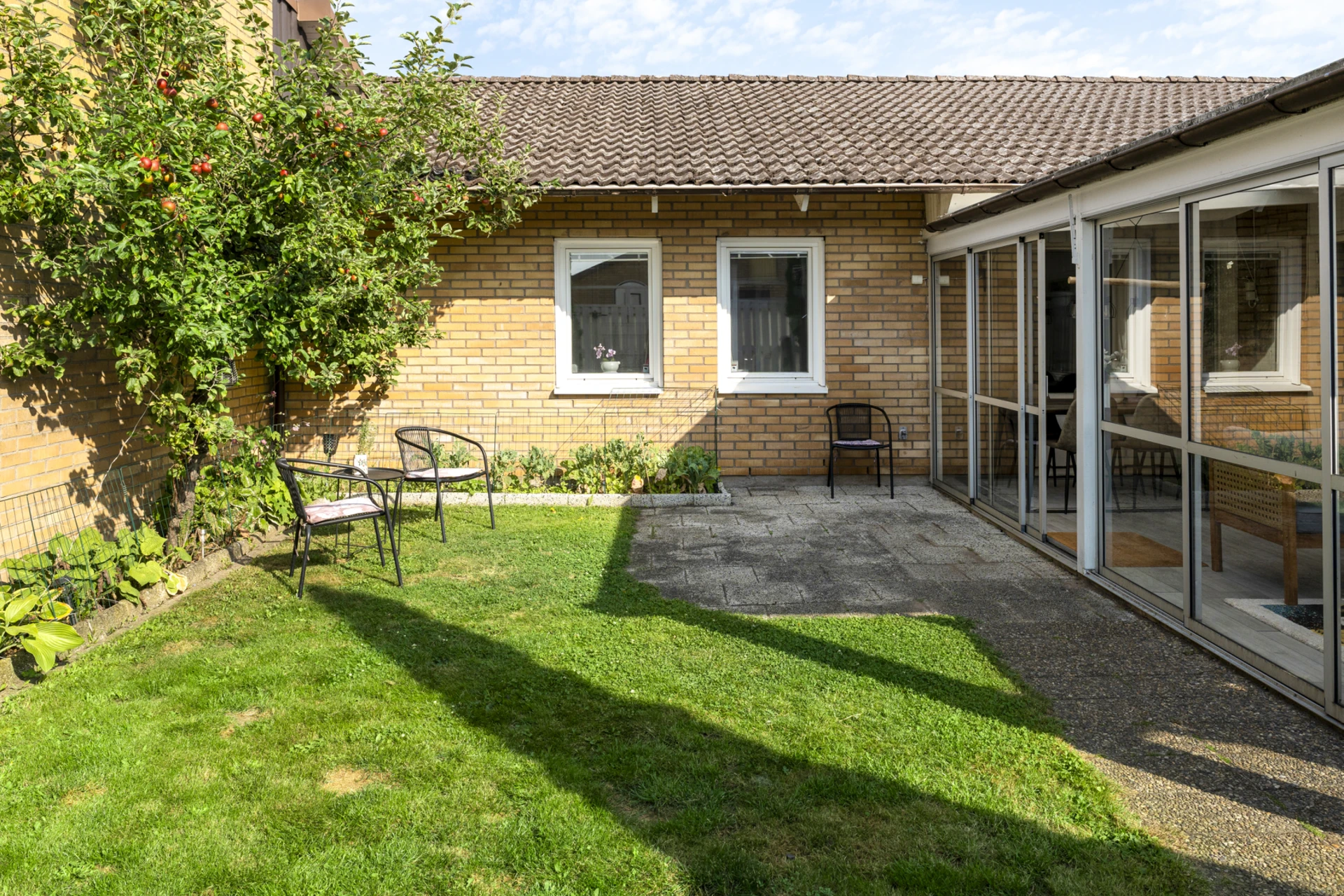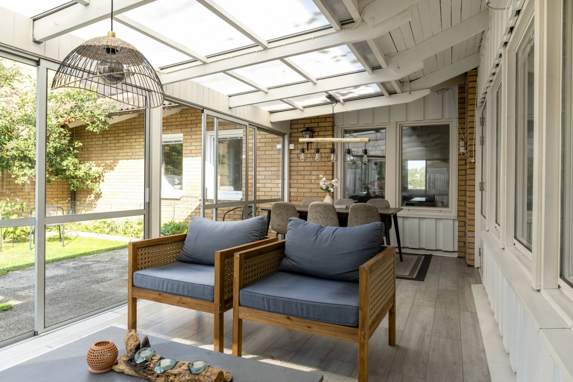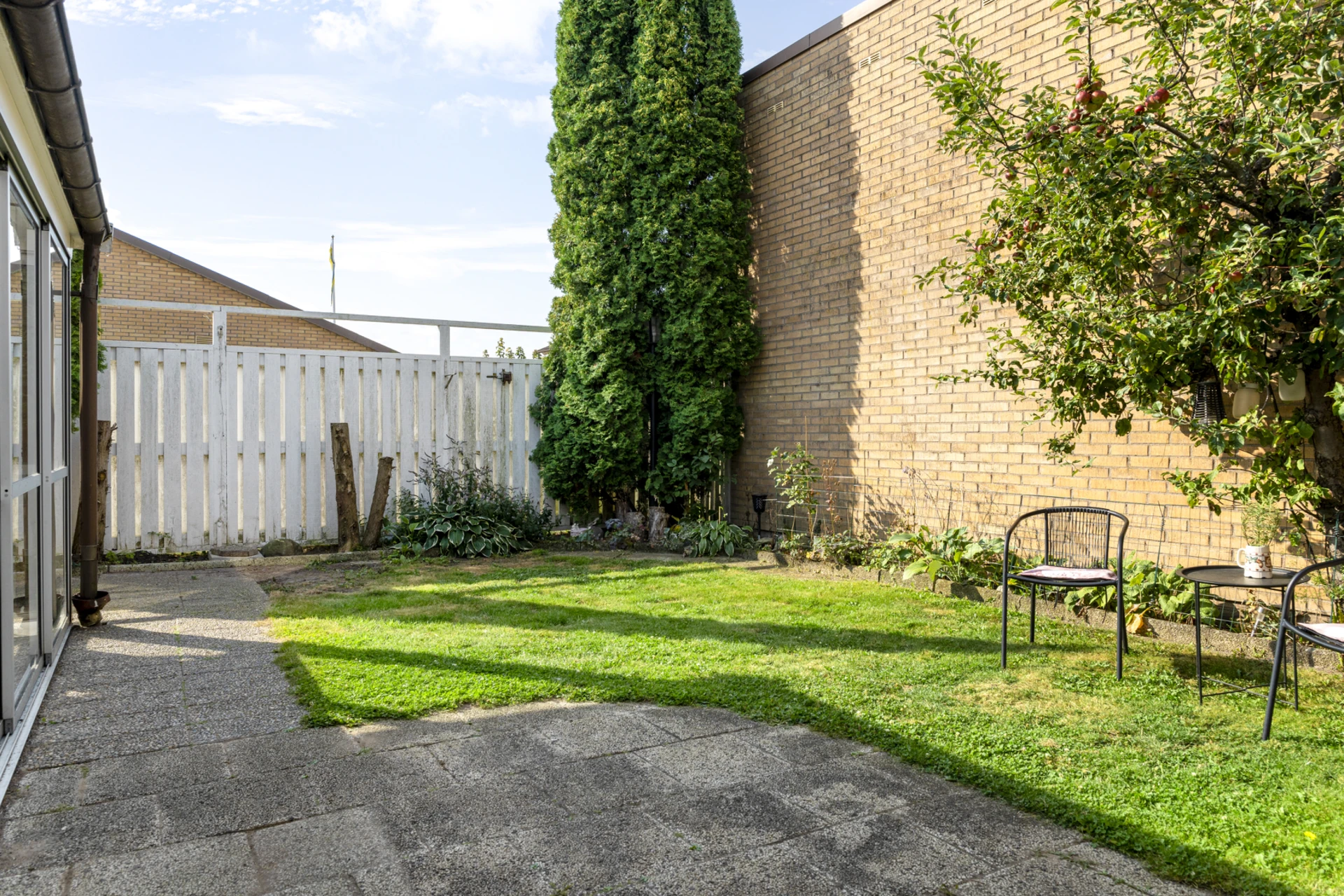 Stort uterum i söderläge. Från uterummet nås en insynsskyddad och grönskande trädgård.
