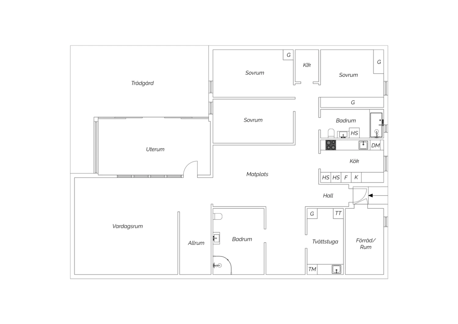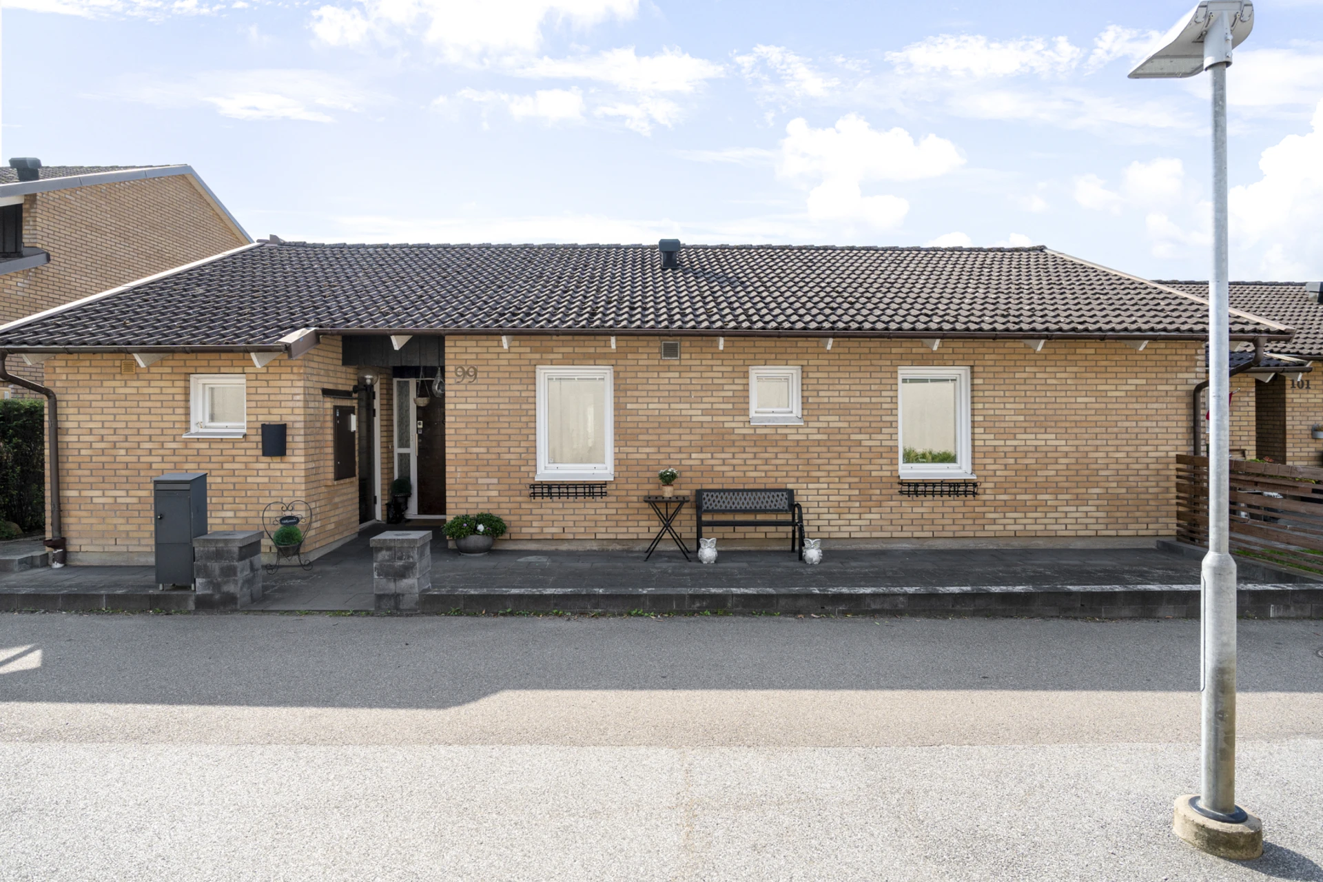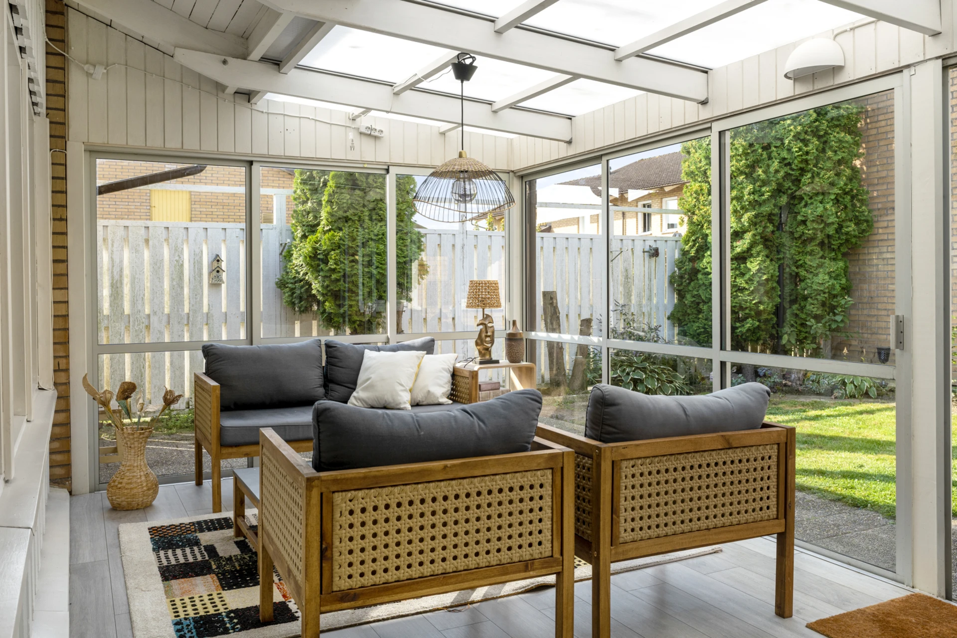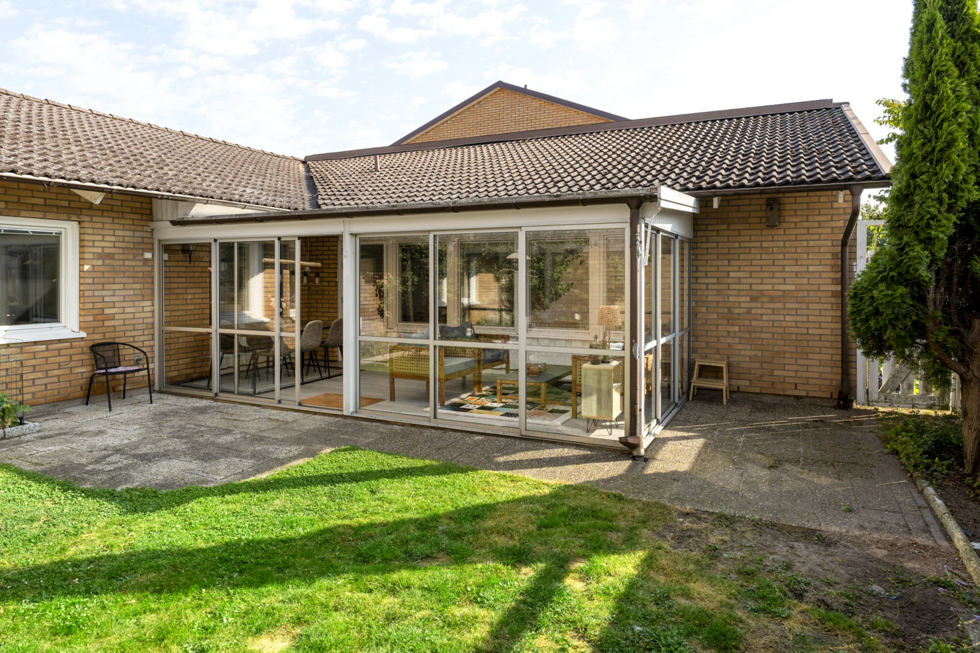 Stort uterum i söderläge. Från uterummet nås en insynsskyddad och grönskande trädgård.
