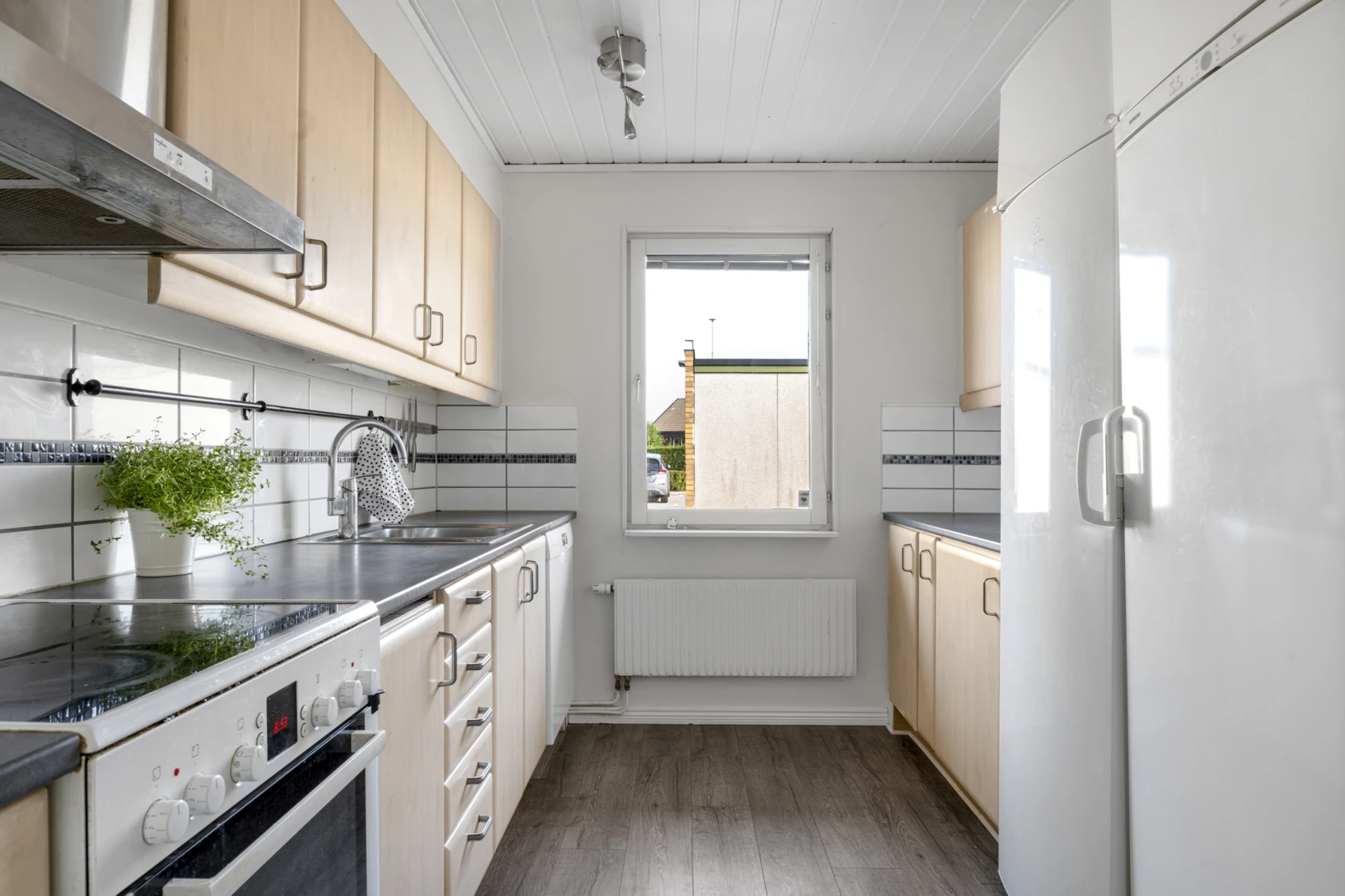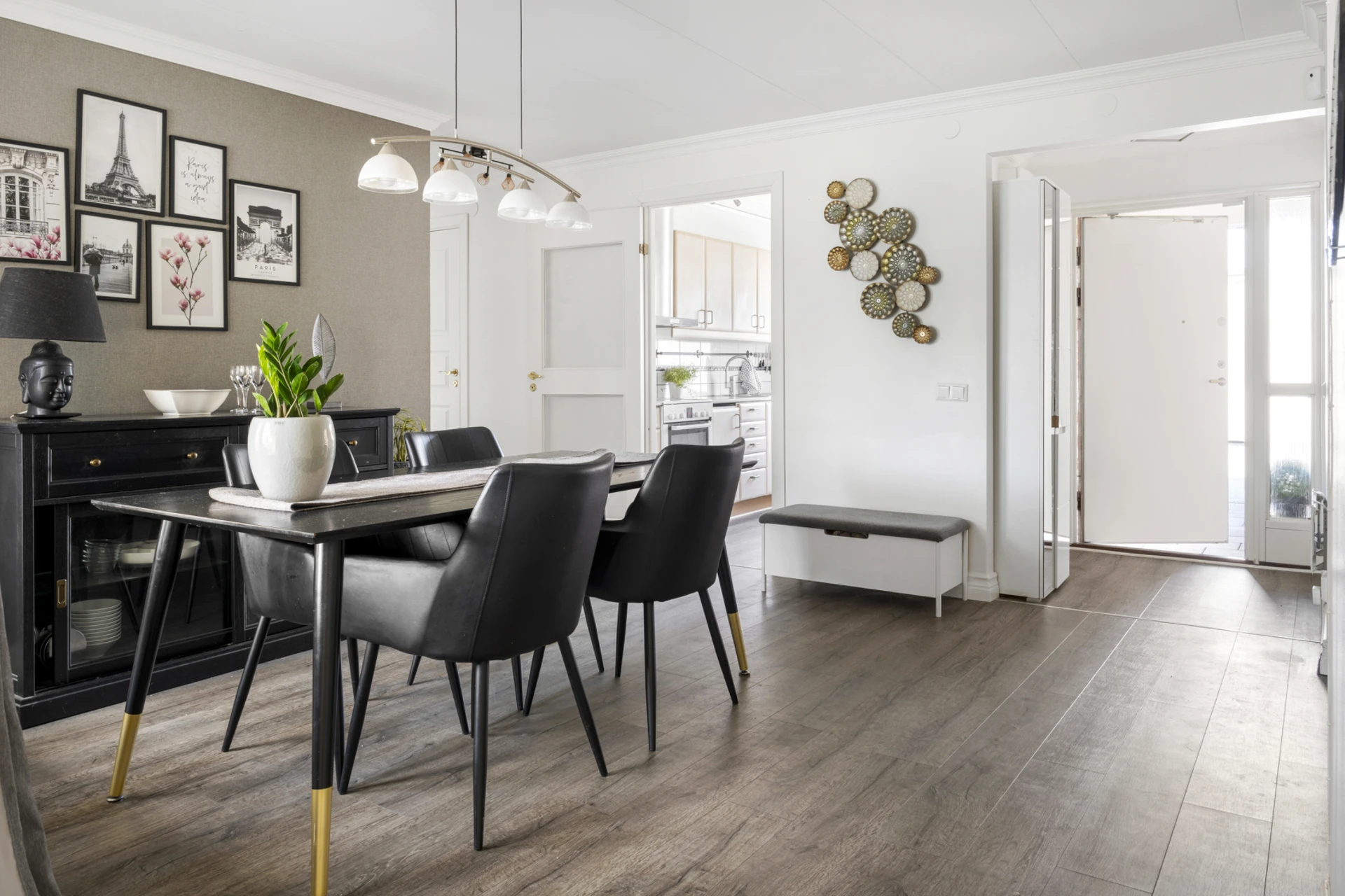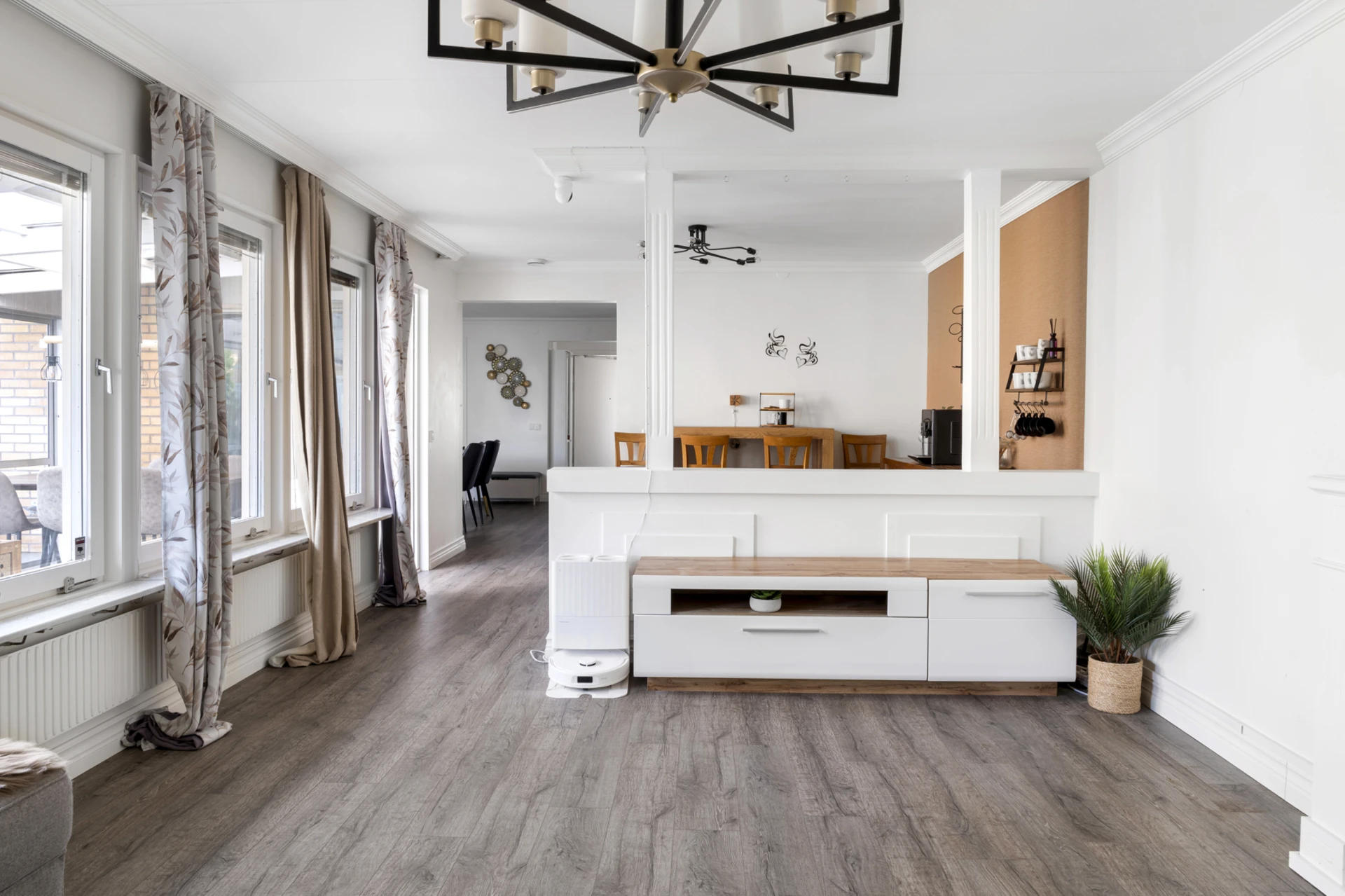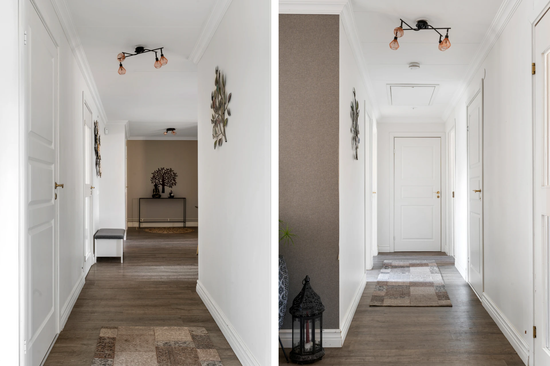 Mörkt laminatgolv och ljusa väggar.