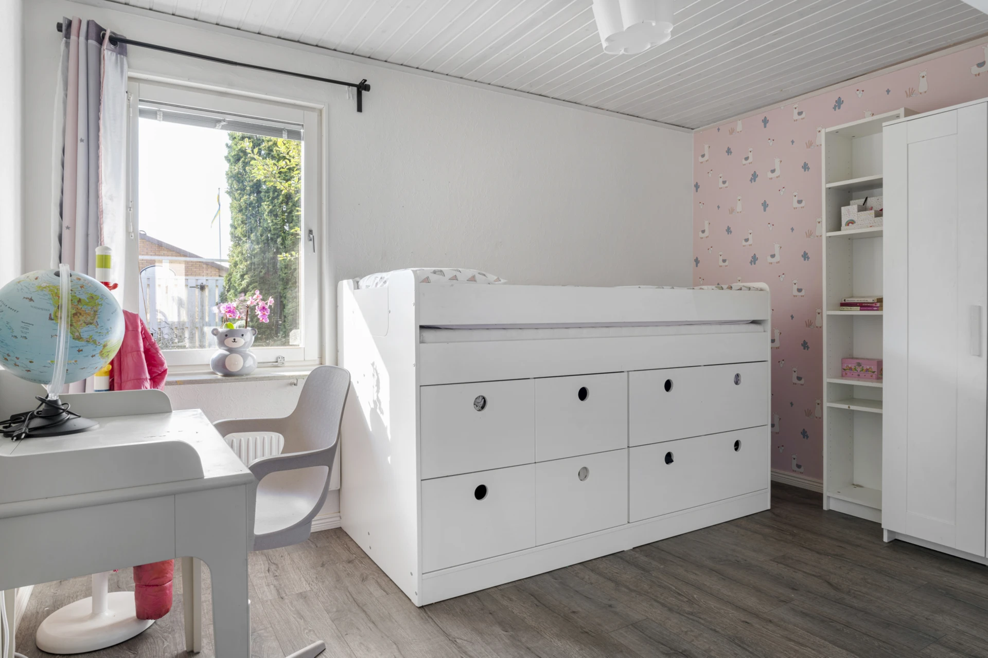 Mörkt laminatgolv och ljusa väggar med rosa fondvägg.