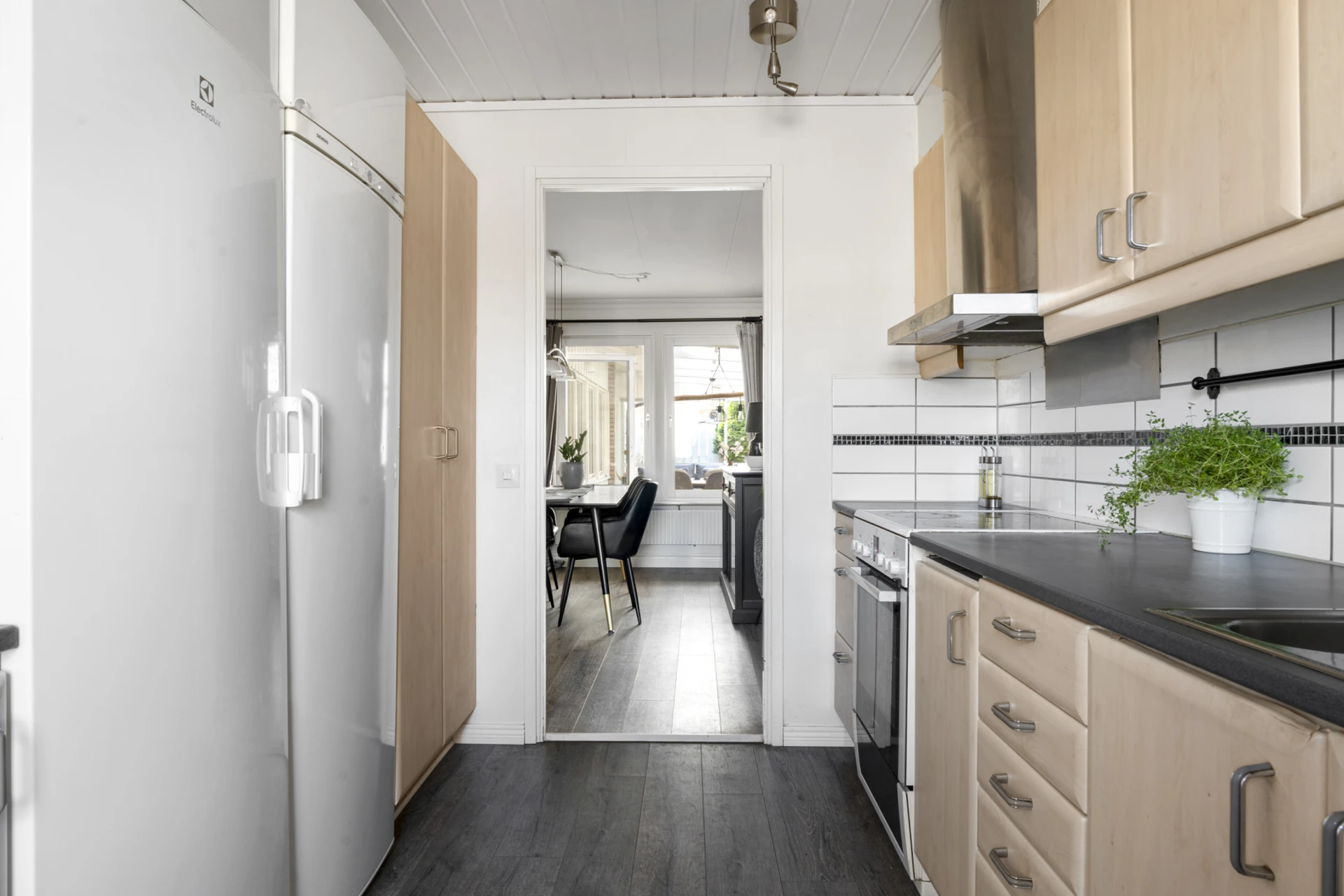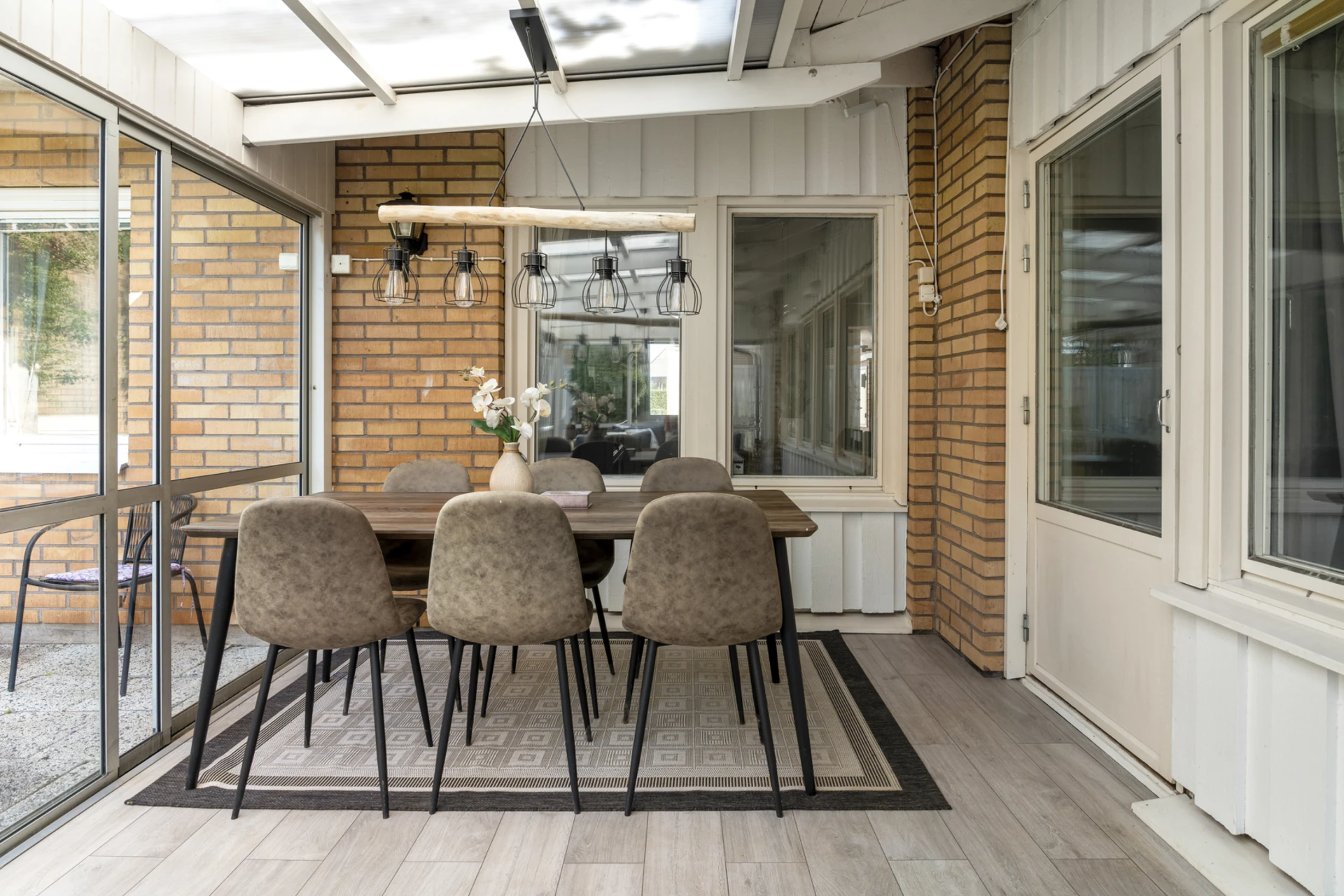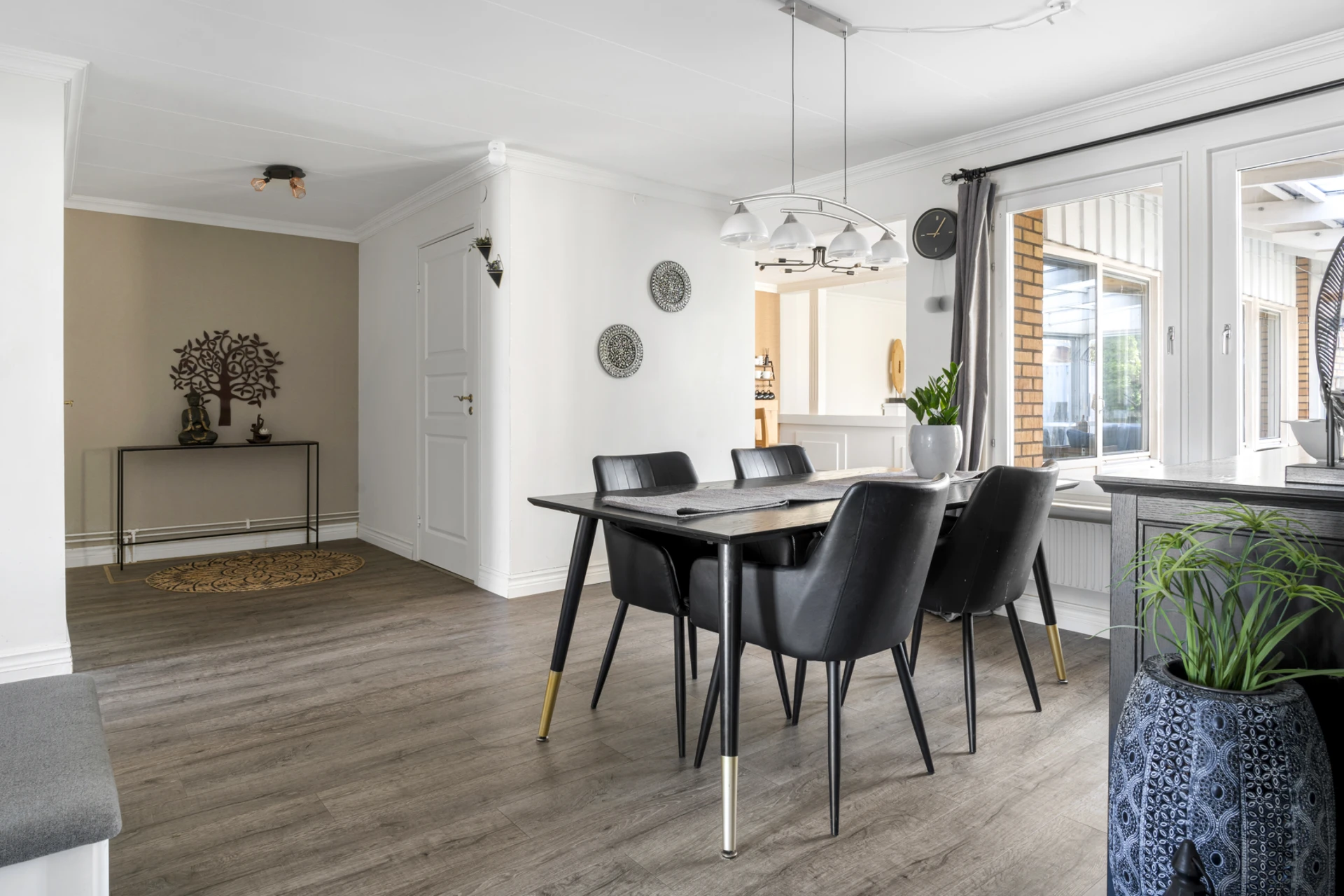 Mörkt laminatgolv och ljusa väggar. Utgång till uterum.
