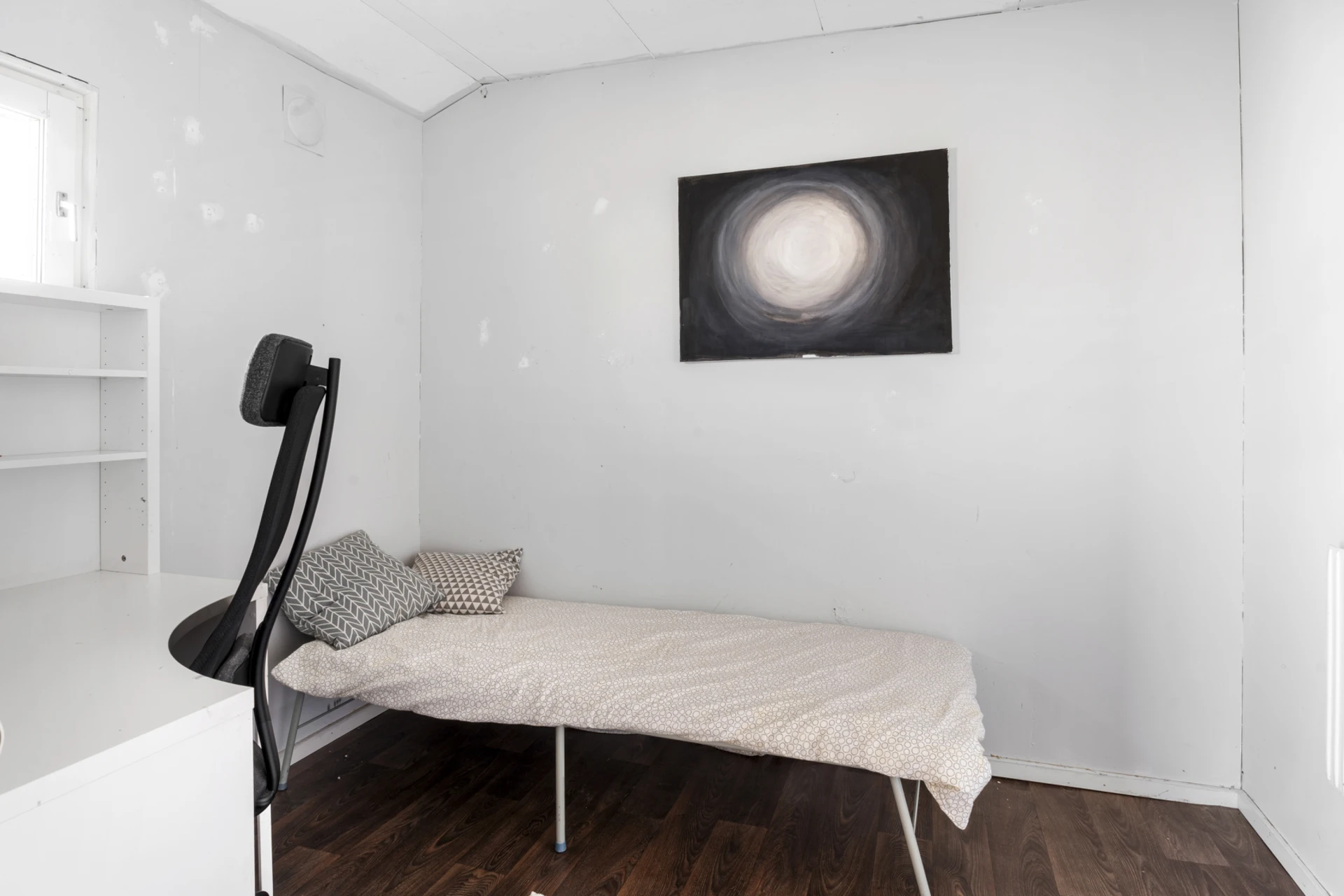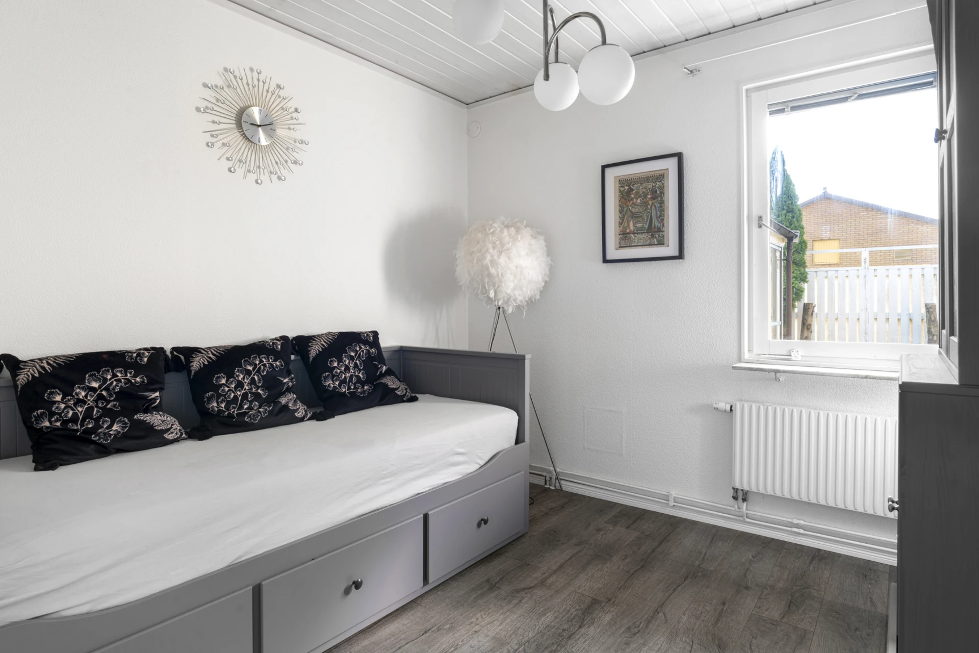 Mörkt laminatgolv och ljusa väggar. Bra avhängningsmöjlighet.