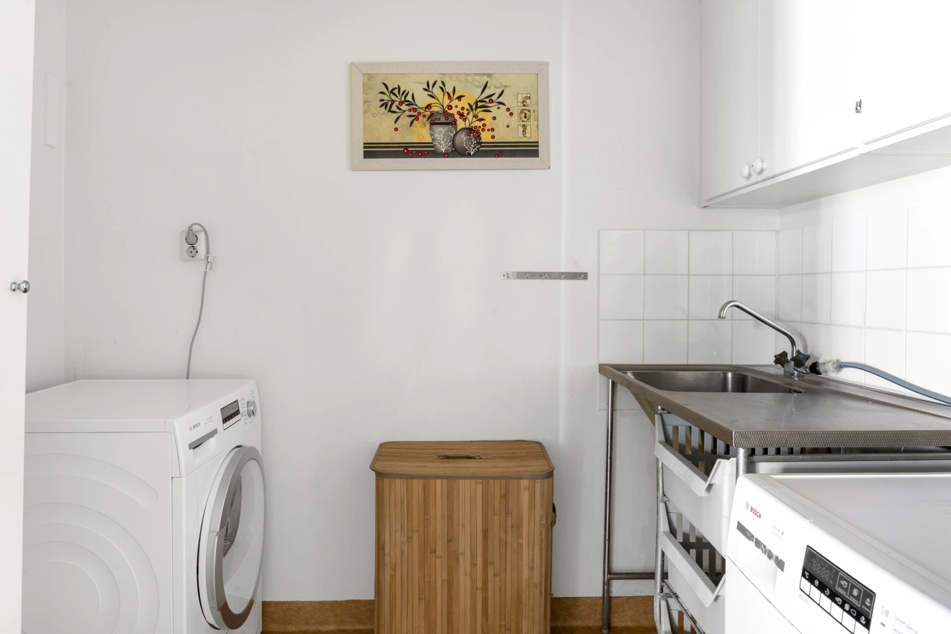 Våtrumsmatta och målade väggar. Inrett med en praktisk arbetsyta med vask och förvaring genom skåp. Utrustad med tvättmaskin och torktumlare.