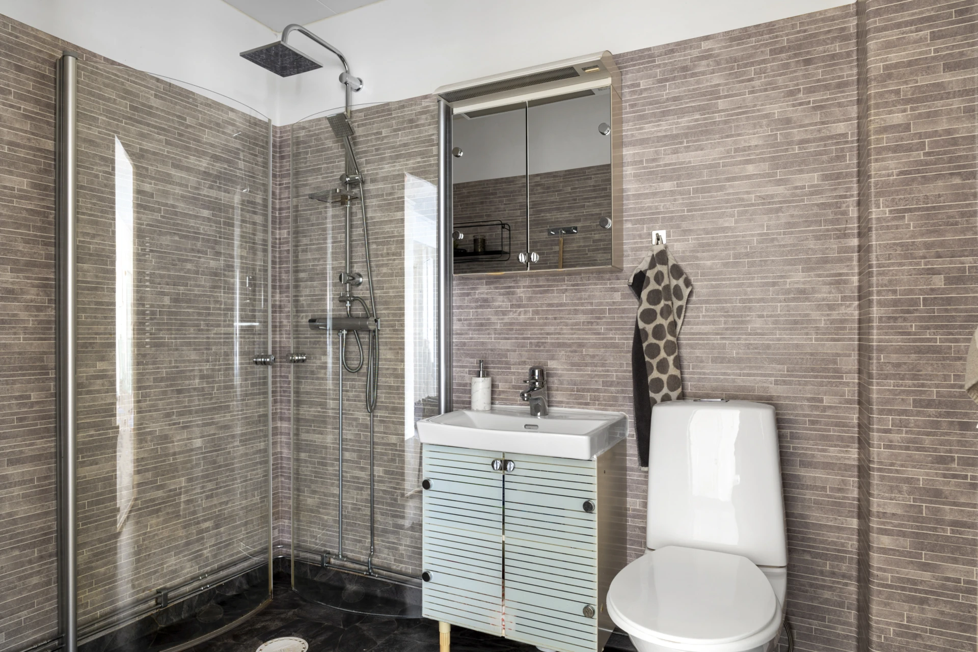 Mörk våtrumsmatta på golvet och ljus våtrumstapet. Utrustat med handfat med kommod, spegelskåp, WC samt dusch med glasdörrar och takdusch.