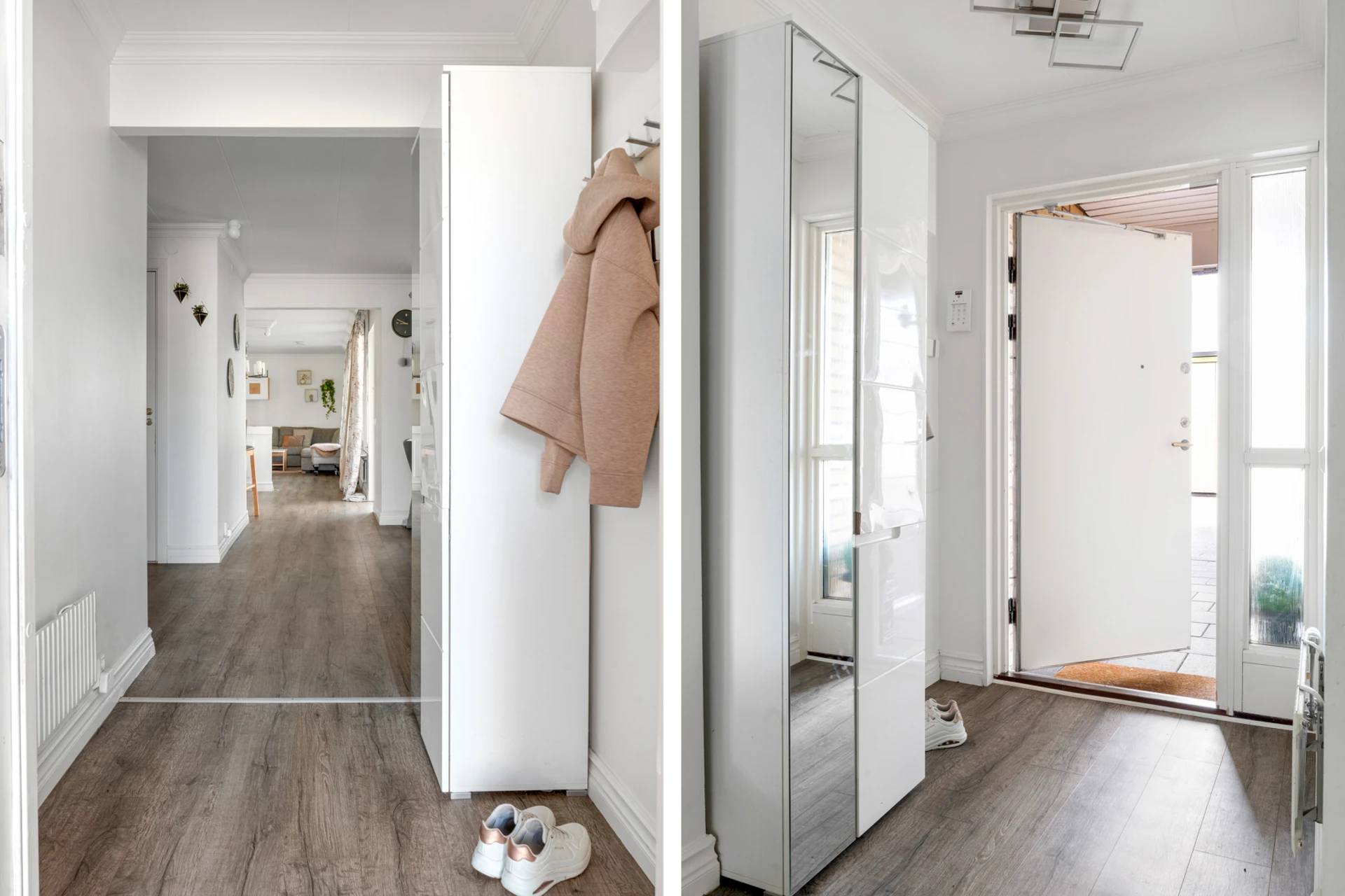 Mörkt laminatgolv och ljusa väggar. Garderober.