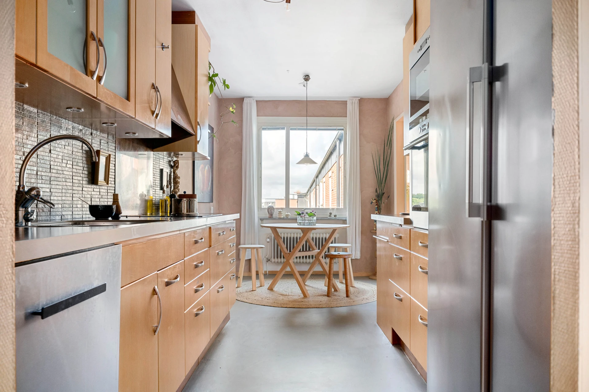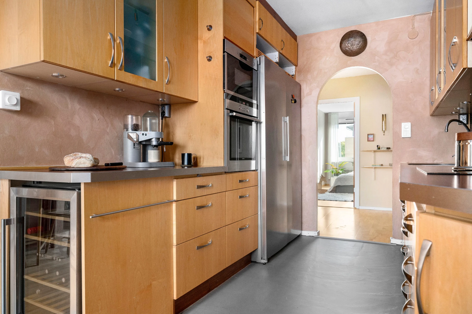 Köket renoverades 2006 och erbjuder bra arbetsytor samt plats för matbord. Utrustat med kyl och frys i fullhöjd, ugn, diskmaskin och vinkyl. Ljusa skåpsluckor och en arbetsbänk i mörkt trälaminat med stavmosaik ovanför. Fläktkåpa i mässing.