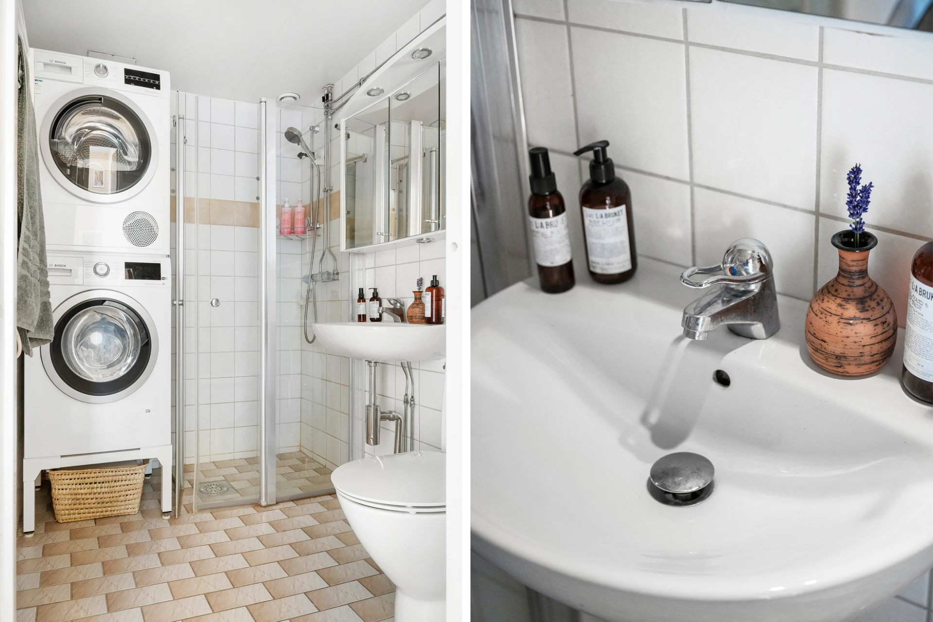 Ljus klinker och vitt kakel. Badrummet är inrett med dusch, WC, handfat, spegelskåp med inbyggd belysning samt kombinerad tvättmaskin och torktumlare.