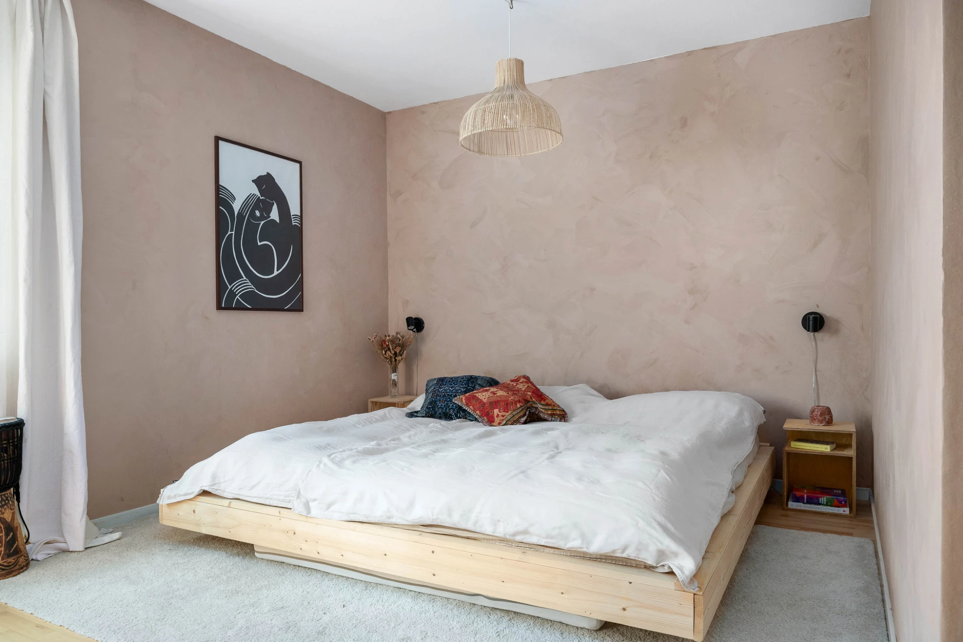 Ljus ekparkett och vita väggar, inbyggd förvaring. Fönster vetter ut mot öst med fönsterbräde i marmorerad sten.